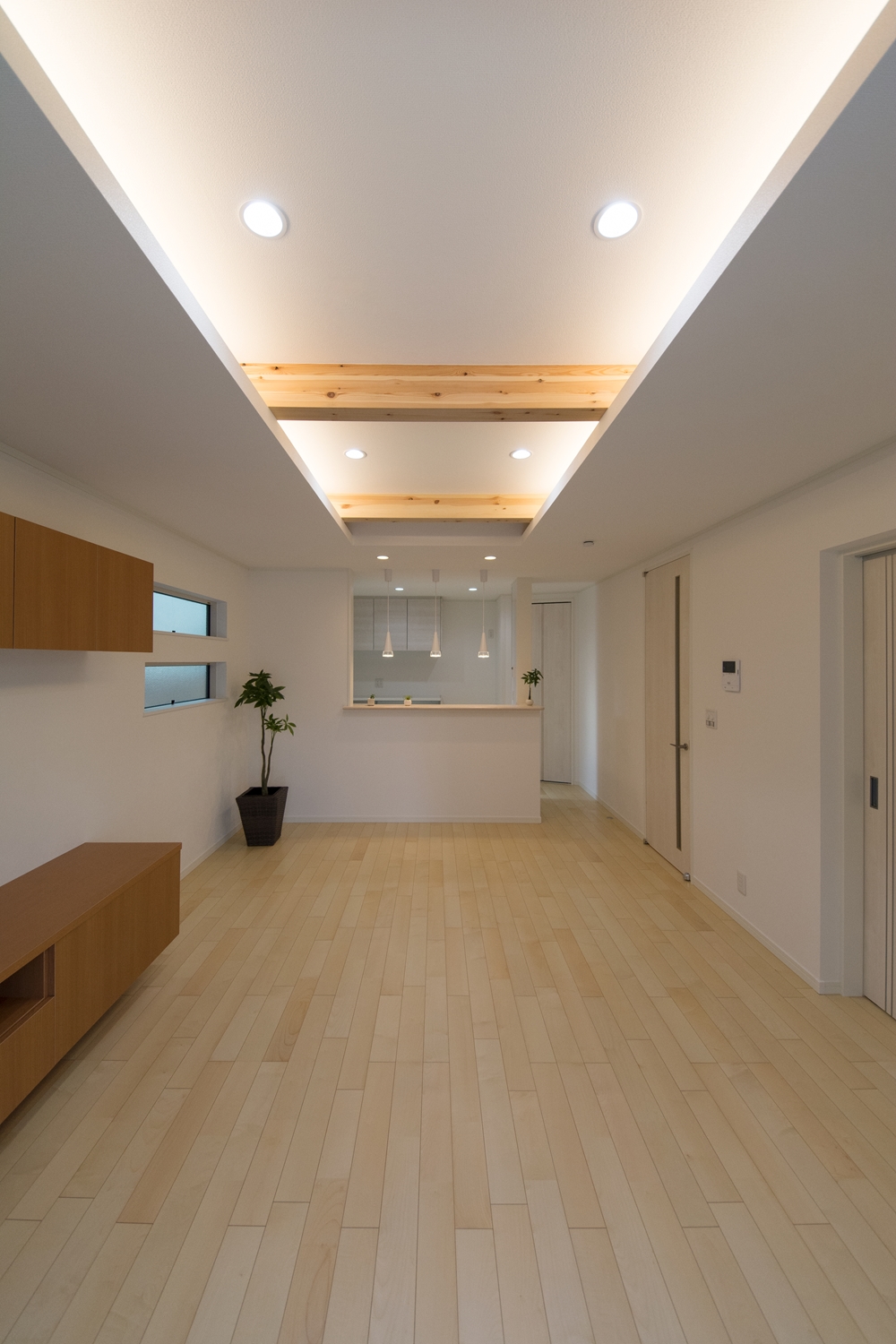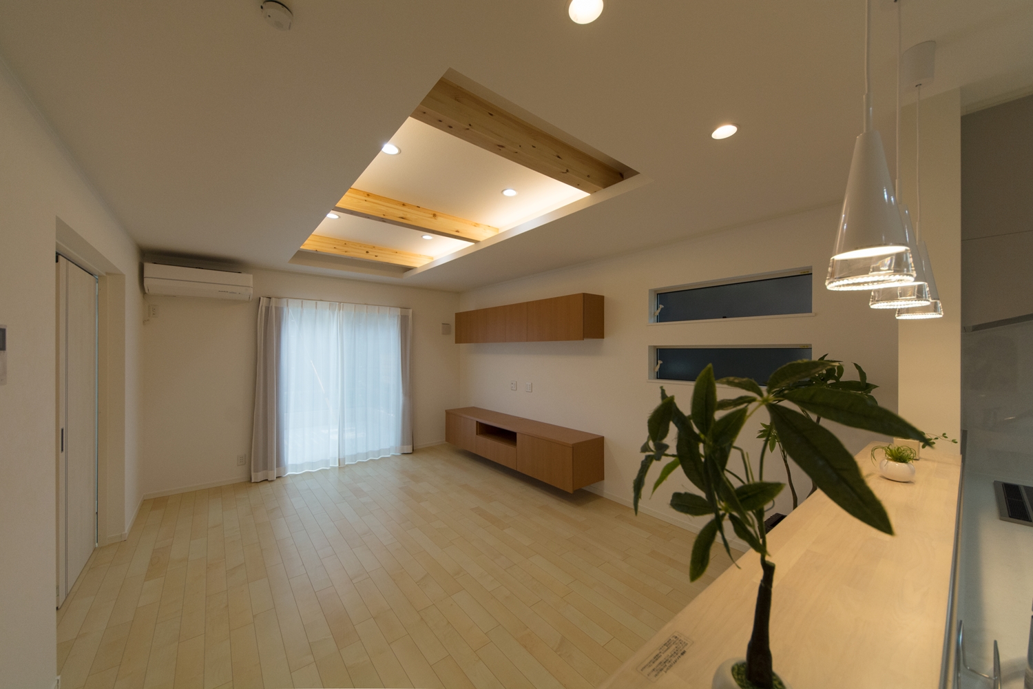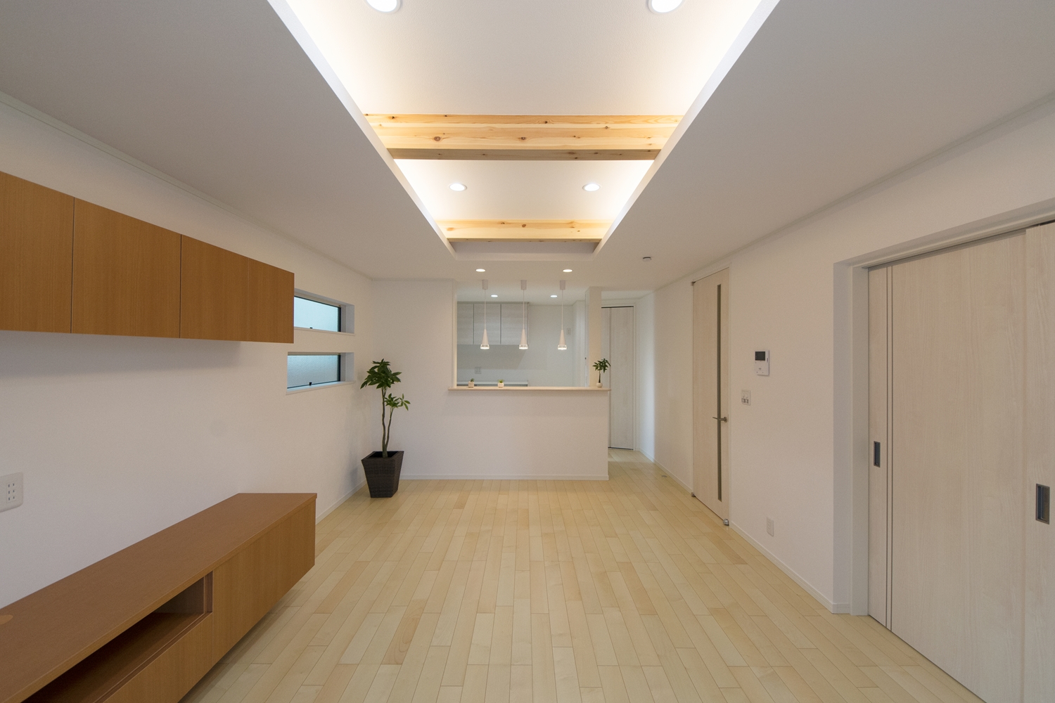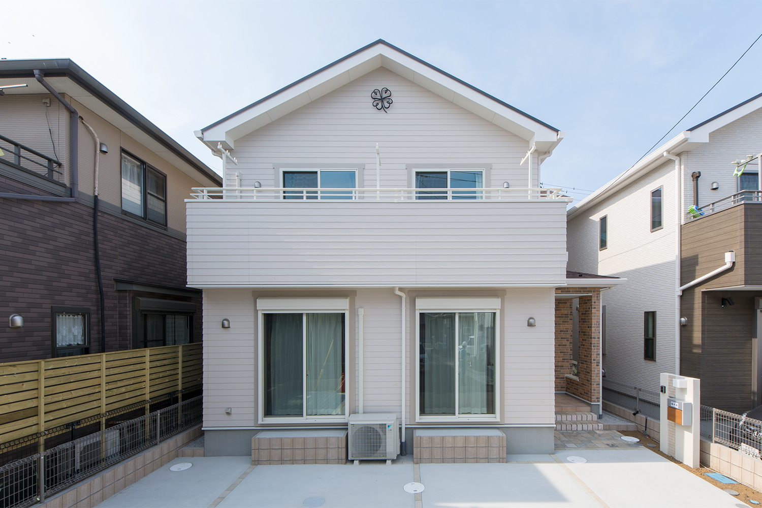 白い壁に、幸運の象徴「四葉クローバー」のオーナメントを施し、玄関周りをレンガ調サイディングでアクセントにした温かみのある可愛らしいデザインの外観。リビングには折り上げ天井を設え広々と開放的、家族がのびのびと幸せに過ごせる空間です。