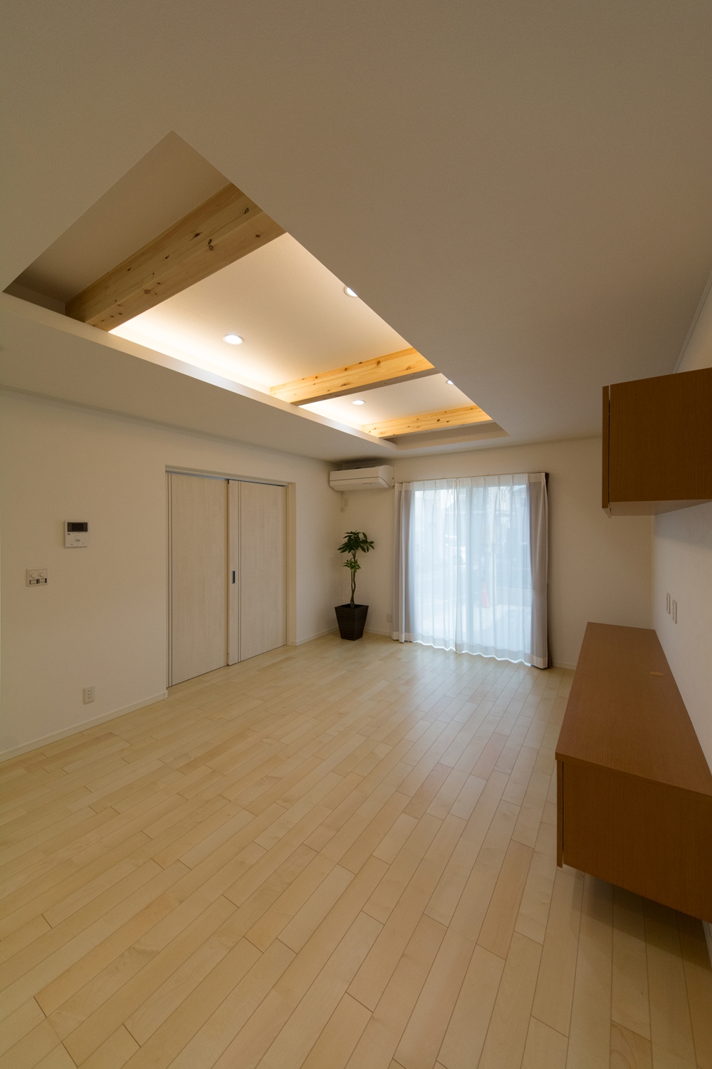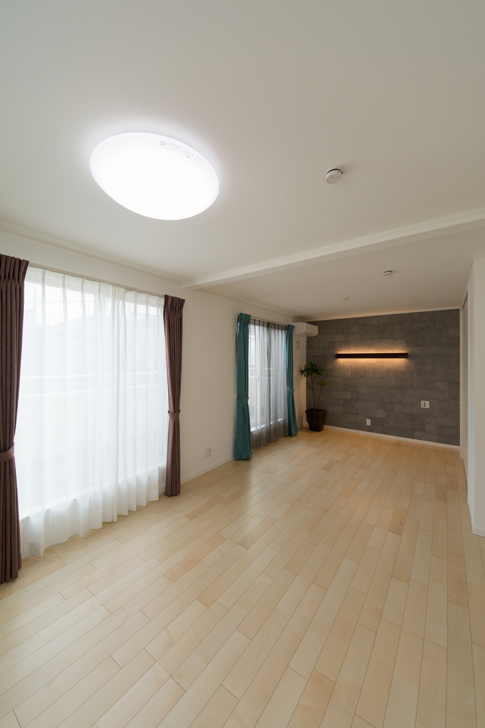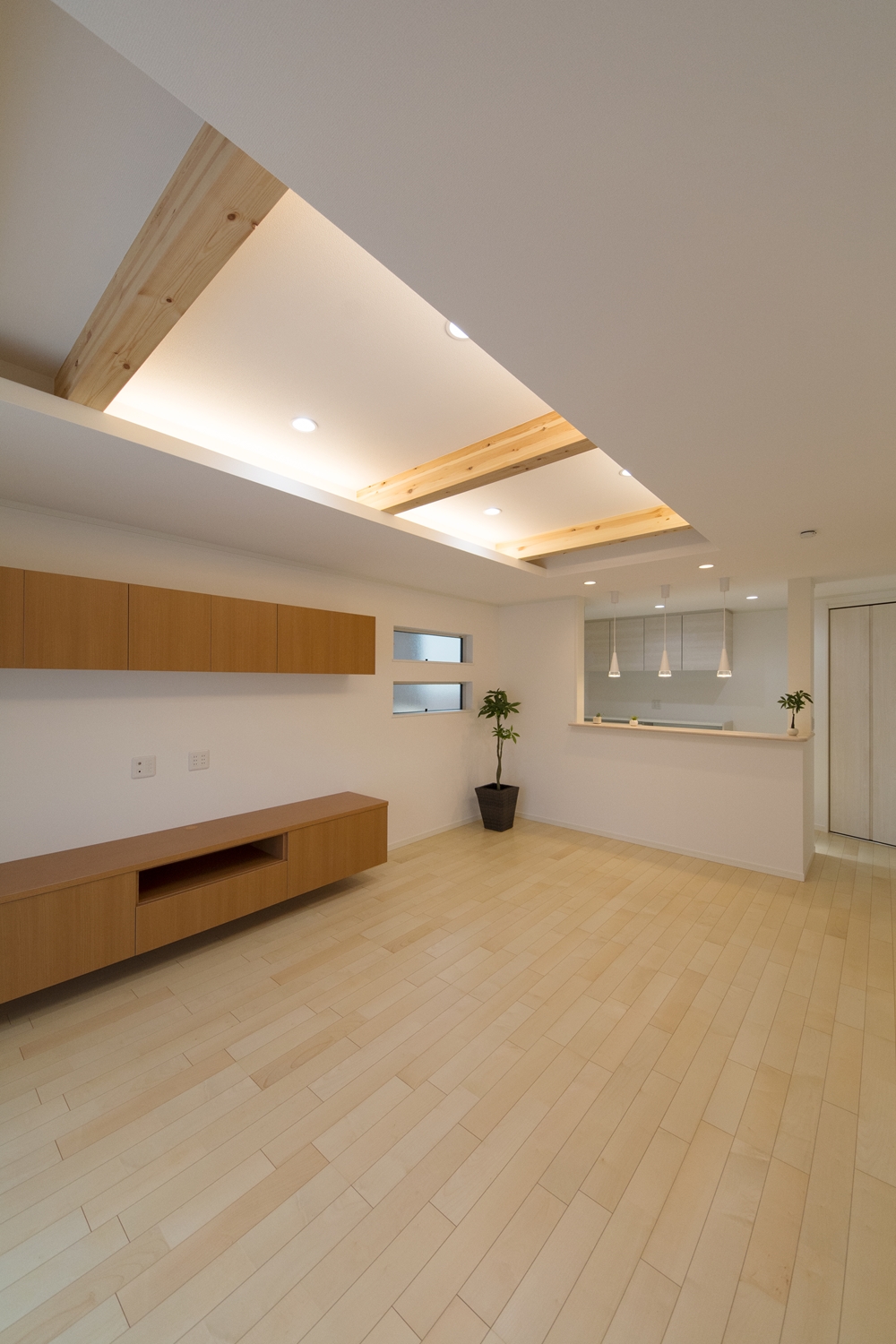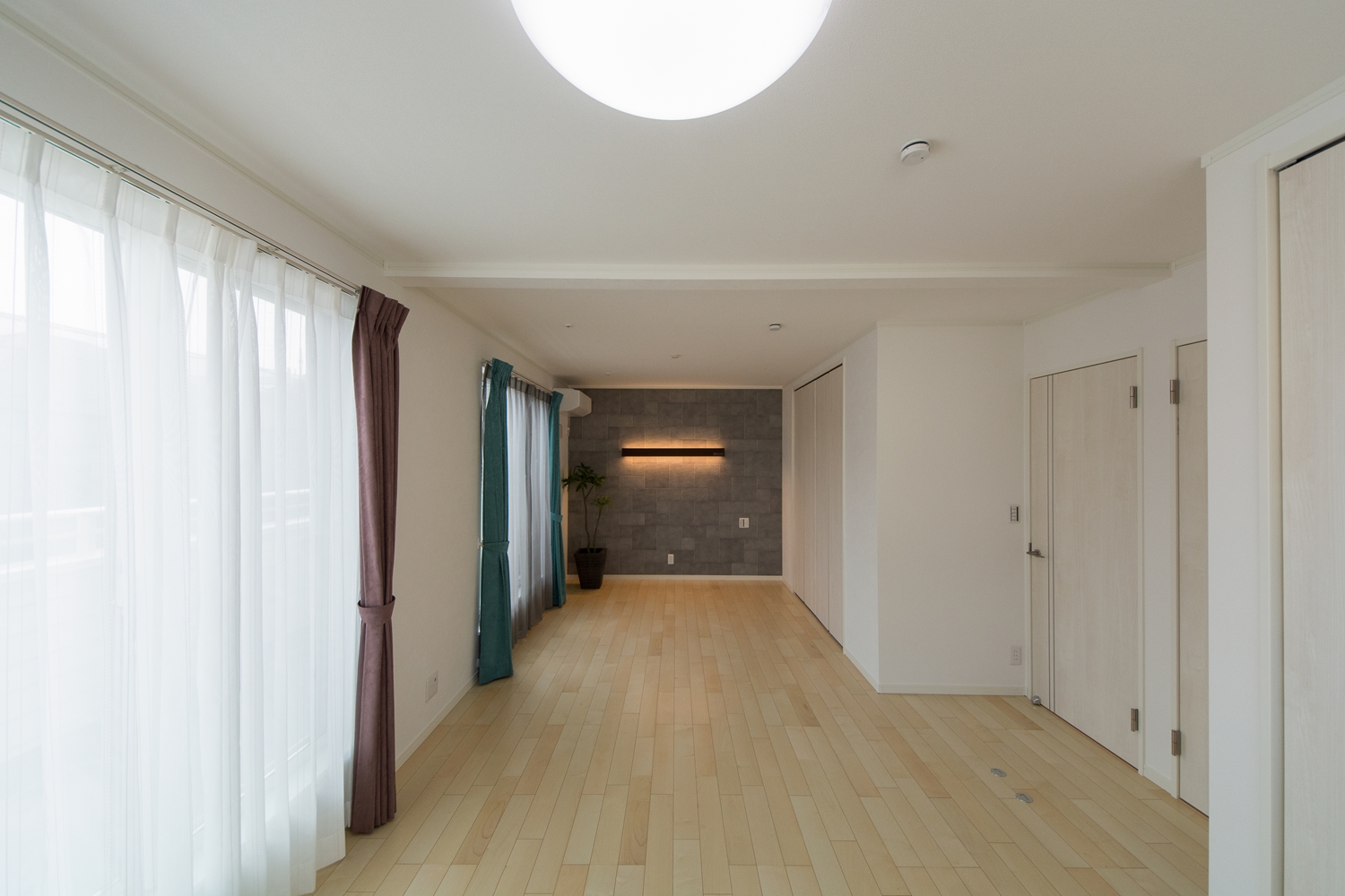 白い壁に、幸運の象徴「四葉クローバー」のオーナメントを施し、玄関周りをレンガ調サイディングでアクセントにした温かみのある可愛らしいデザインの外観。リビングには折り上げ天井を設え広々と開放的、家族がのびのびと幸せに過ごせる空間です。