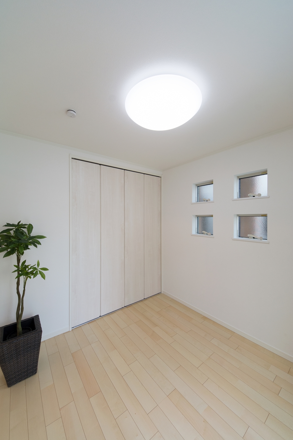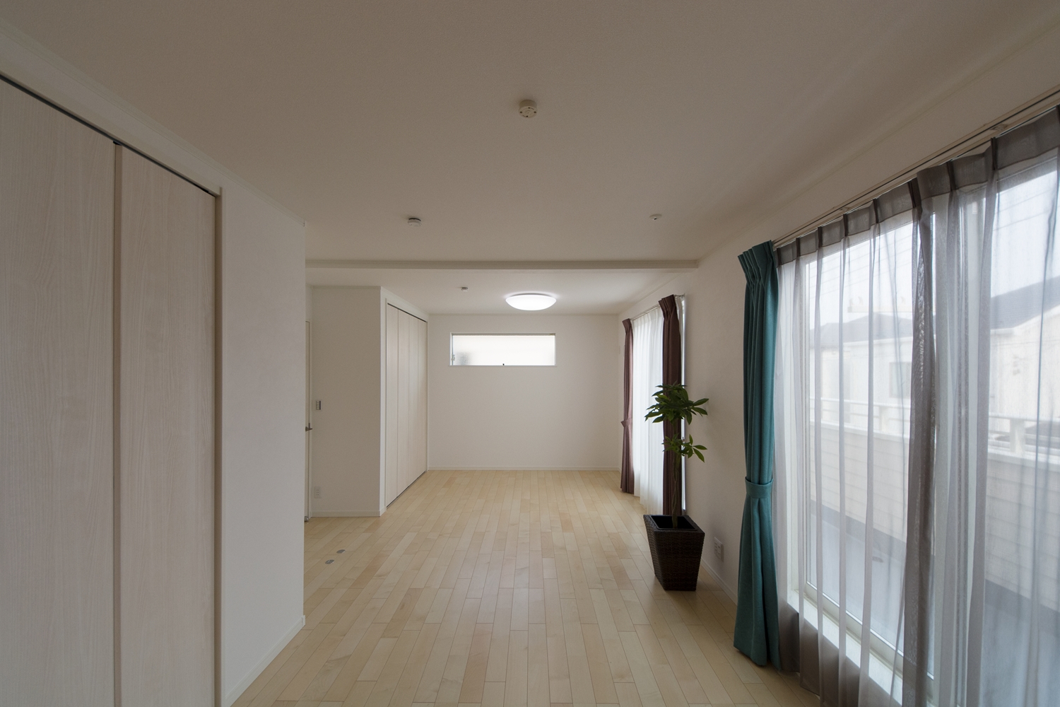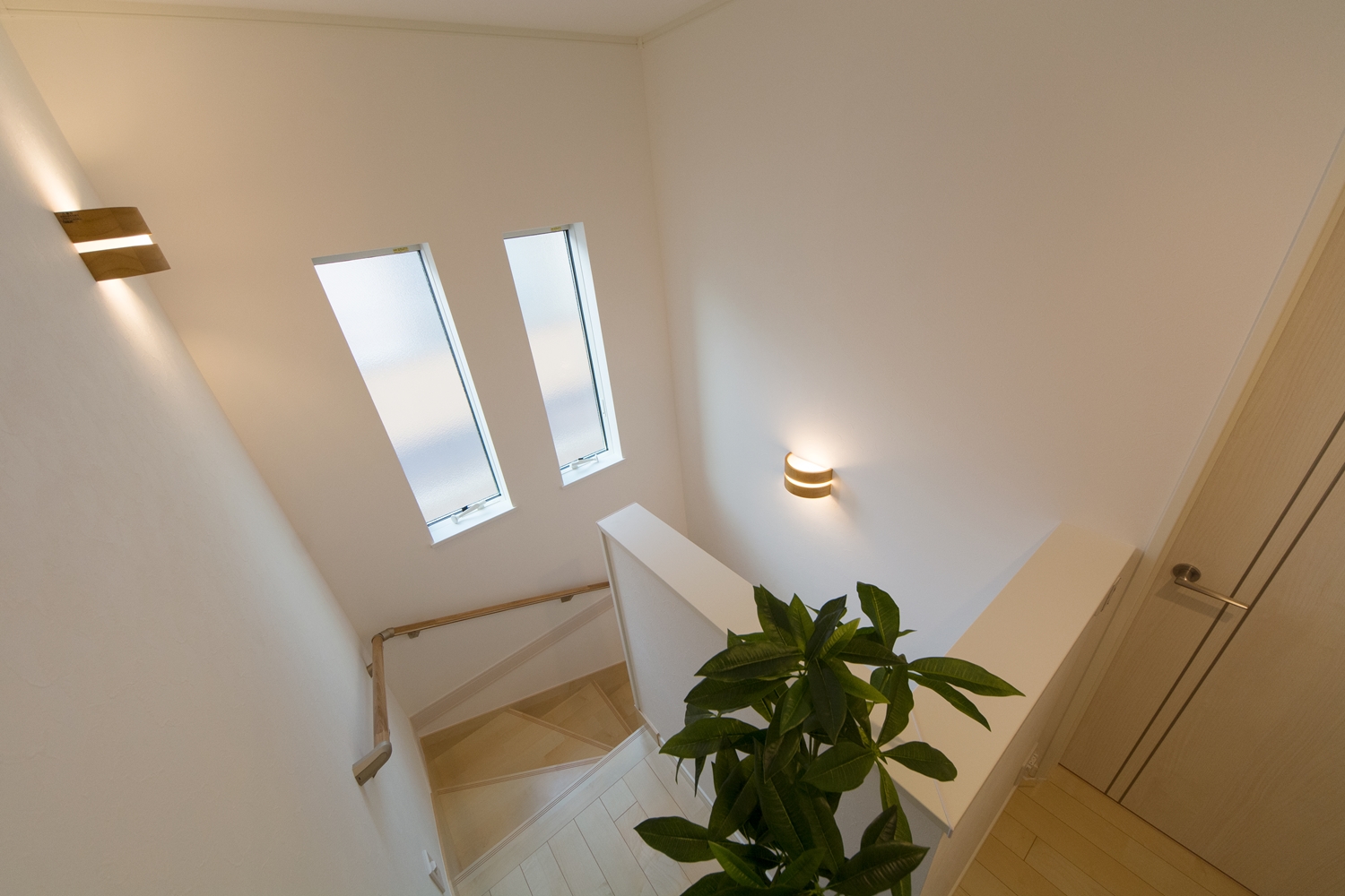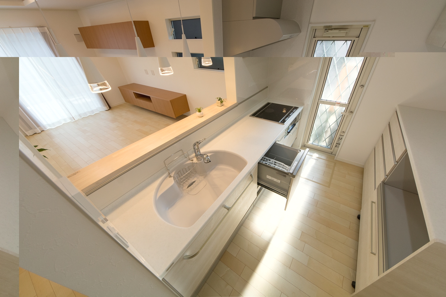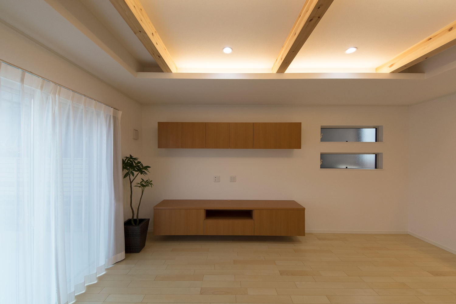白い壁に、幸運の象徴「四葉クローバー」のオーナメントを施し、玄関周りをレンガ調サイディングでアクセントにした温かみのある可愛らしいデザインの外観。リビングには折り上げ天井を設え広々と開放的、家族がのびのびと幸せに過ごせる空間です。