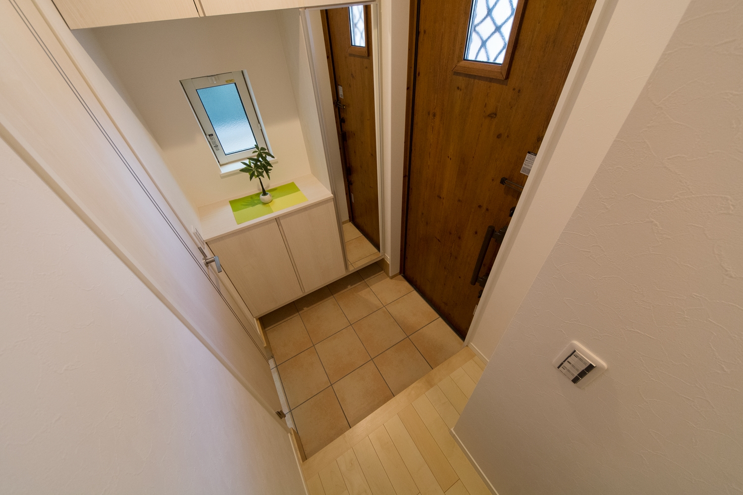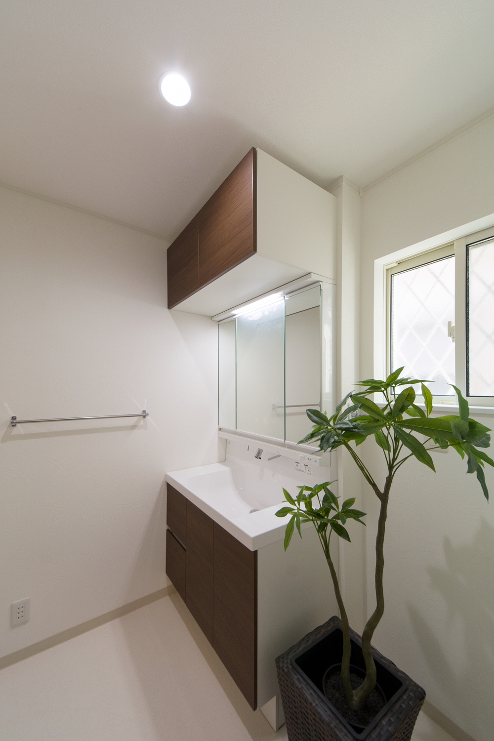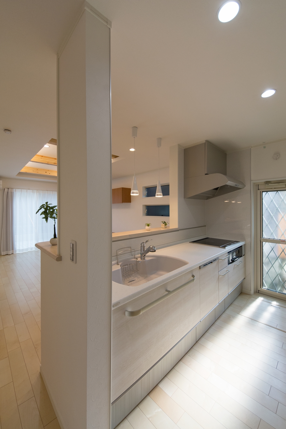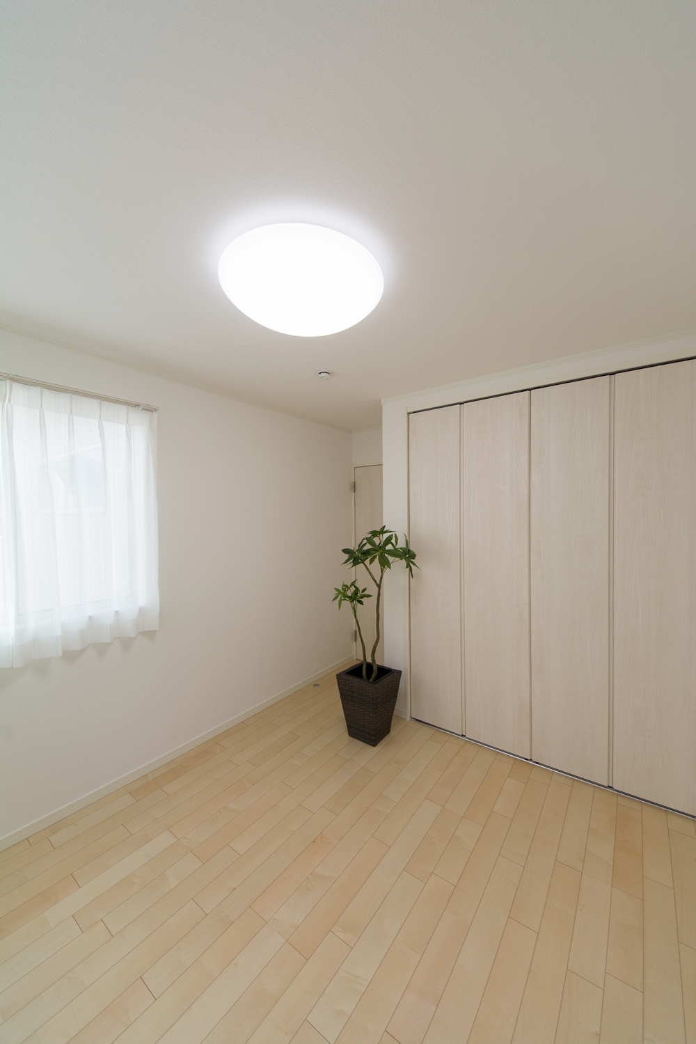 白い壁に、幸運の象徴「四葉クローバー」のオーナメントを施し、玄関周りをレンガ調サイディングでアクセントにした温かみのある可愛らしいデザインの外観。リビングには折り上げ天井を設え広々と開放的、家族がのびのびと幸せに過ごせる空間です。