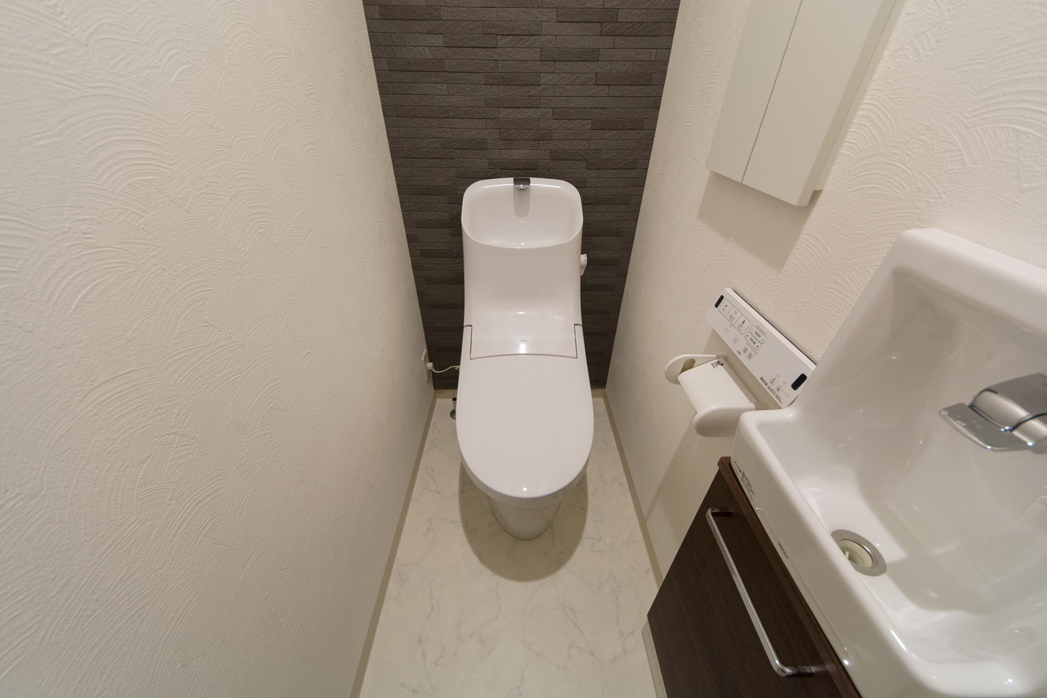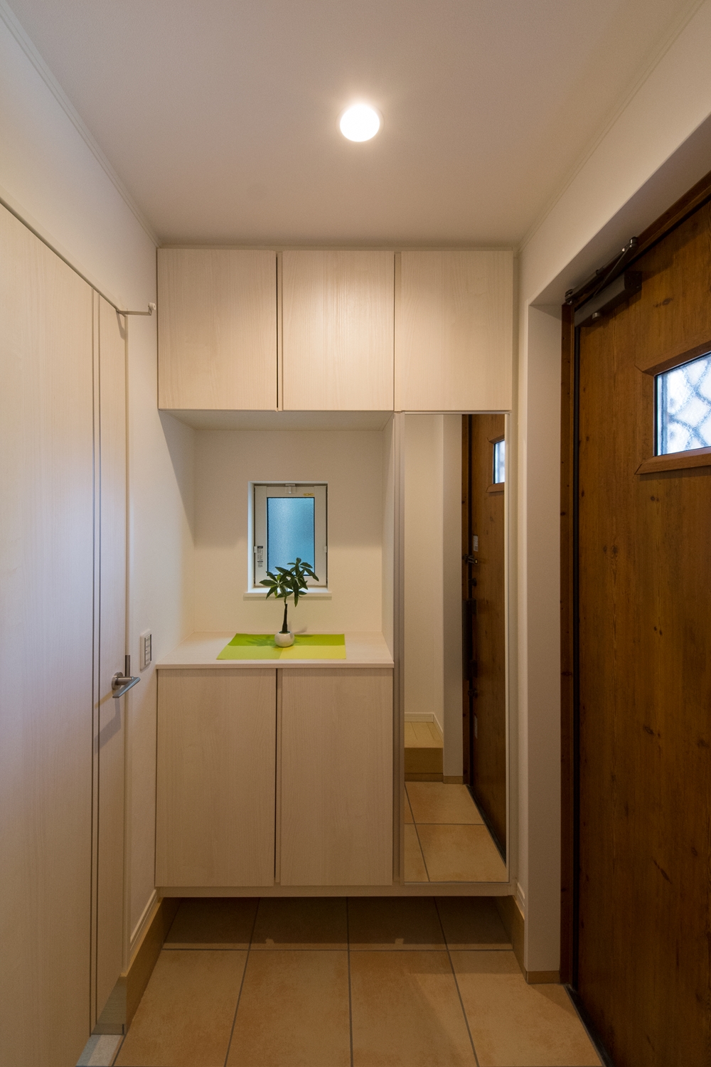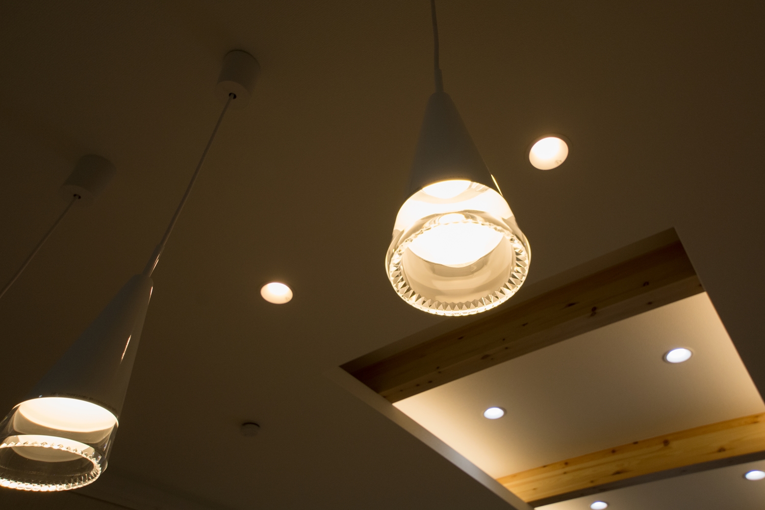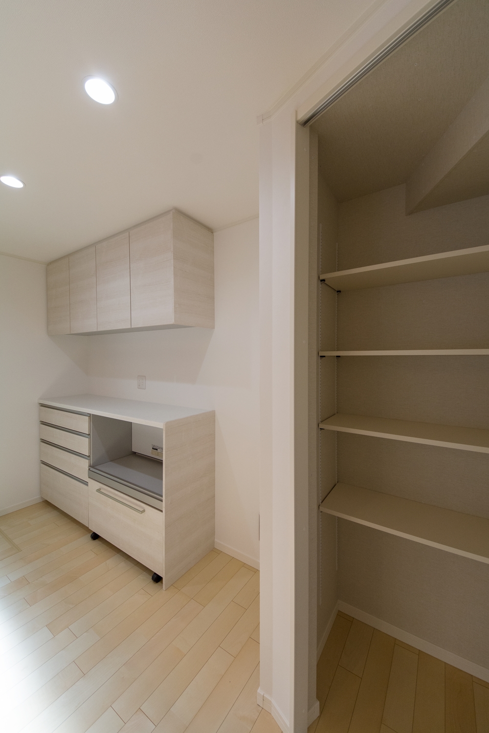 白い壁に、幸運の象徴「四葉クローバー」のオーナメントを施し、玄関周りをレンガ調サイディングでアクセントにした温かみのある可愛らしいデザインの外観。リビングには折り上げ天井を設え広々と開放的、家族がのびのびと幸せに過ごせる空間です。