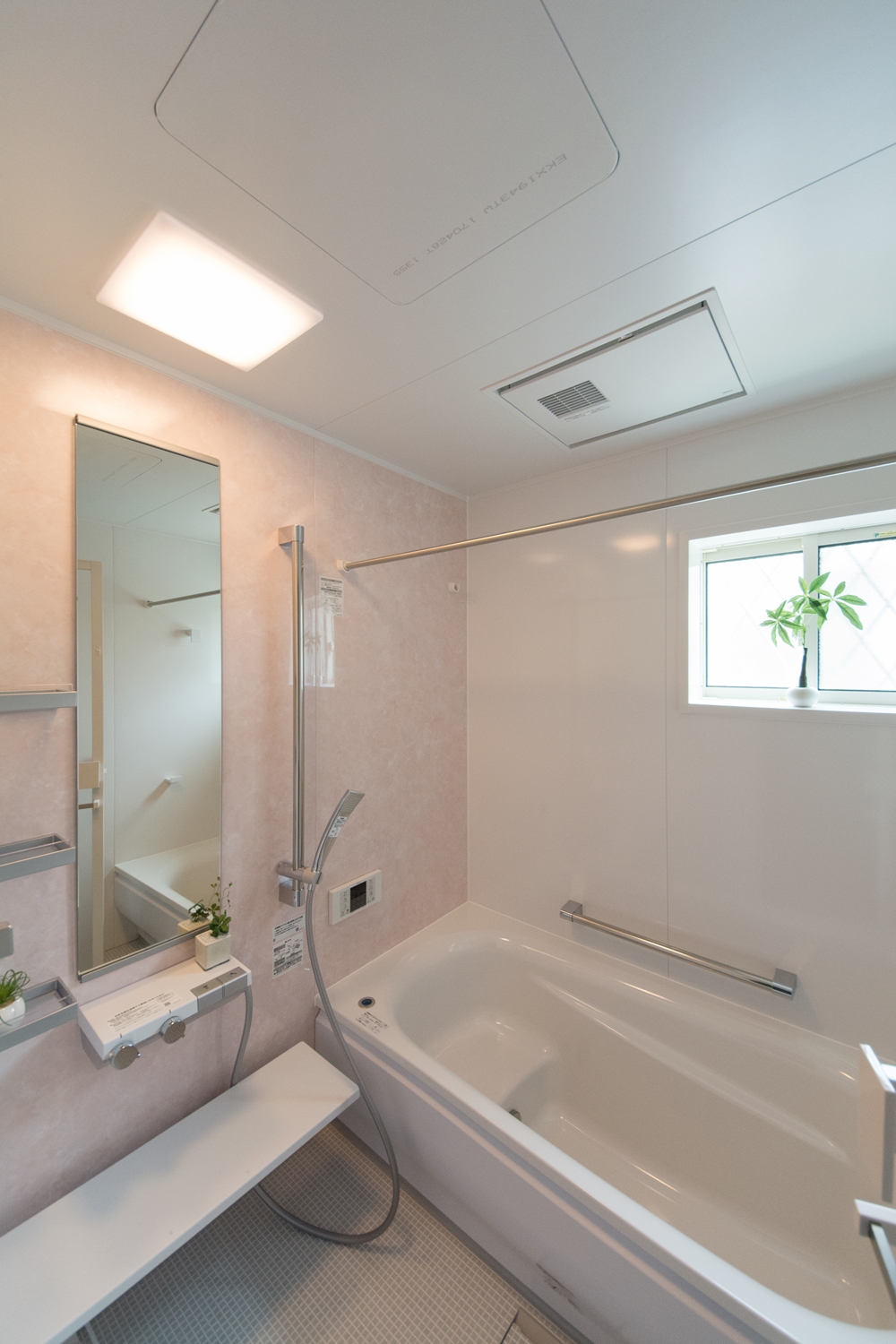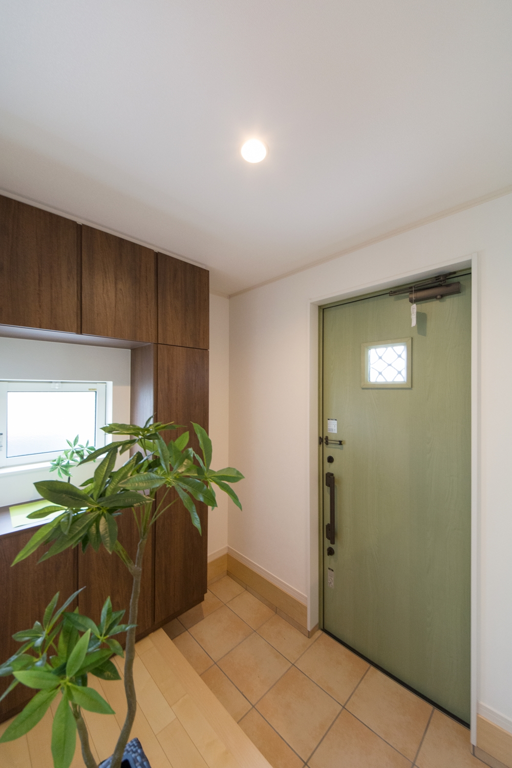 白と桃色のレンガ調サイディングを上下で張り分けし、爽やかなグリーンの玄関ドアがファサードを彩る、あたたかみのあるナチュラルな外観デザイン。壁とドアに施したオーナメントが個性を演出します。