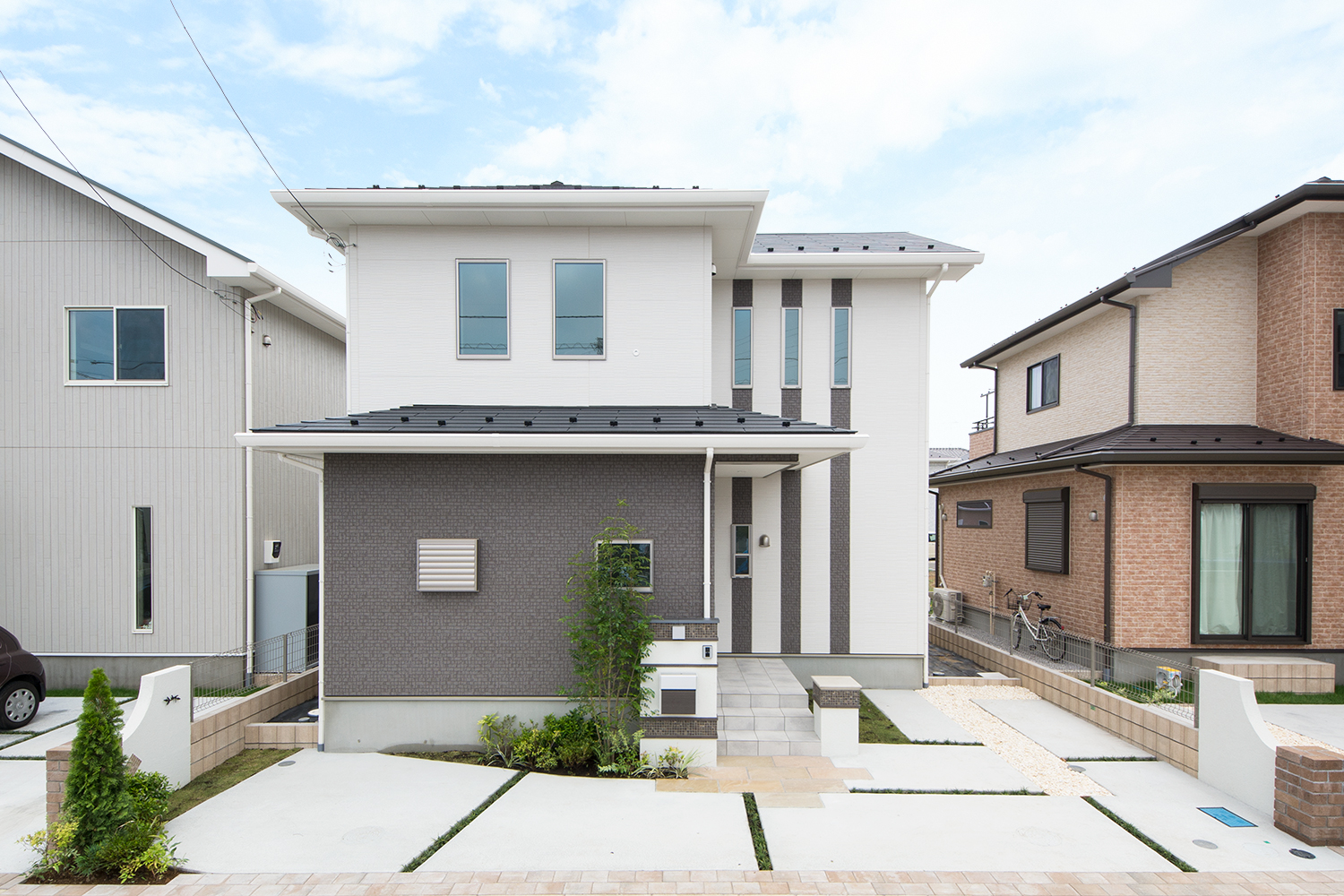 海外の国旗のようなデザインが魅力的 白×ブラウンのスタイリッシュモダンな外観