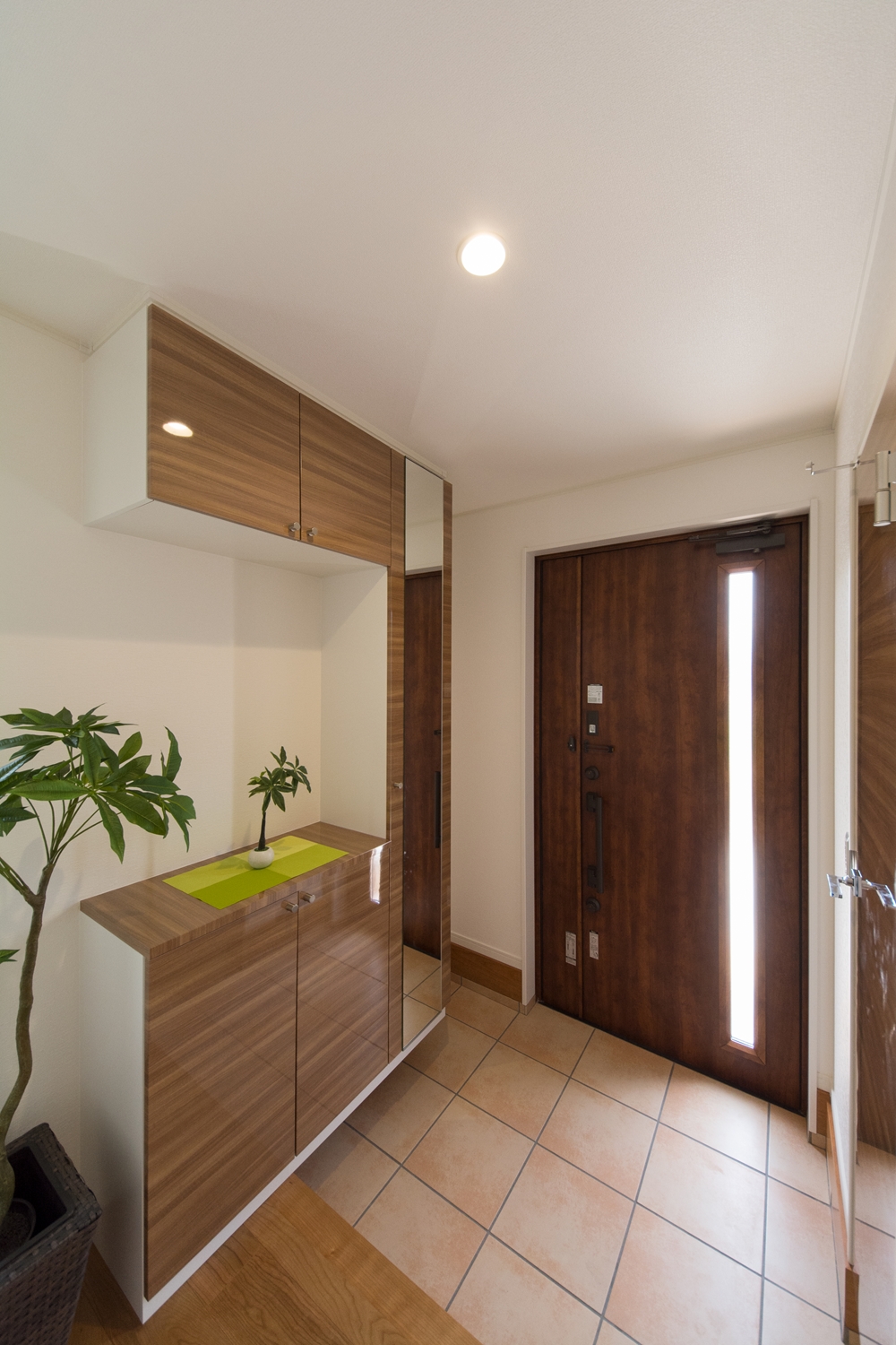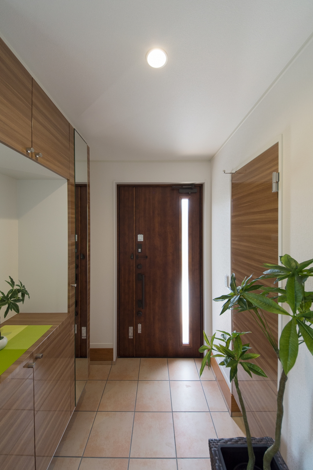 ゆとりのある玄関スペース。縦スリットから光が差し込み、開放的で明るい空間を演出。