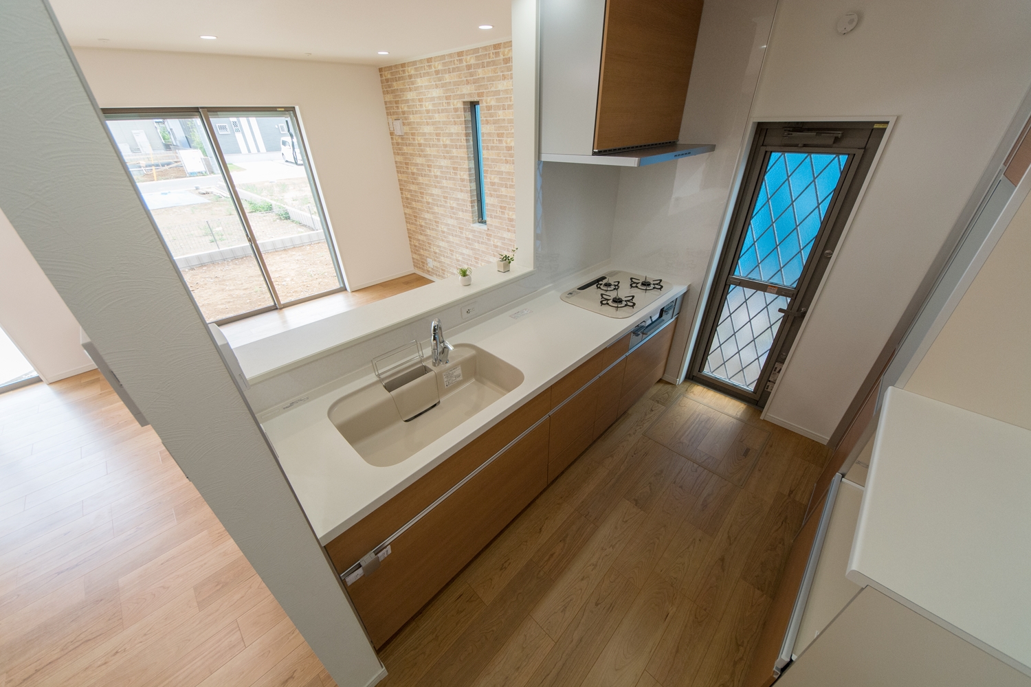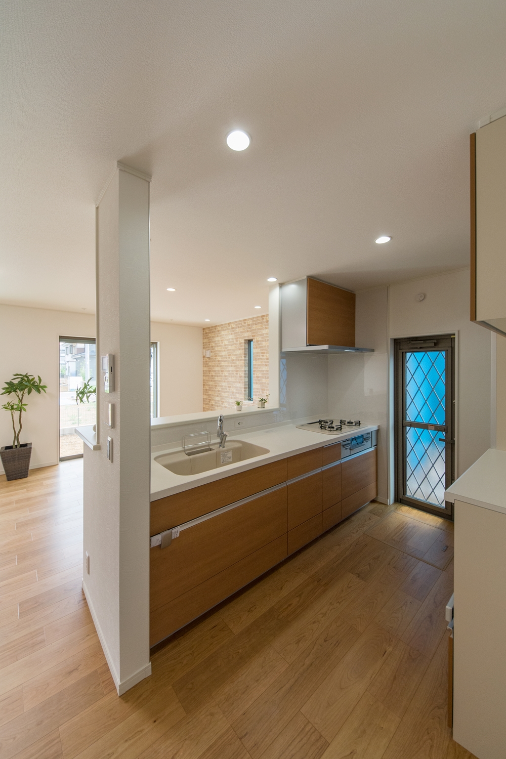 木のやさしい風合いの扉カラーで清潔感のあるキッチン。