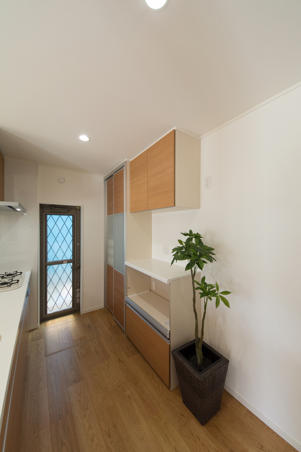 キッチン背面にはキッチンと同じ配色のカップボードを設置。
