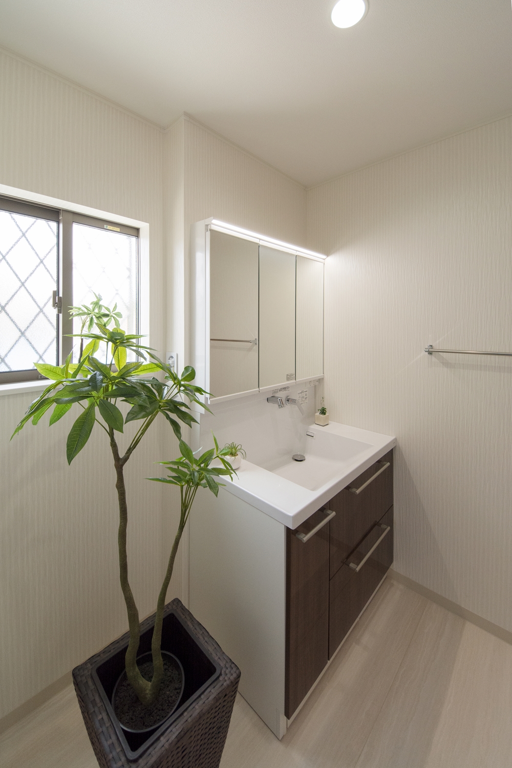 白を基調とした清潔感のあるサニタリールーム。木目調ブラウンの洗面化粧台がナチュラルな雰囲気を演出。