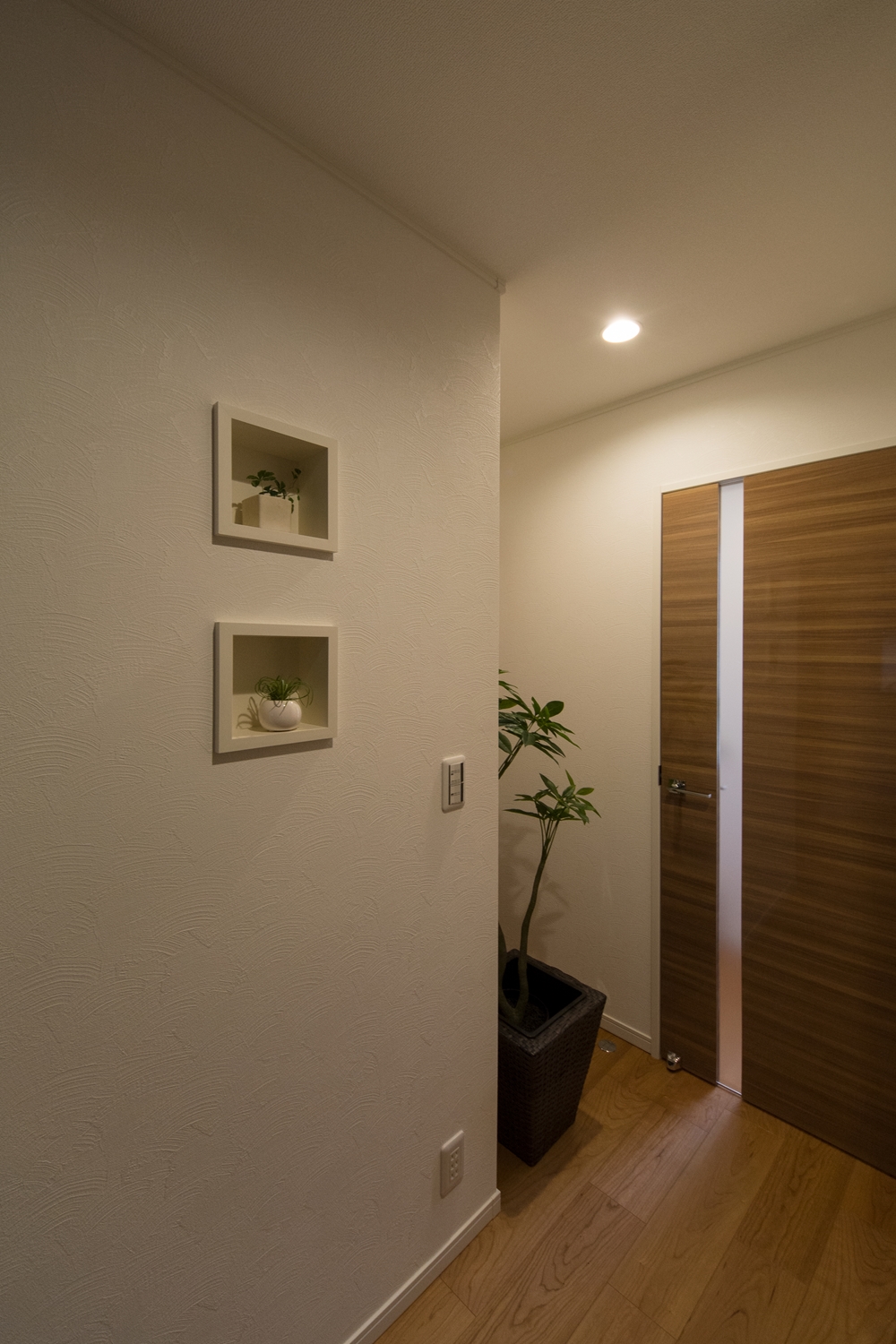 リビングにニッチカウンターを設置。小物などをおしゃれに飾ります。
