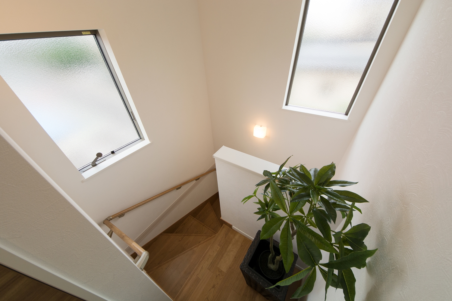 大きな窓で、通風も採光も良い開放感ある階段に。