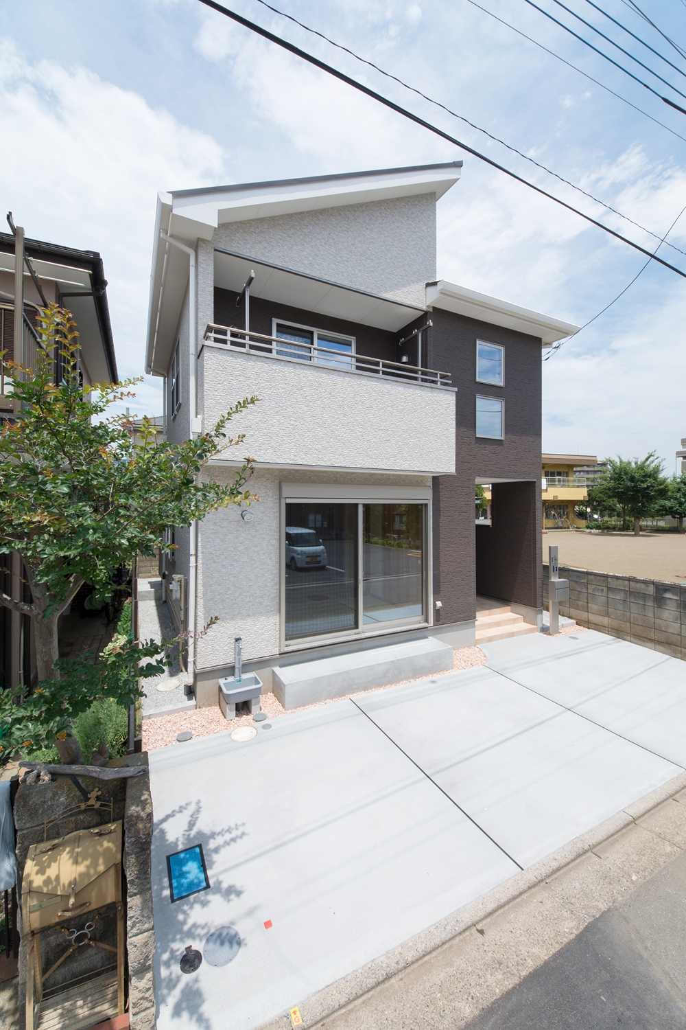 スタイリッシュな形&ナチュラルな配色 三角屋根と四角窓が印象的なデザインの外観