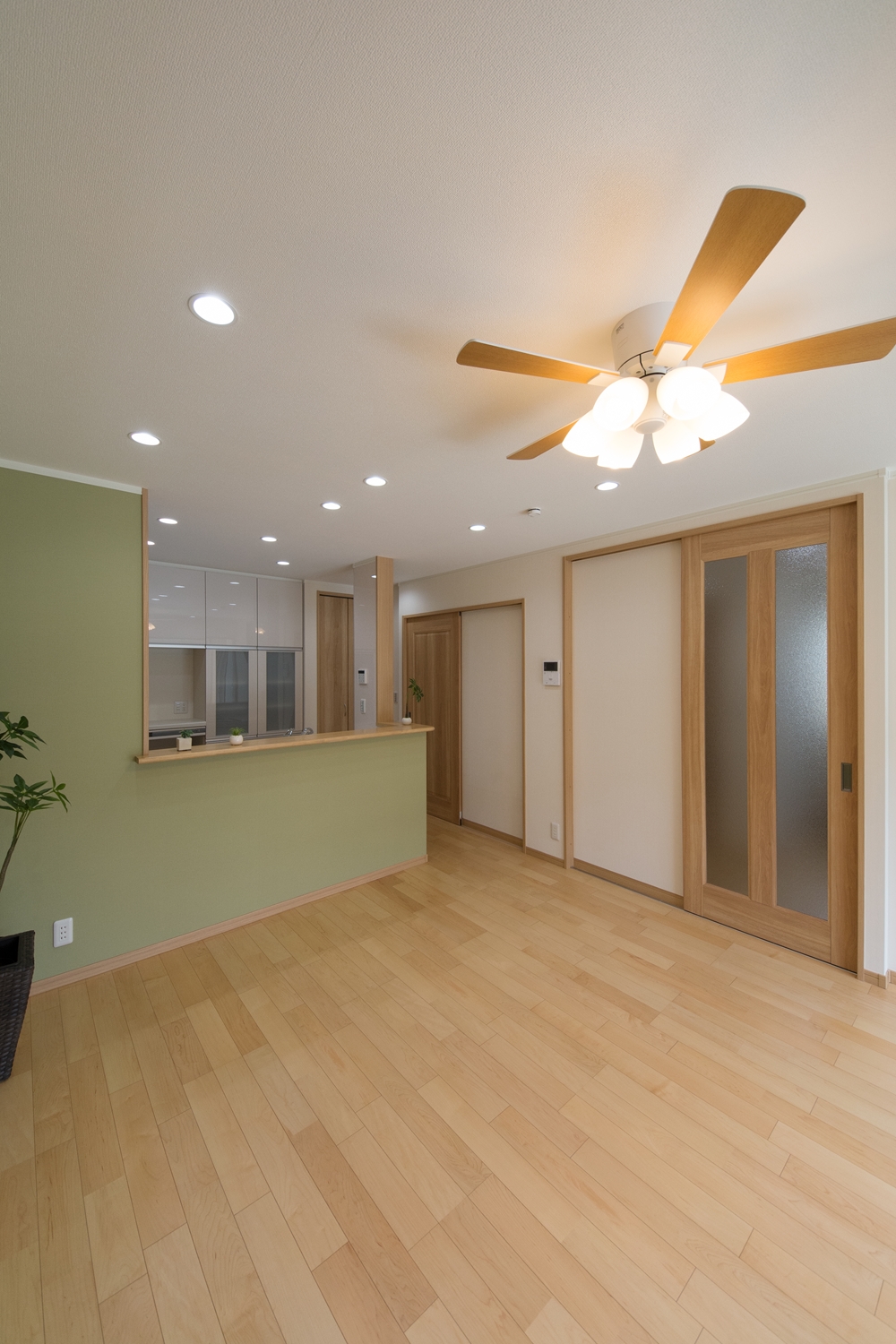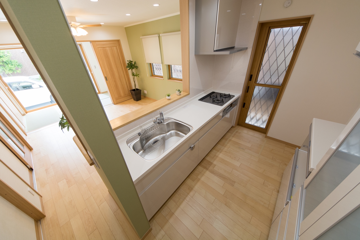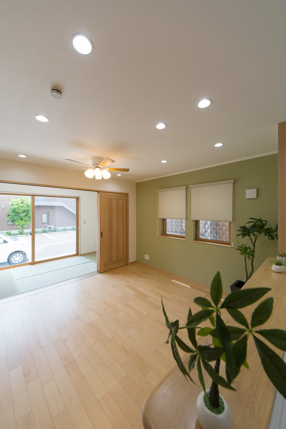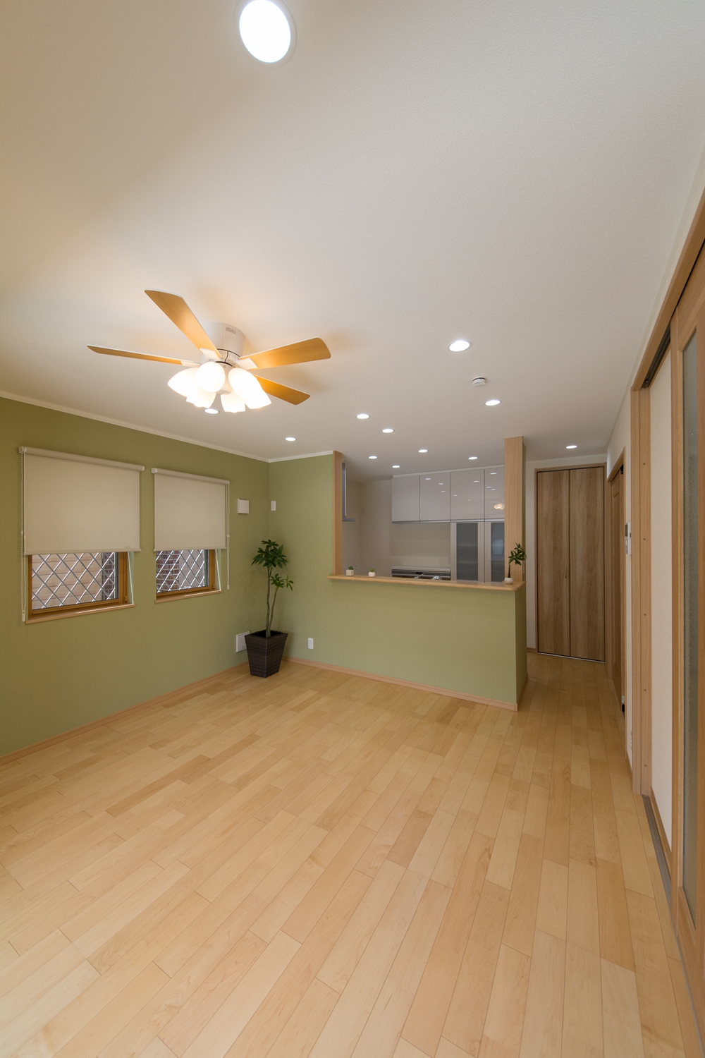 スタイリッシュな形とナチュラルな配色、三角屋根と四角窓が印象的な素敵なデザインの外観に仕上がりました。内装は爽やかなグリーン色のクロスがLDKを彩り、穏やかな空間です。