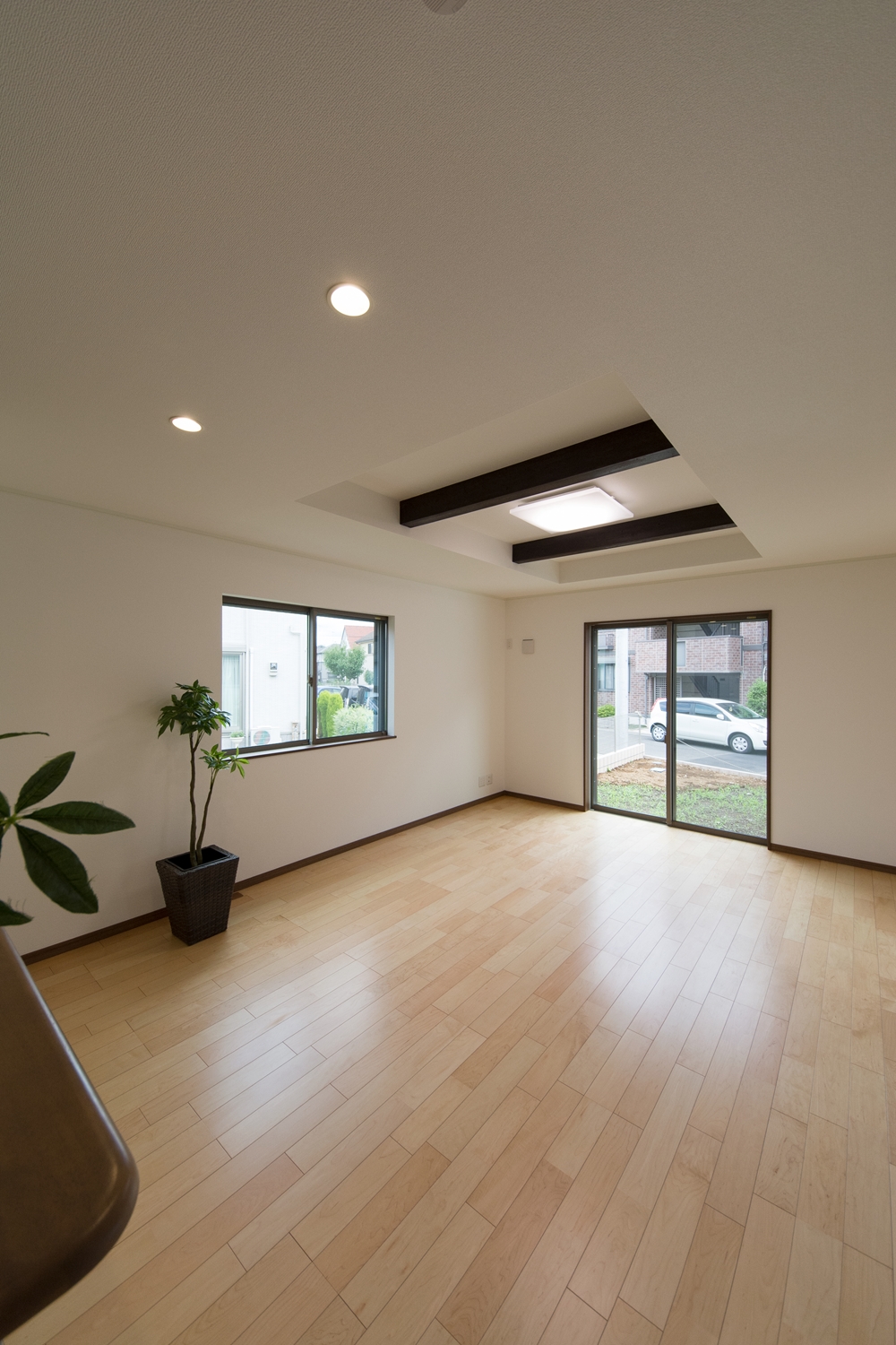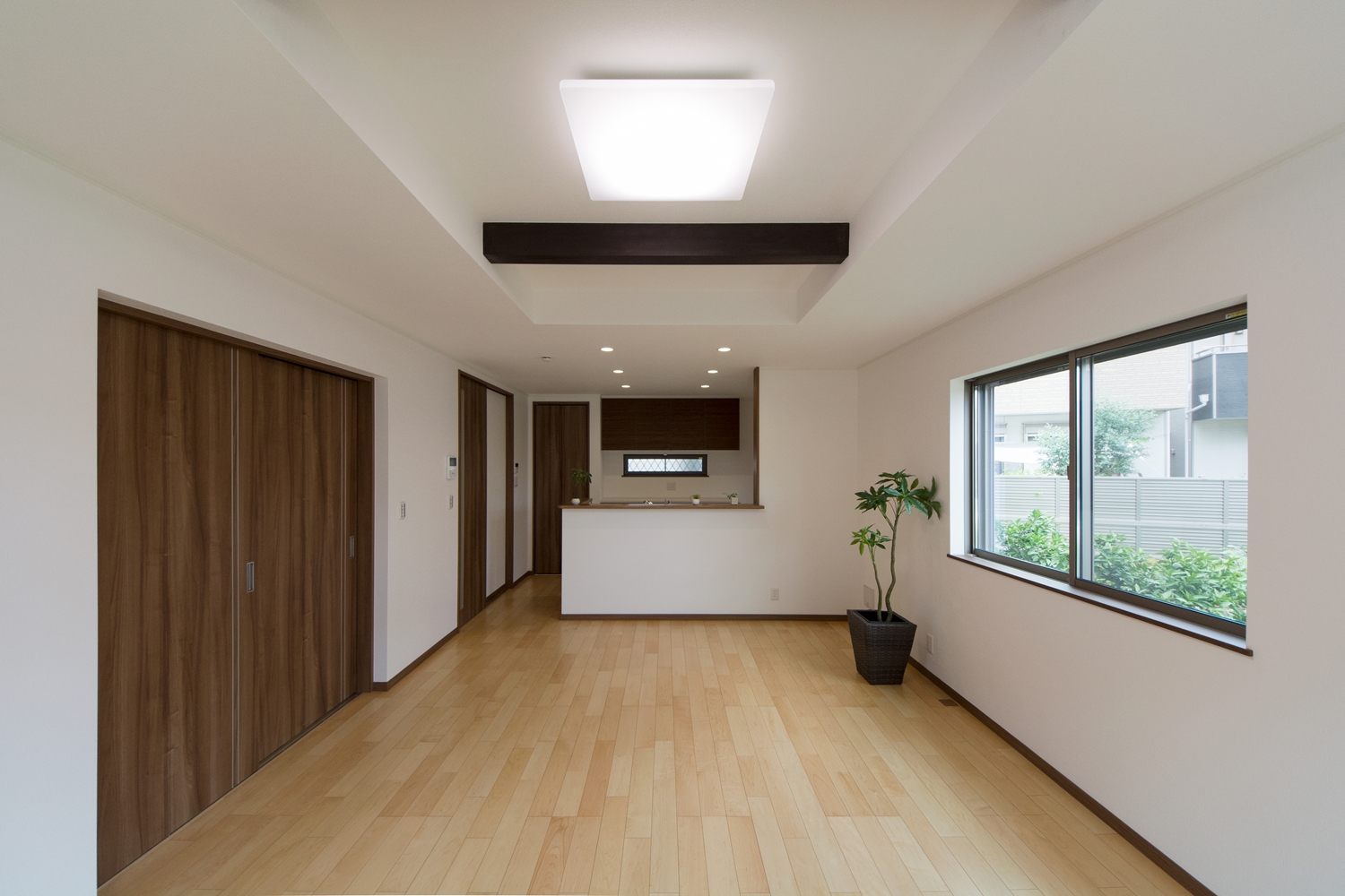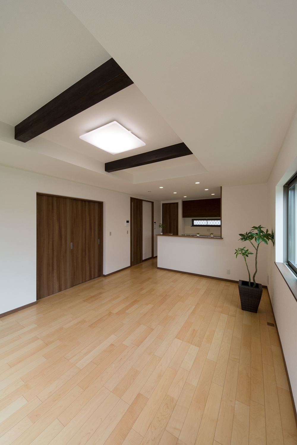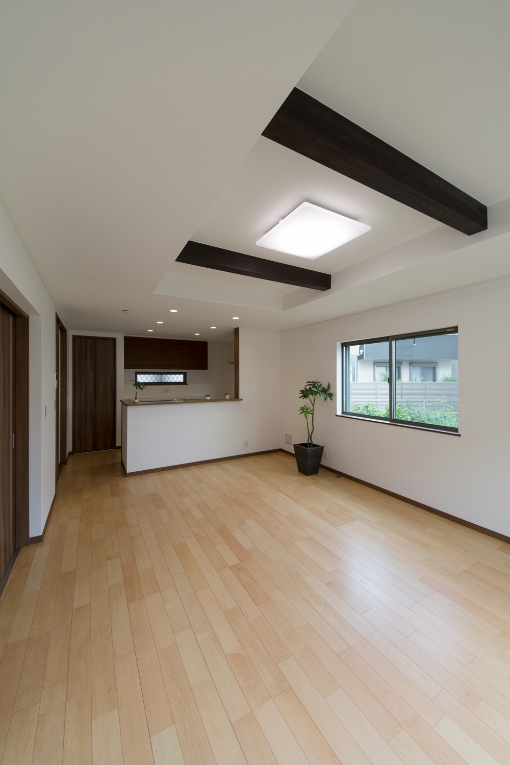 ホワイトのサイディングをメインにブラウンのサイディングをアクセントとした落ち着きのあるナチュラル&モダンテイストな外観に仕上がりました。室内は化粧梁をうまく利用し、一部折り上げ天井にすることで、より開放感のあるリビング・ダイニングになりました。