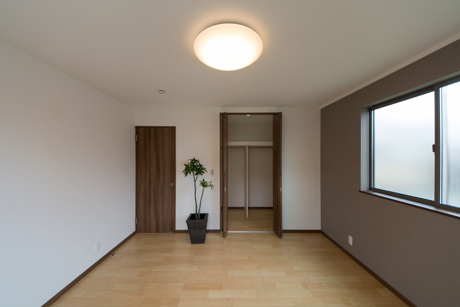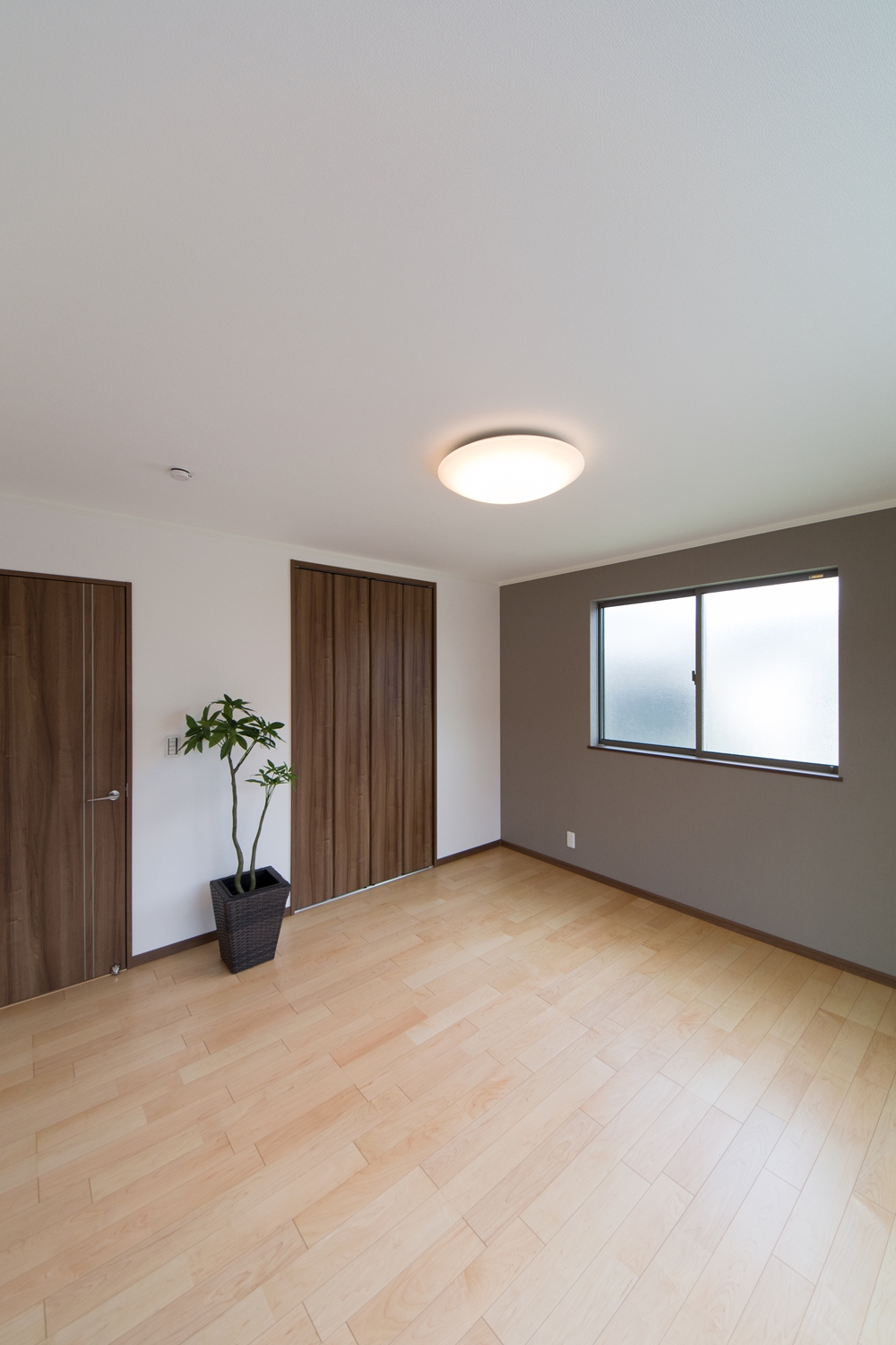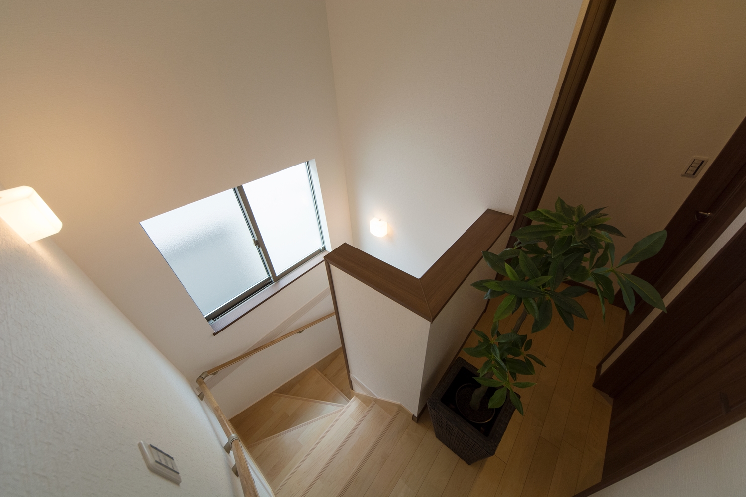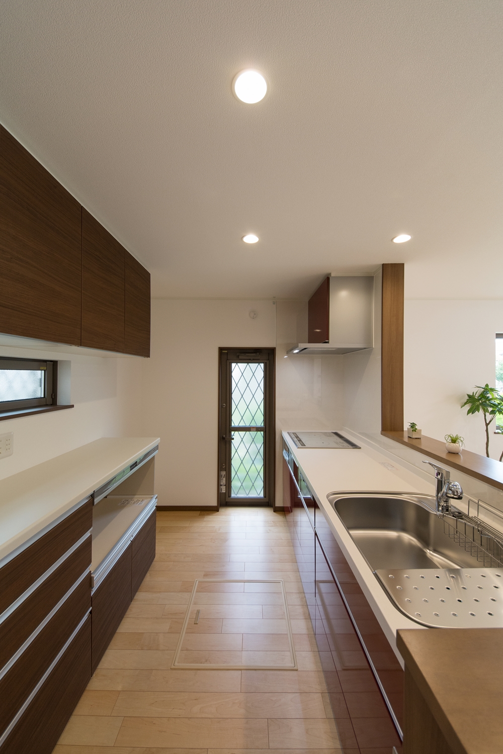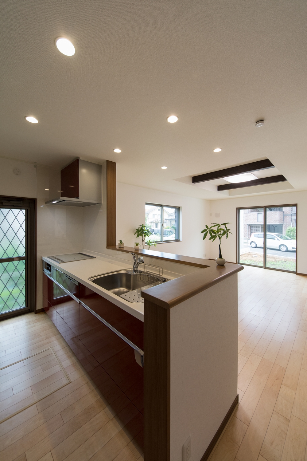ホワイトのサイディングをメインにブラウンのサイディングをアクセントとした落ち着きのあるナチュラル&モダンテイストな外観に仕上がりました。室内は化粧梁をうまく利用し、一部折り上げ天井にすることで、より開放感のあるリビング・ダイニングになりました。