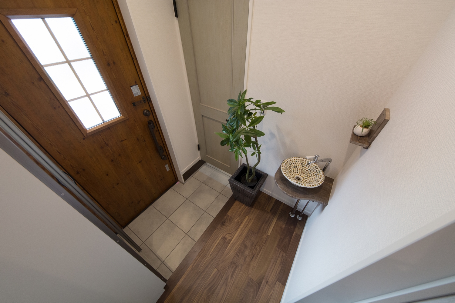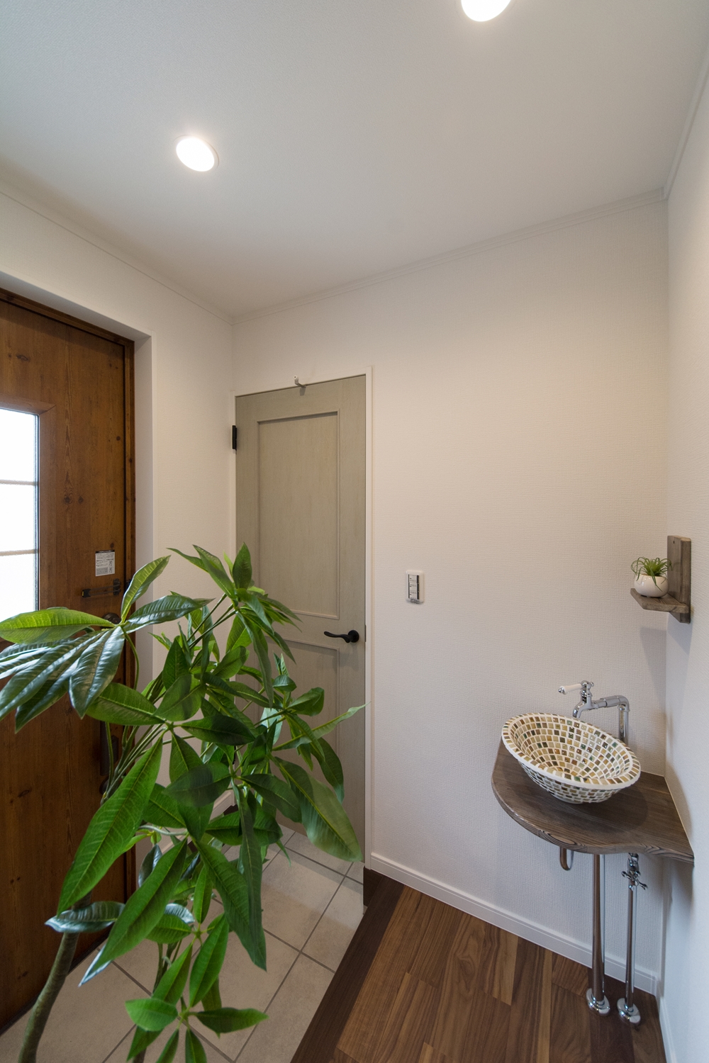 アンティーク調の玄関ドアとエイジングペイント調の玄関収納。