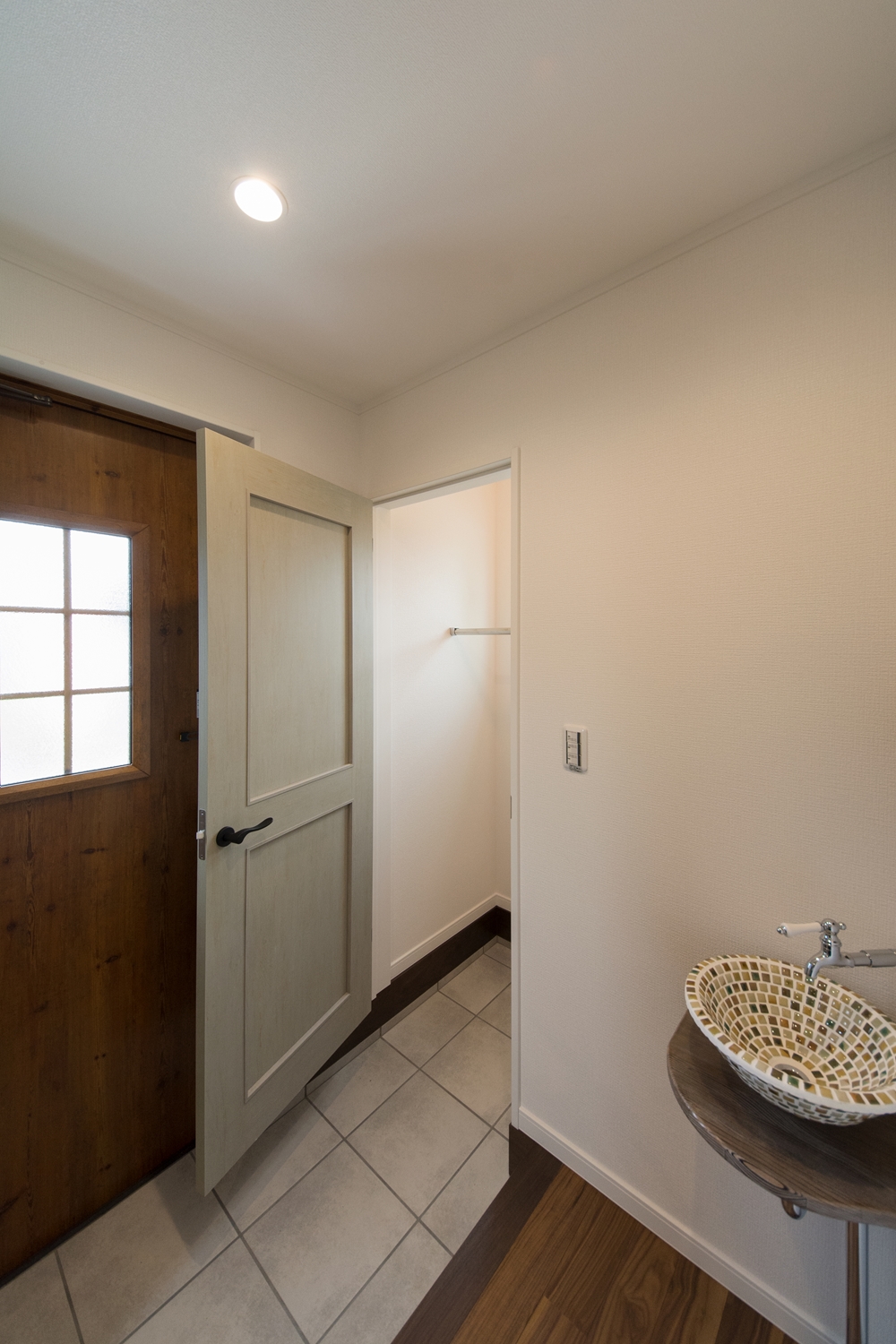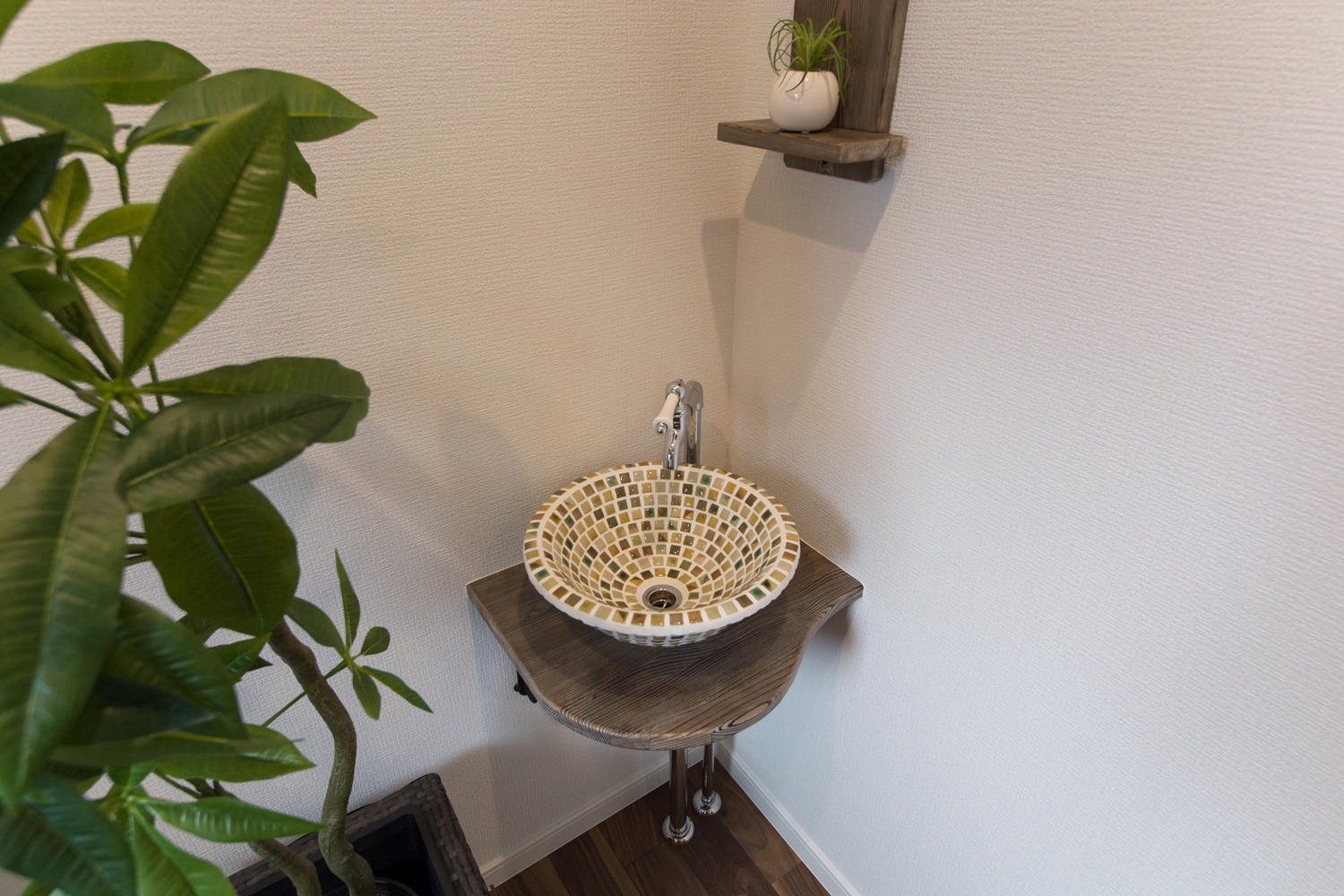 カラフルでアンティークなモザイクタイルの手洗いがお客様をお迎えします。木製の棚がさりげなくて素敵。