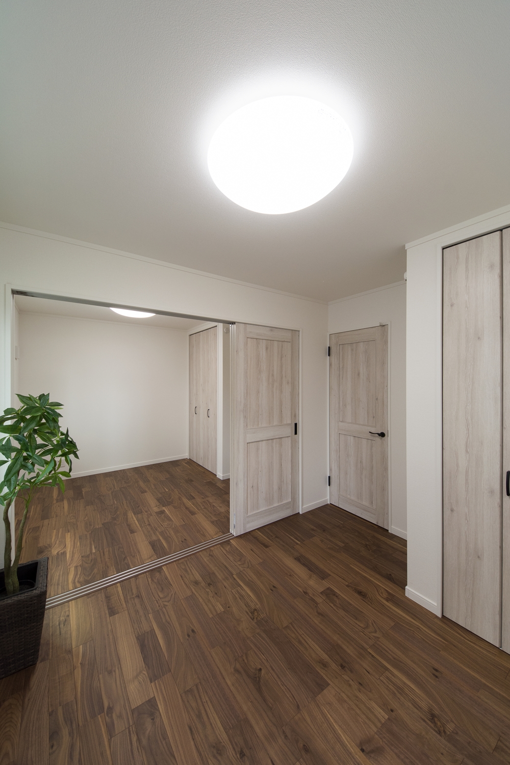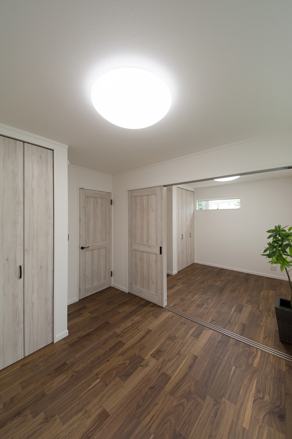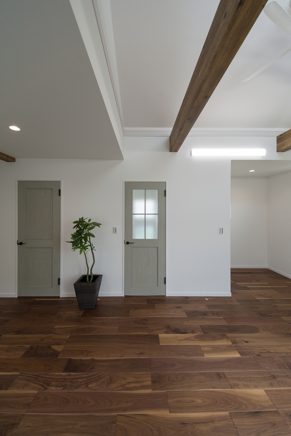 1階洋室/深い色味のフローリングと白いエイジング調の建具との組合せ。幅広くお部屋のコーディネイトを楽しめます。