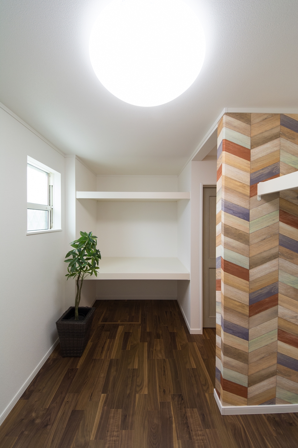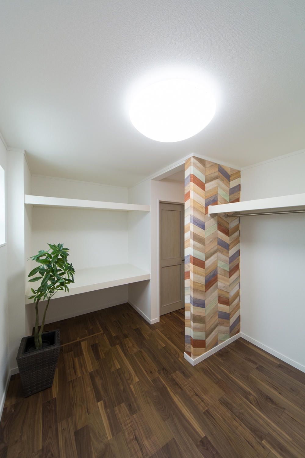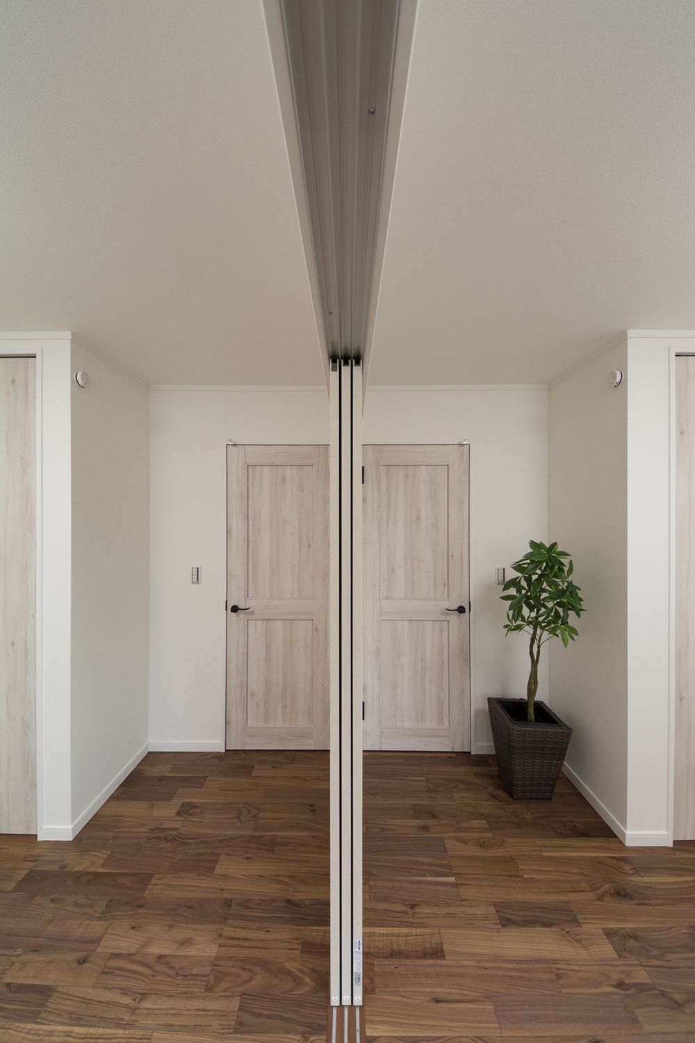 1階洋室/深い色味のフローリングと白いエイジング調の建具との組合せ。幅広くお部屋のコーディネイトを楽しめます。