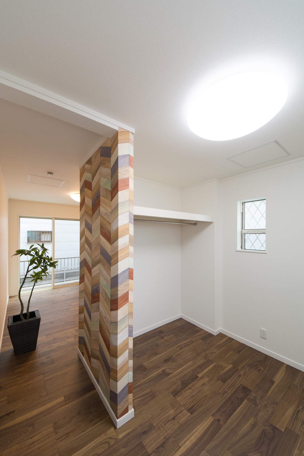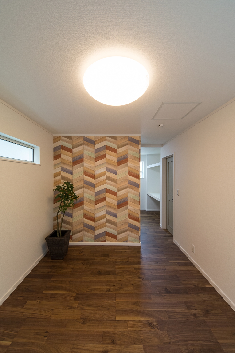 1階洋室/インパクトのあるカラフルな柄のアクセントクロスをポイントにして使うことでハイセンスな空間に。