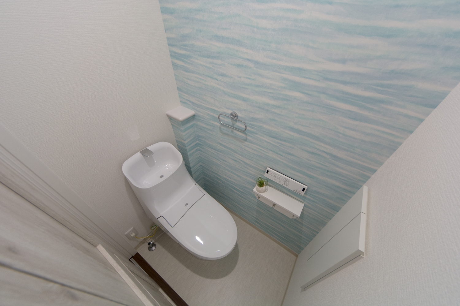 2階トイレ/爽やかなブルーのアクセントクロスは海面をモチーフにしたデザイン。