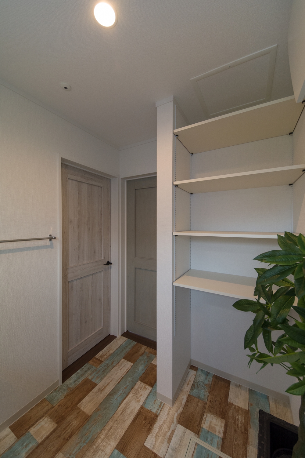 古びた感が素敵なエイジングペイント調のフロア。タオルや洗剤等をたっぷり収納できるリネン棚を設置。