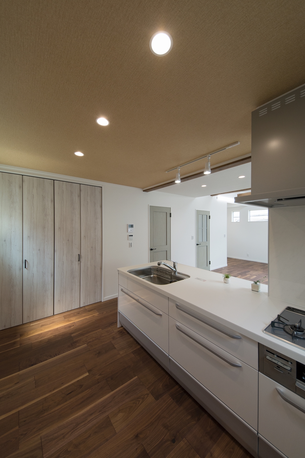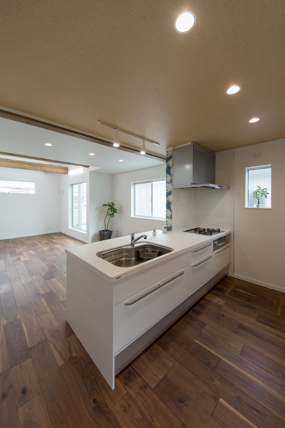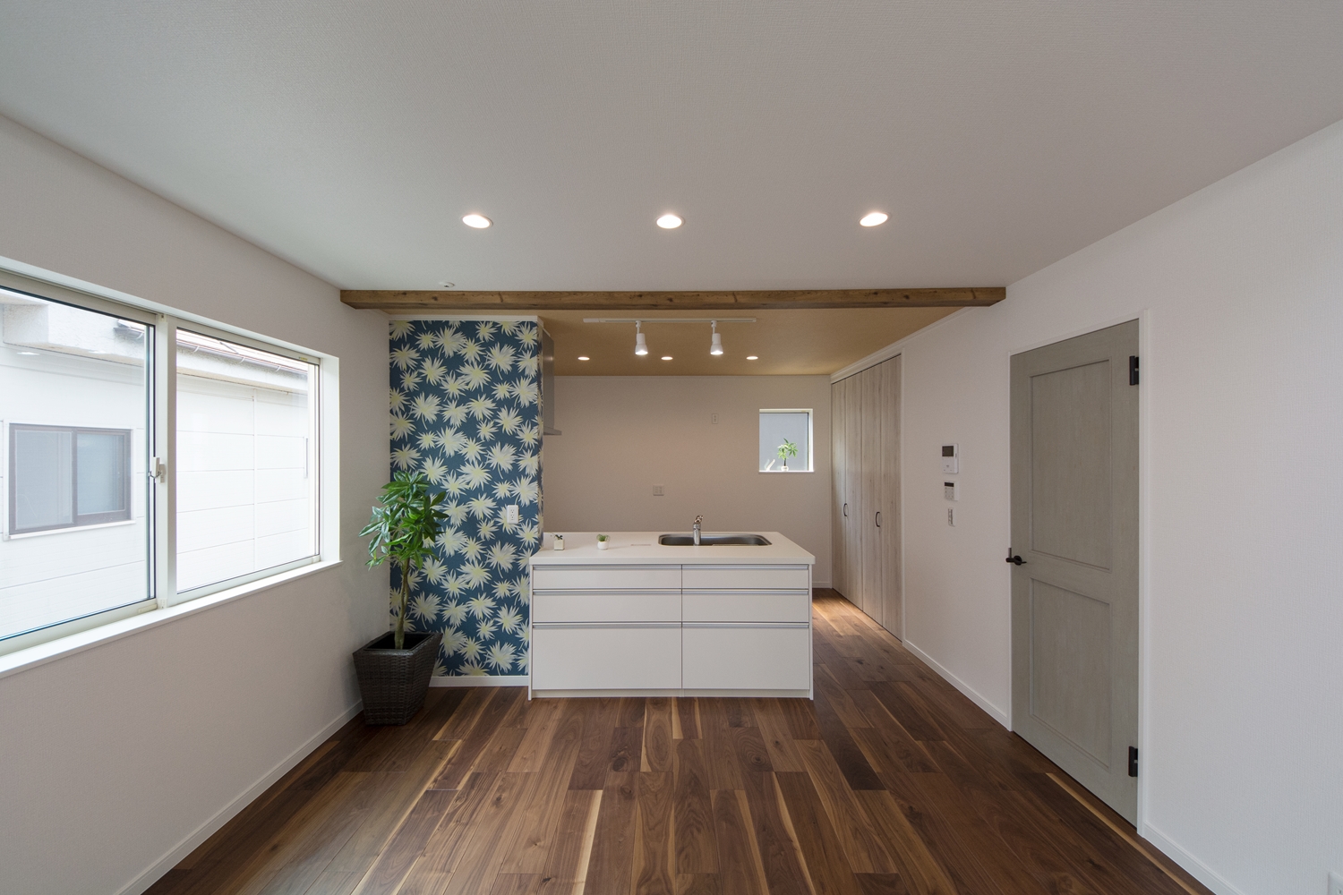2階LDK/キッチンと壁の白をベースに、フローリングと化粧梁の深い色味がメリハリを与えています。建具や花柄クロスがポイントになってハイセンスな空間に。