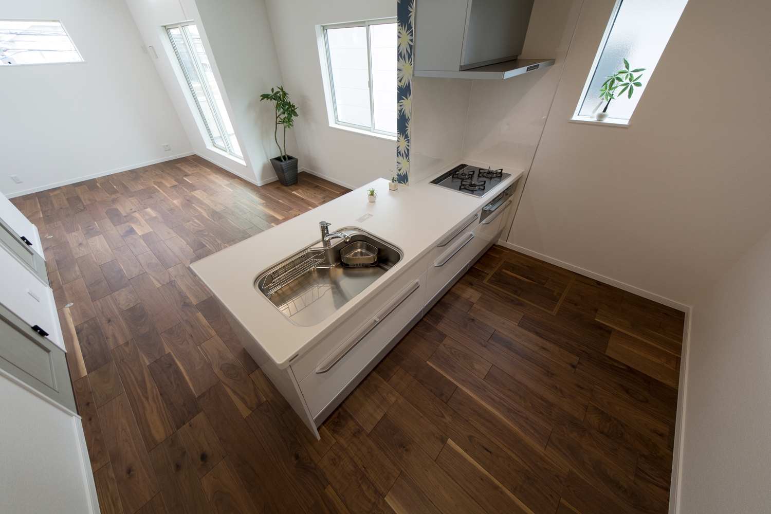 清潔感のある真っ白なキッチンはペニンシュラタイプ。