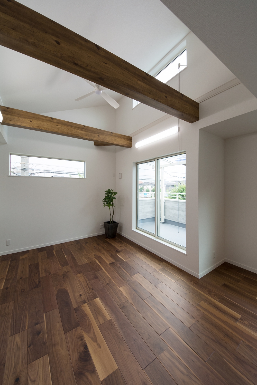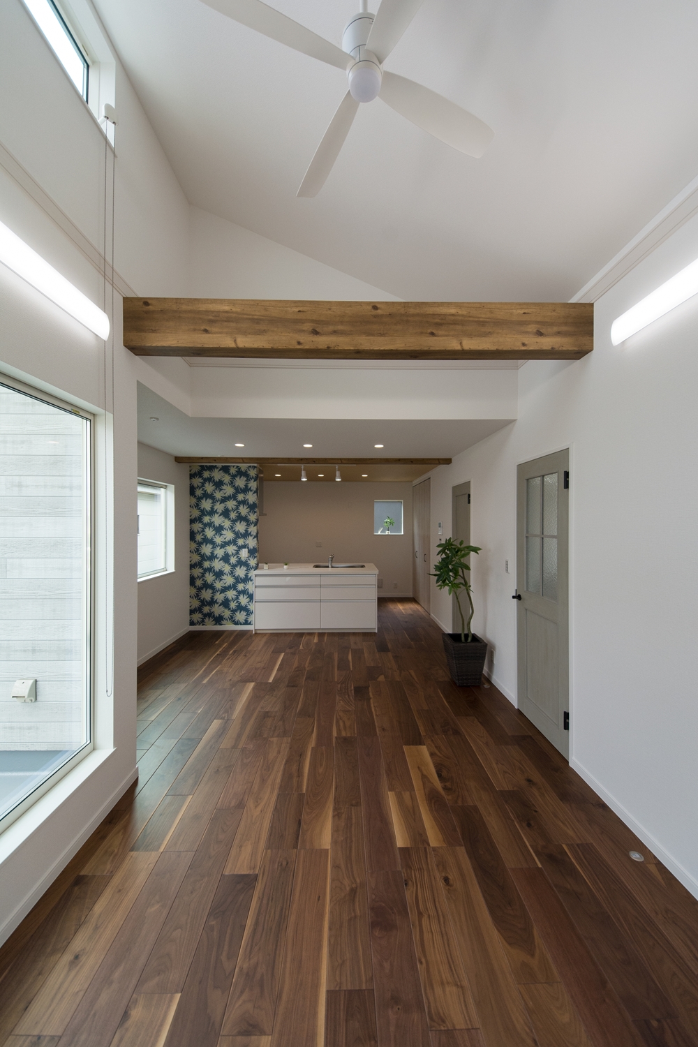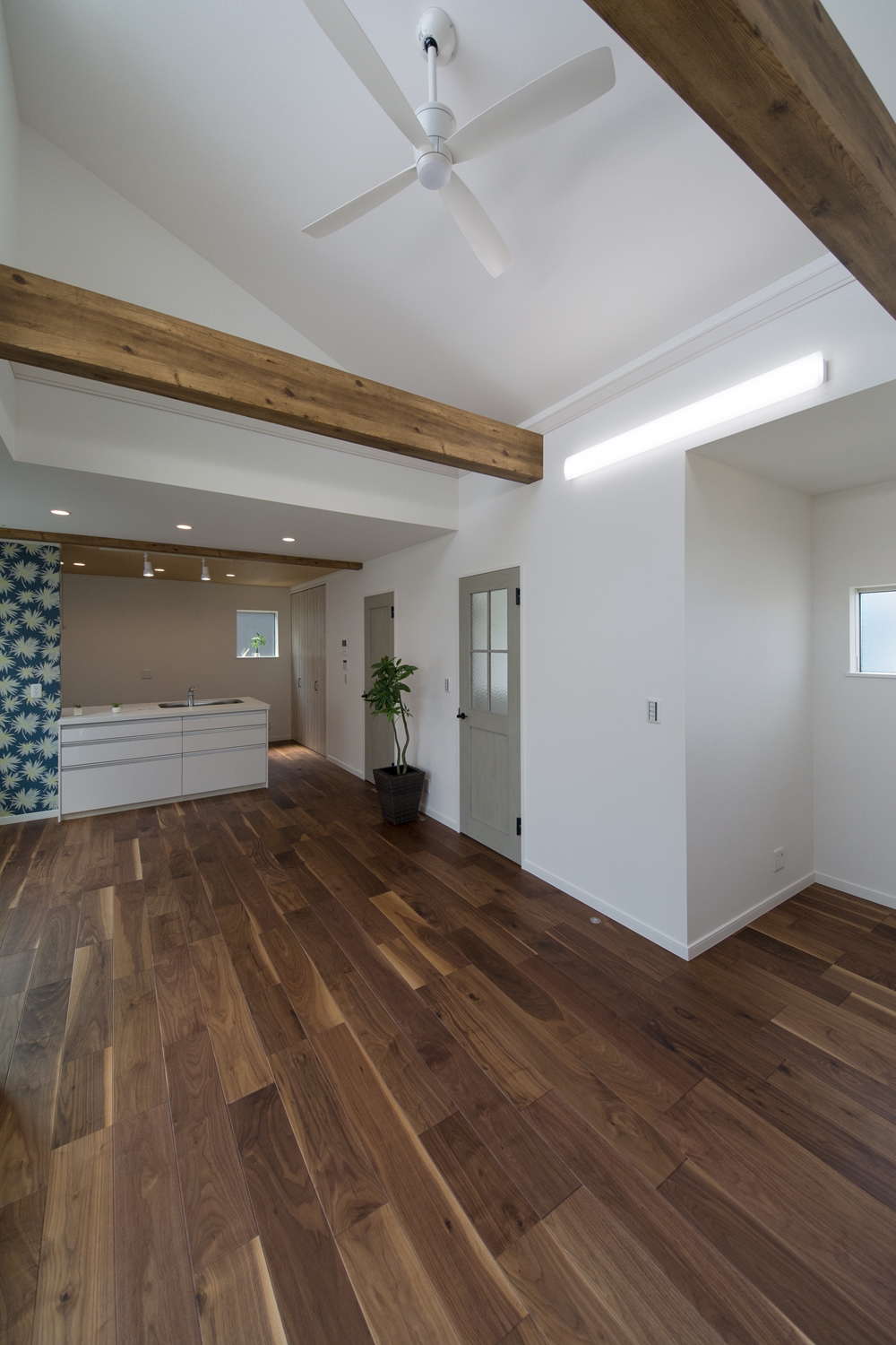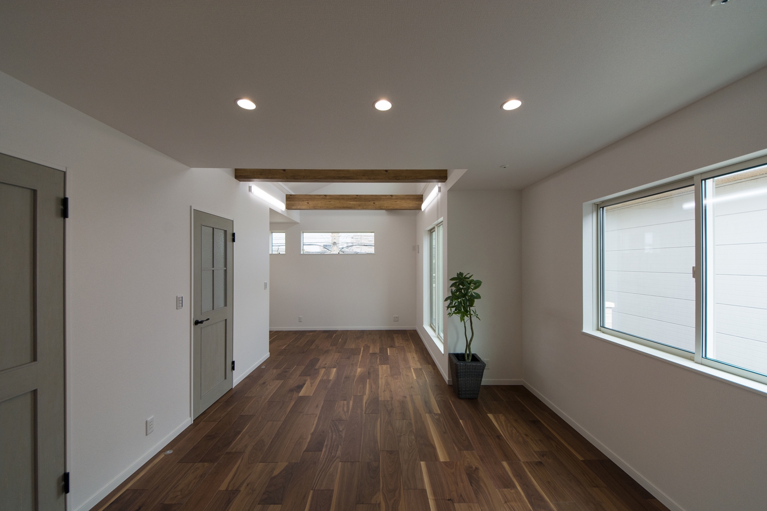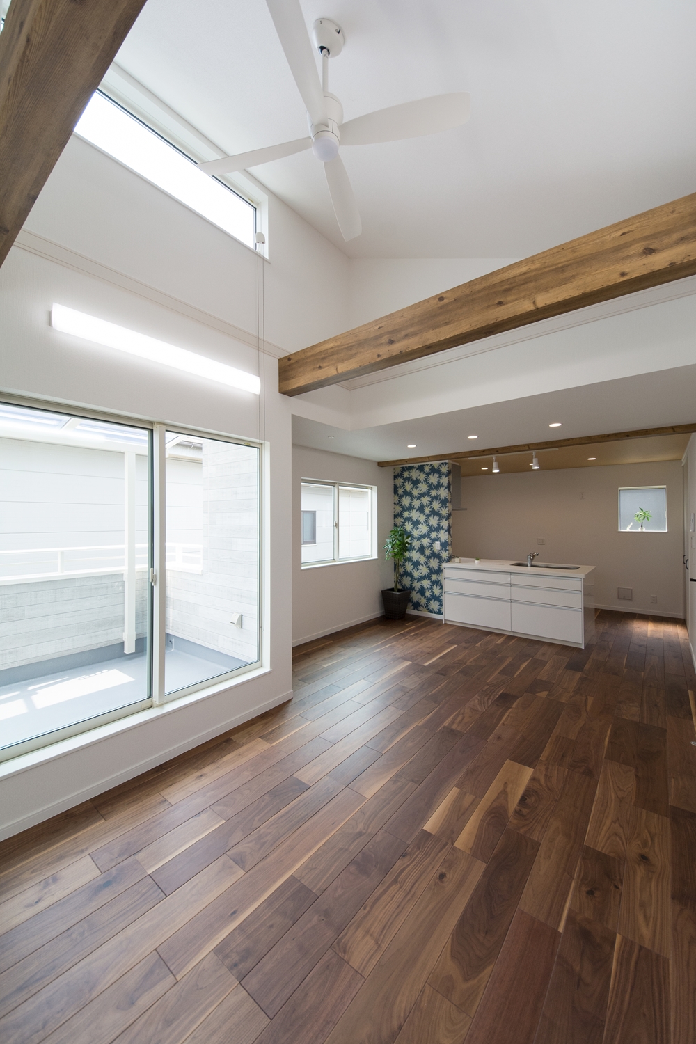 2階LDK/壁の白をベースに、フローリングと化粧梁の深い感じの色味が空間にメリハリを与えています。
