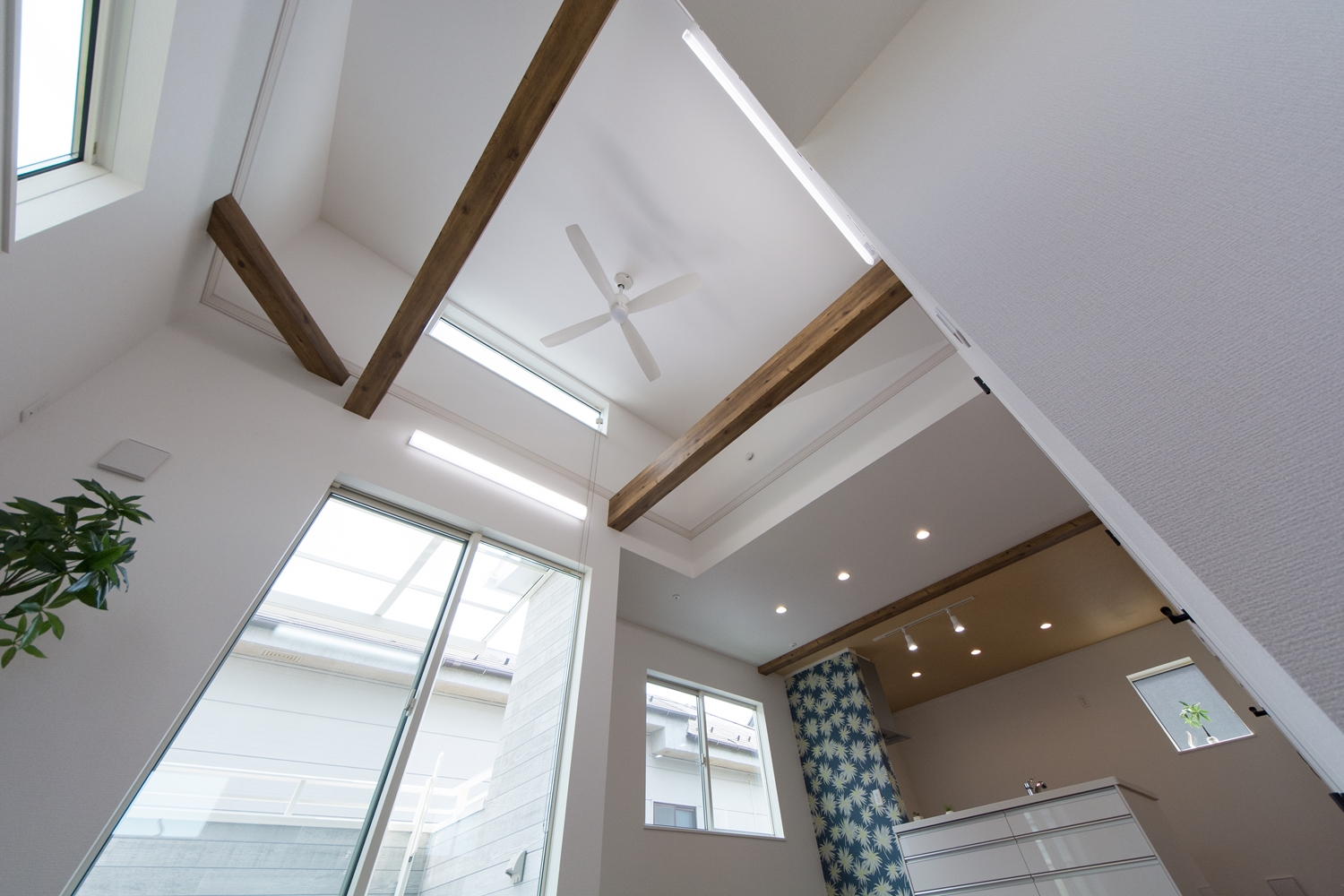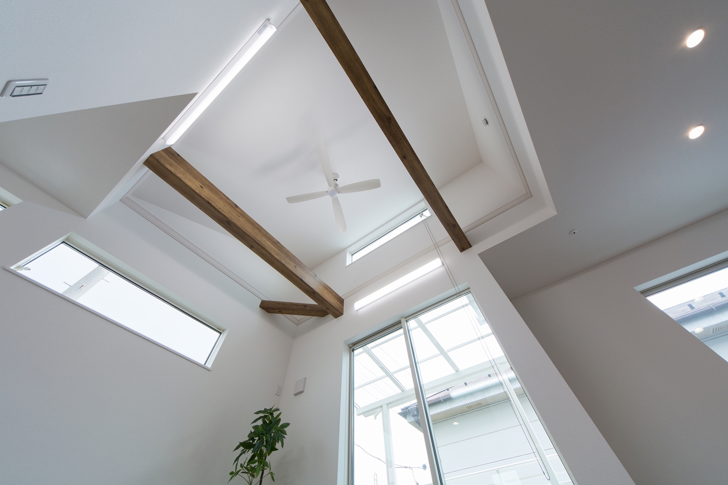 2階LDK/真っ白の高い天井に、化粧梁とインテリアファンがアクセント。