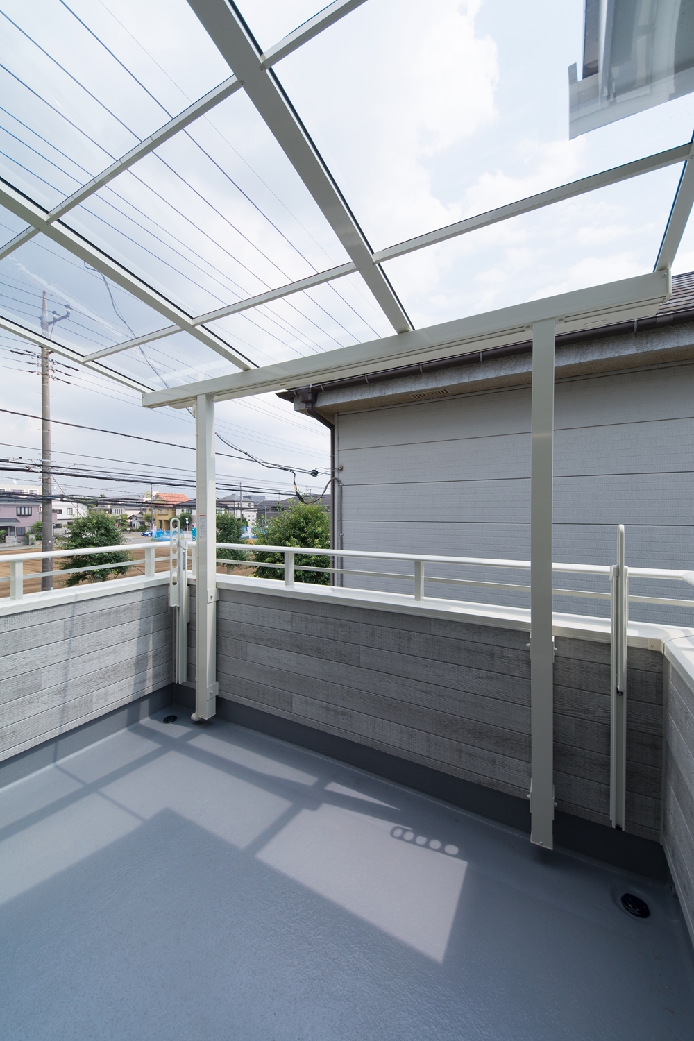 リビング隣の屋根付2Fバルコニー。光と風が心地よく交わる”もう一つの部屋”のようなスペース。