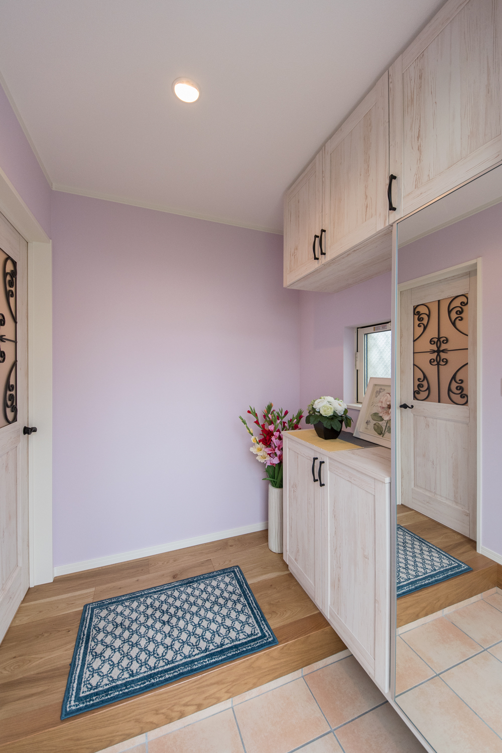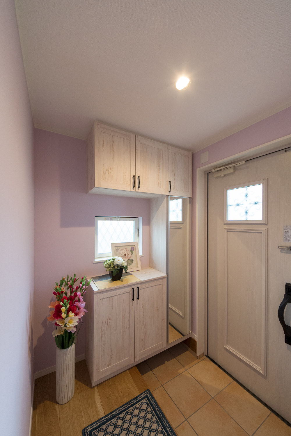 パステルカラーのクロスに玄関ドアと収納BOXのシャビー感が甘さと大人っぽさを持った空間を演出。