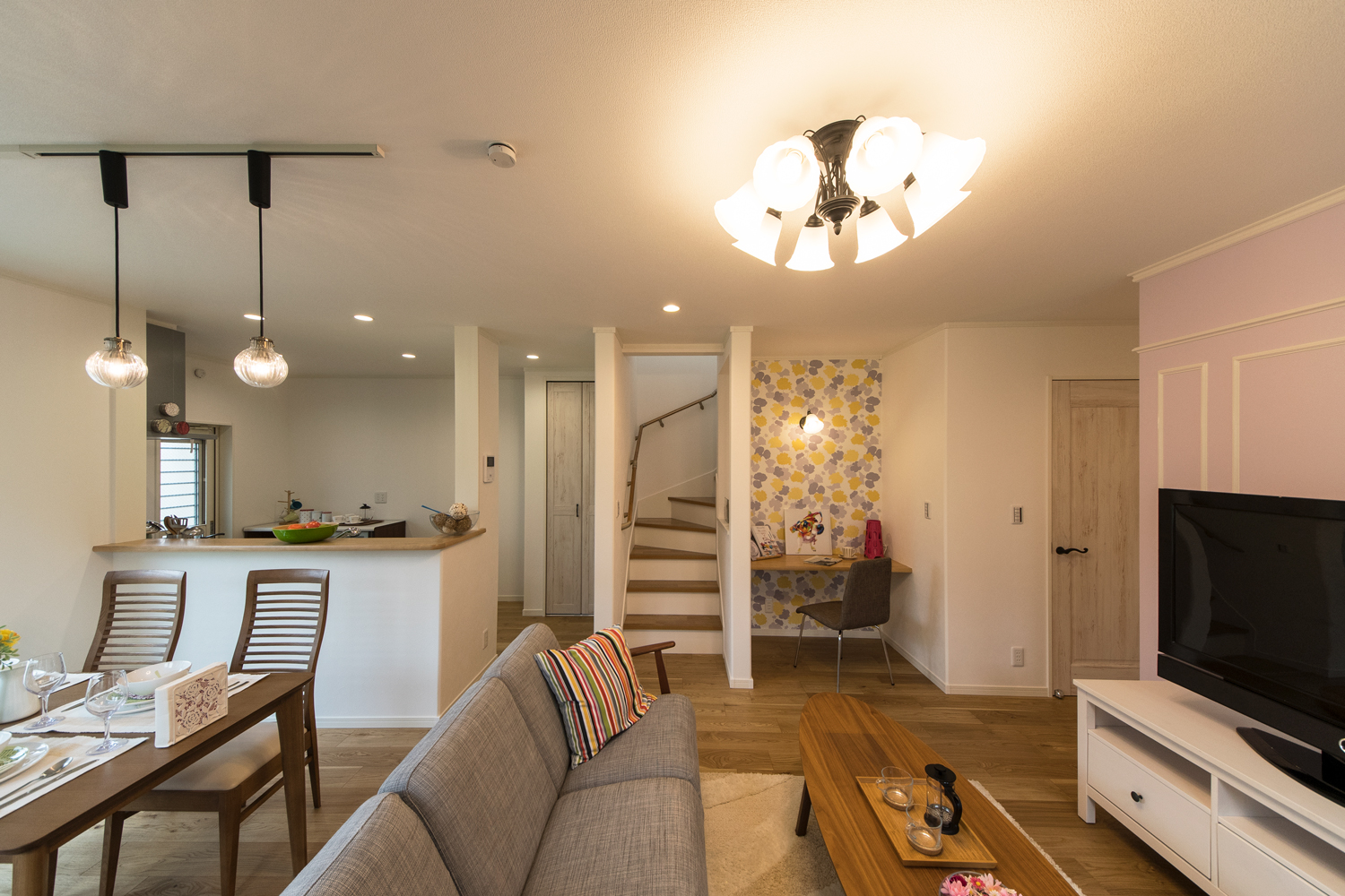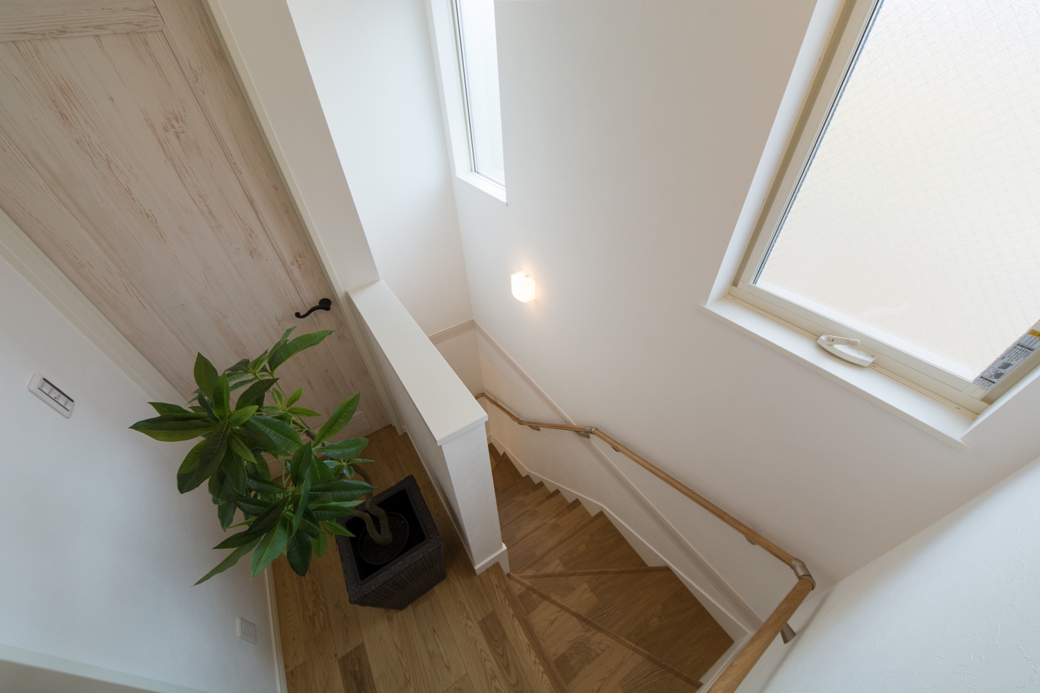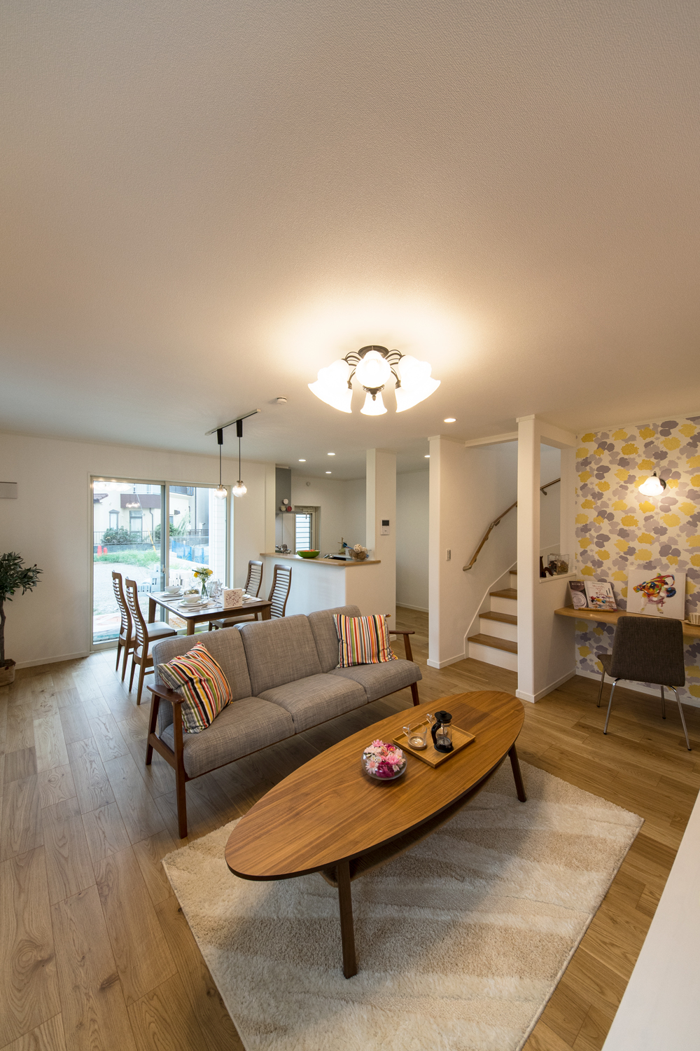 お子様の帰宅が分かるリビングイン階段を採用。「ただいま」や「おかえり」の笑顔が自然と生まれる間取りです。