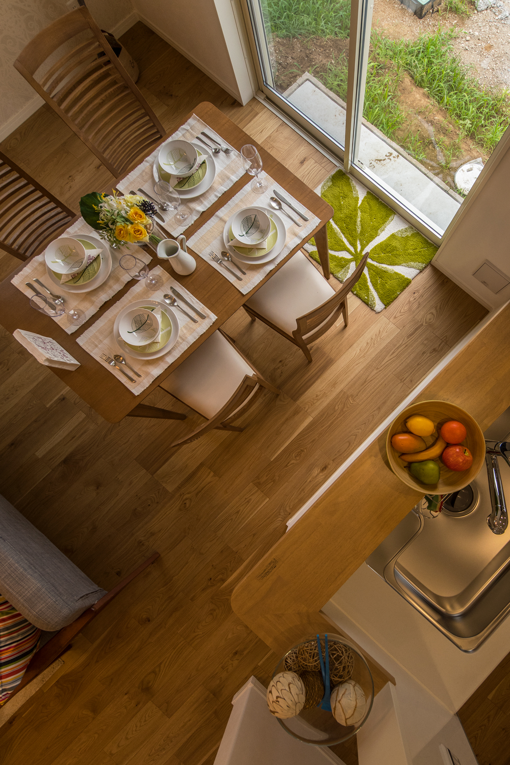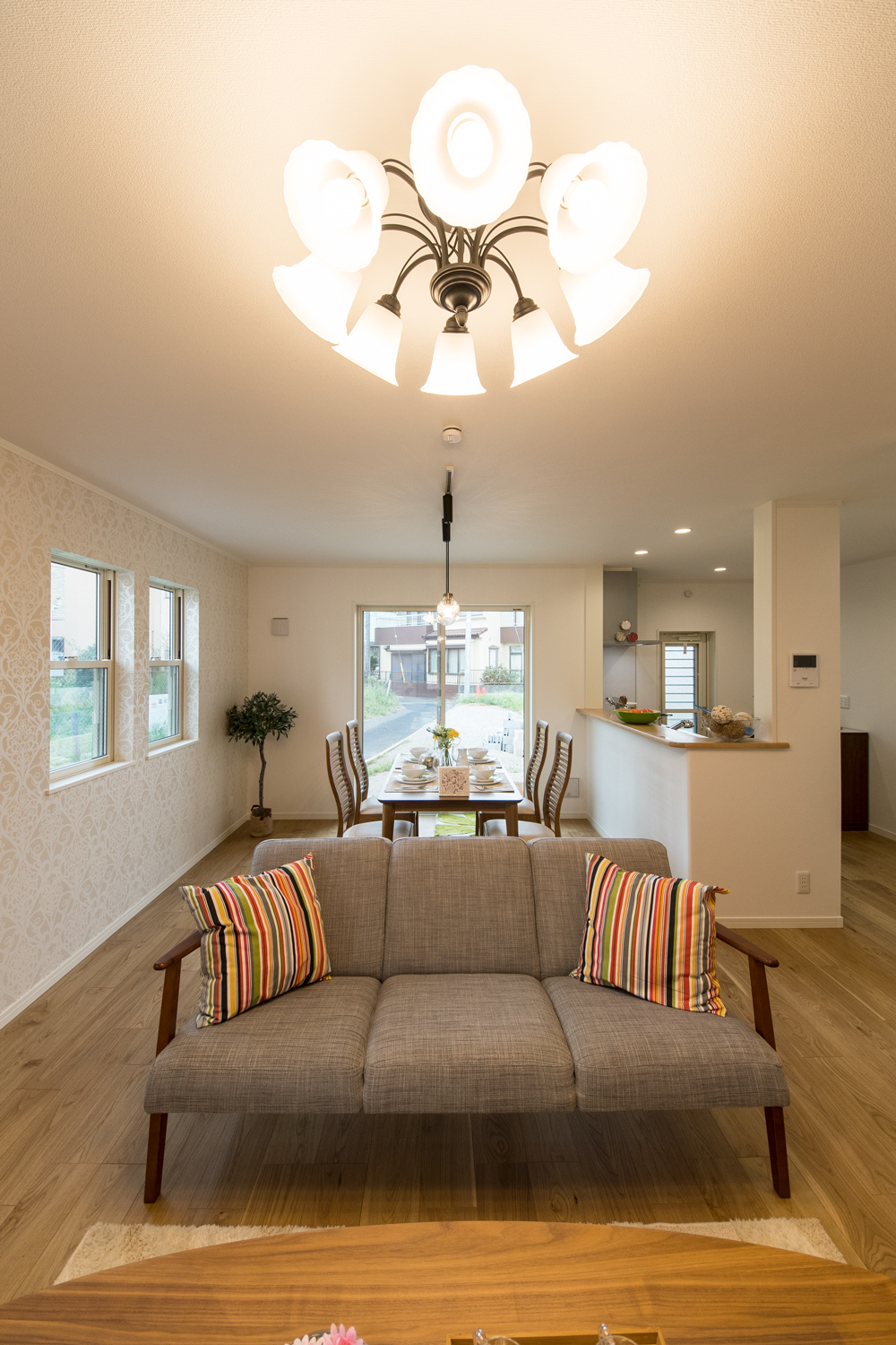 家族が寛ぐ開放的で伸びやかな空間のリビングダイニング。