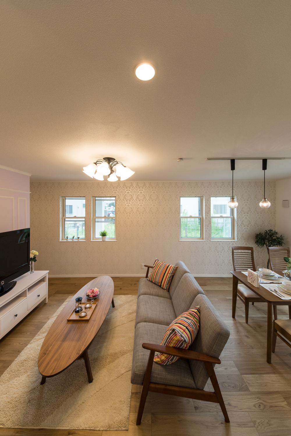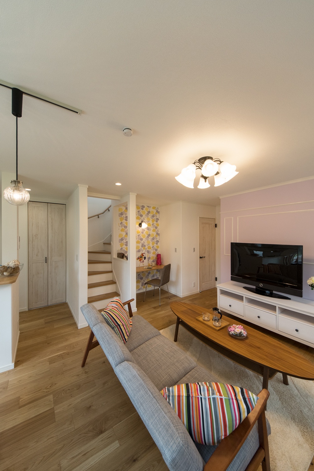 リビングのTVスペースにはパステルカラーのクロスをアクセントにした壁を設えました。