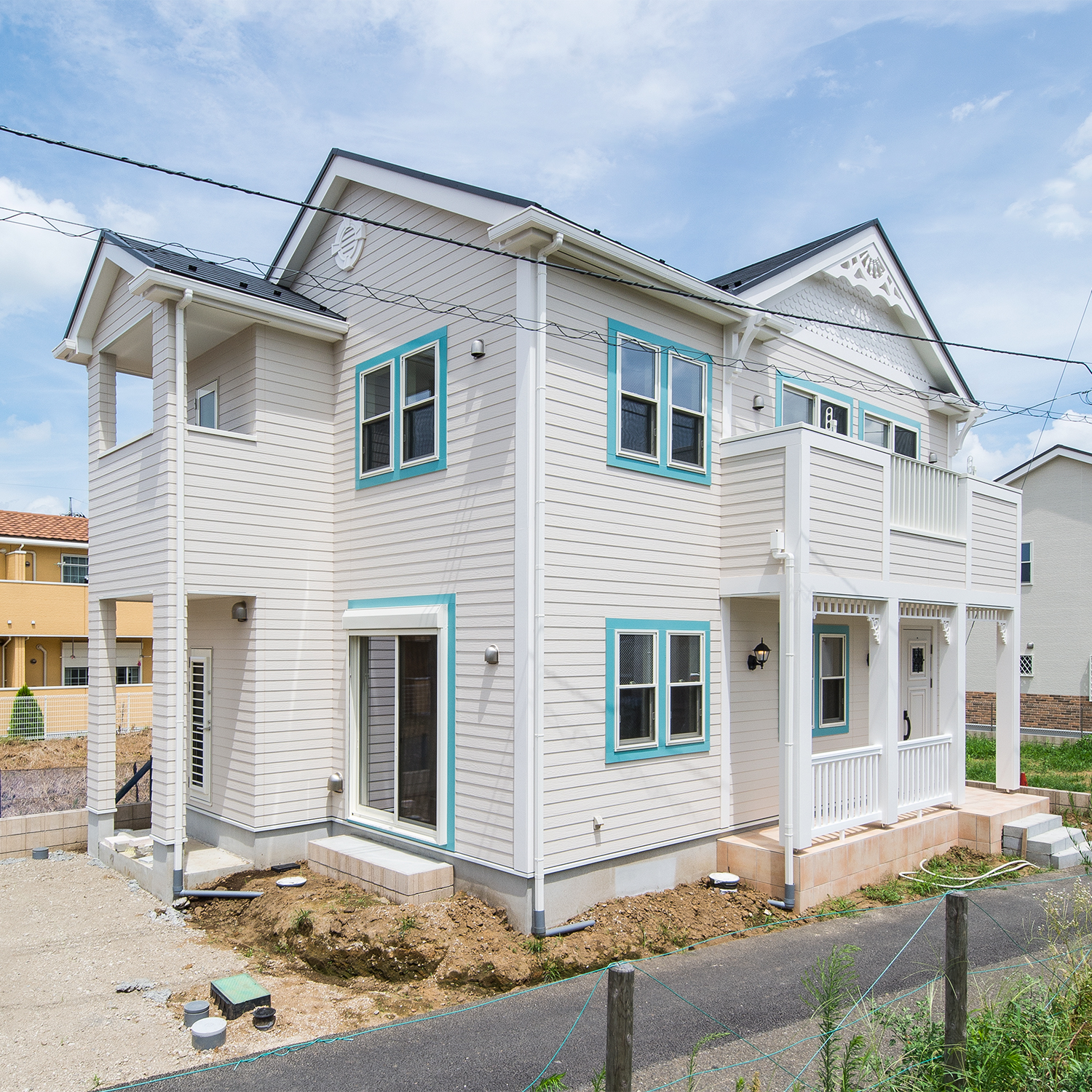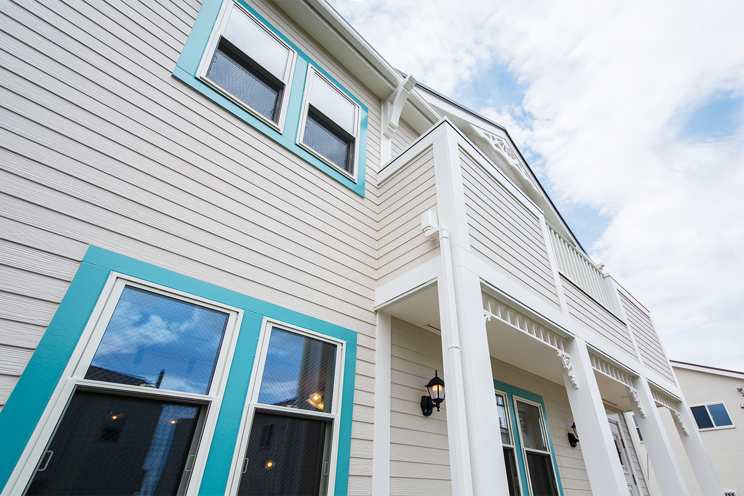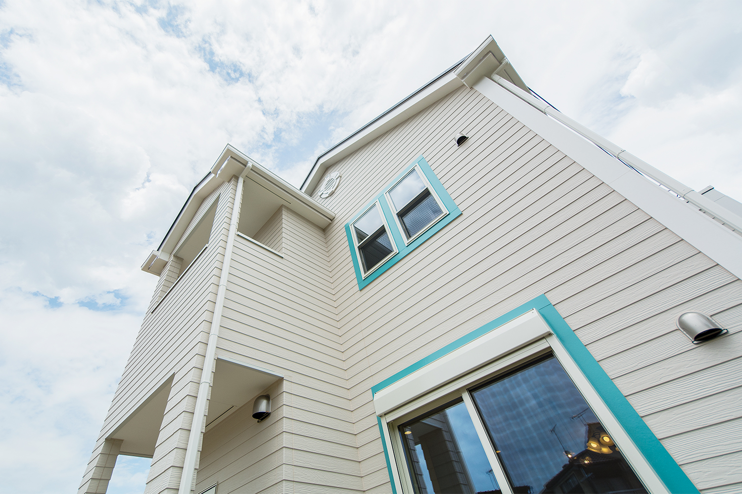 白に近い木目調のベージュを基調にブルーグリーンの窓モールをアクセントにした、コンテンポラリースタイル住宅。
