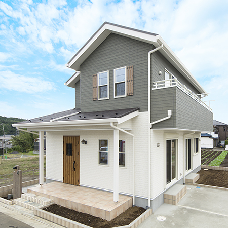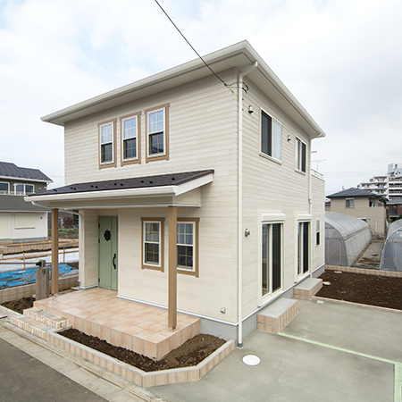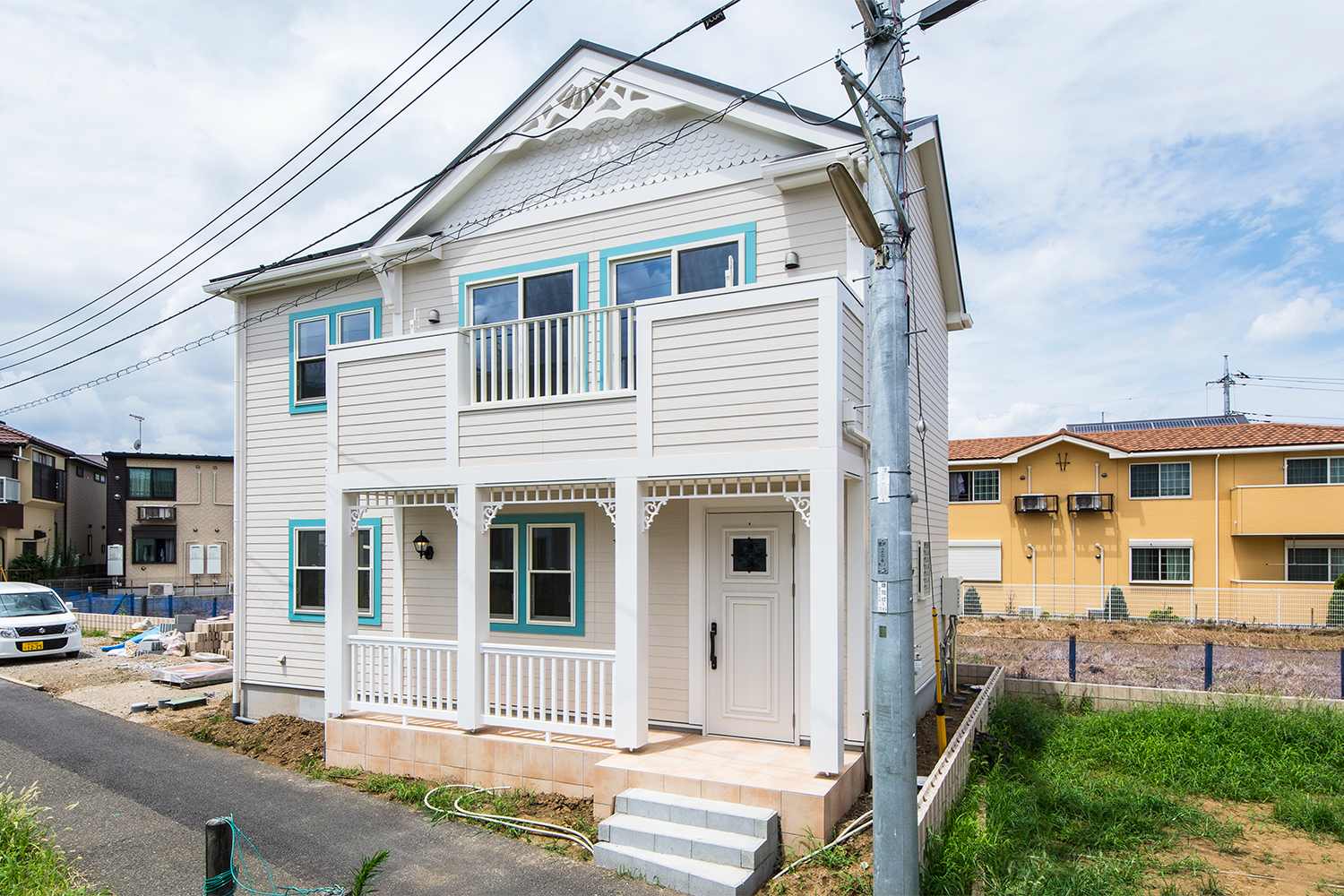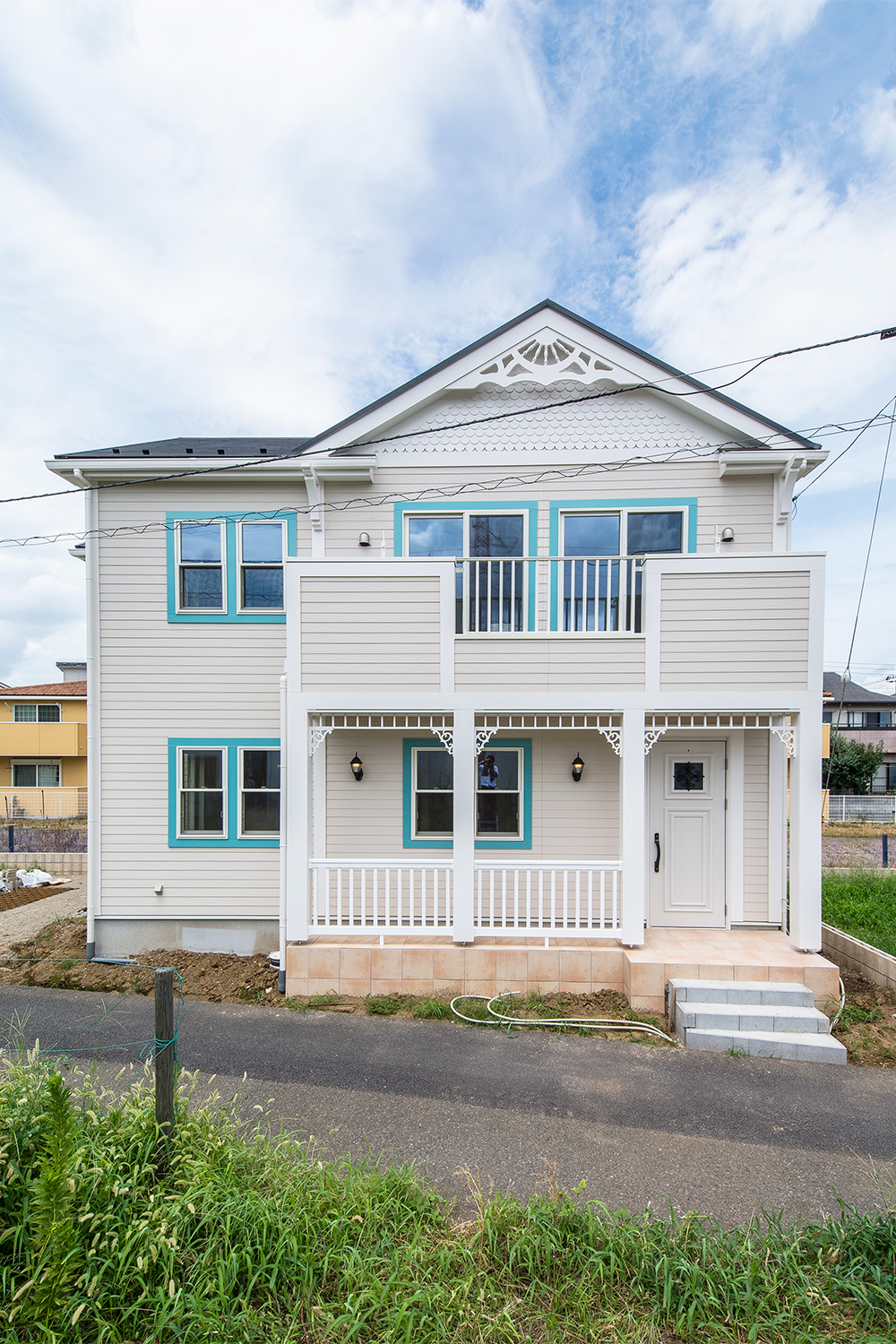 白に近い木目調のベージュを基調にブルーグリーンの窓モールをアクセントにした、コンテンポラリースタイル住宅。