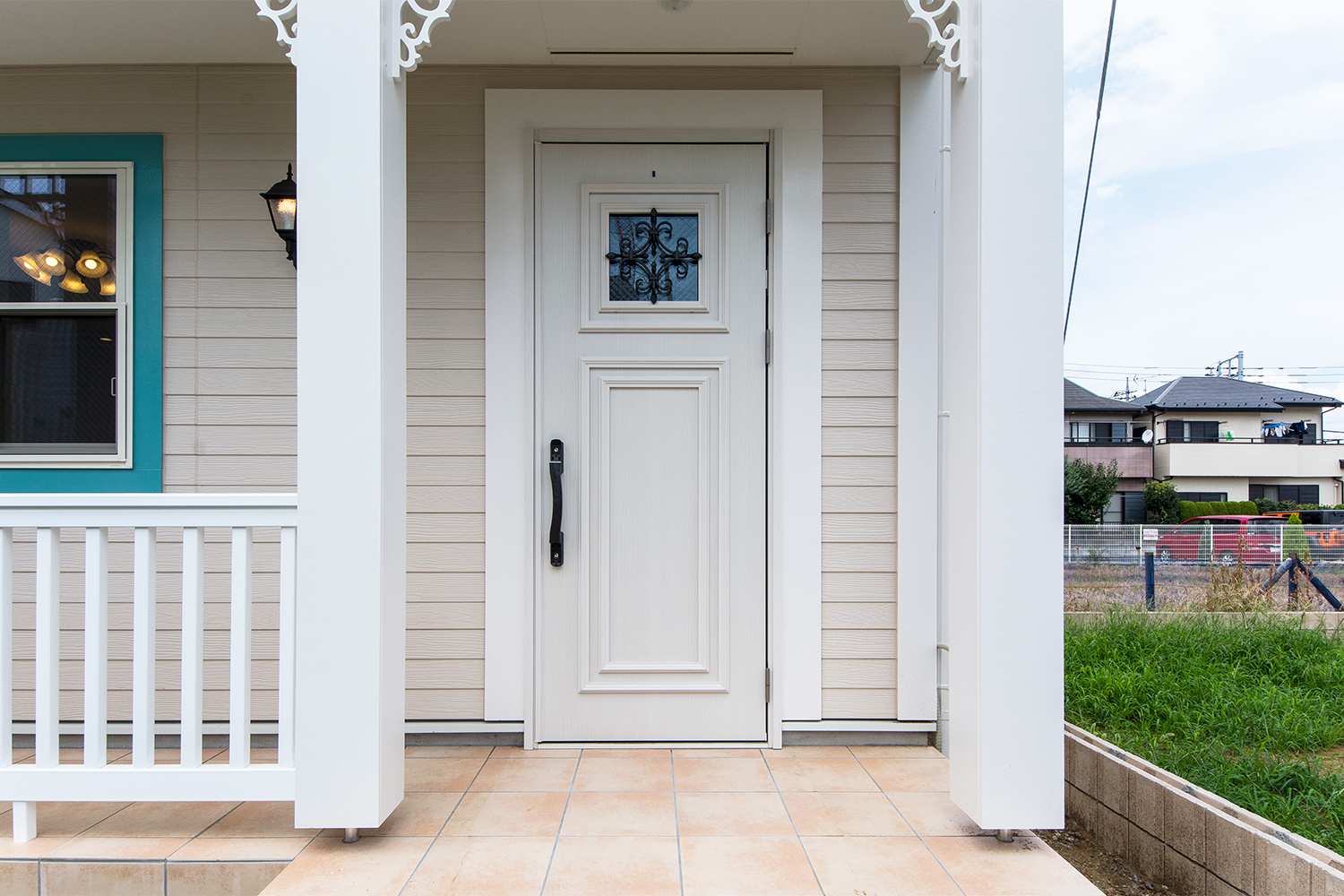 アンティーク調のオーナメントを施したホワイトの玄関ドア。