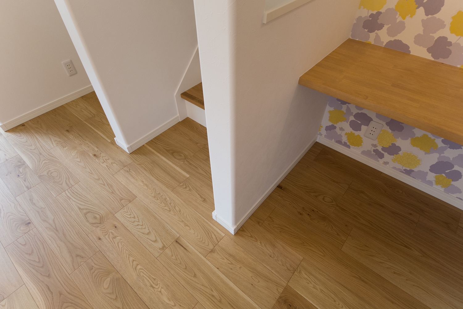 しっかりした木目、特徴的な柾目の斑紋が正統を印象づける「オーク」のフローリングがナチュラルな空間を演出。