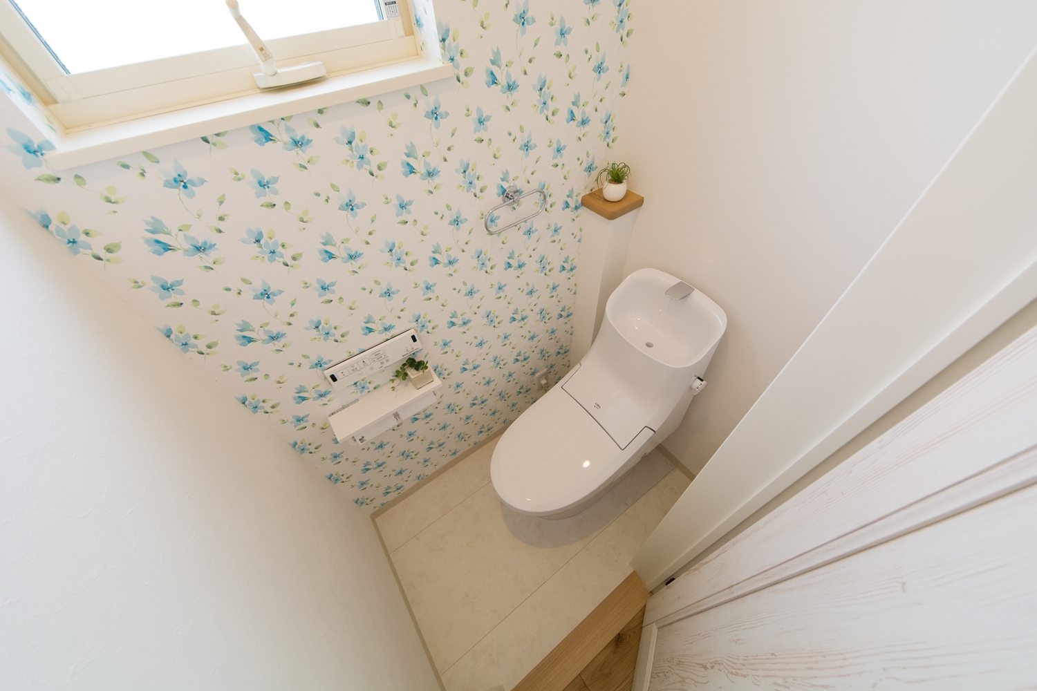 花の柄をモチーフにした白のクロスが、さり気なくエレガントに清潔感を演出する2階トイレ。