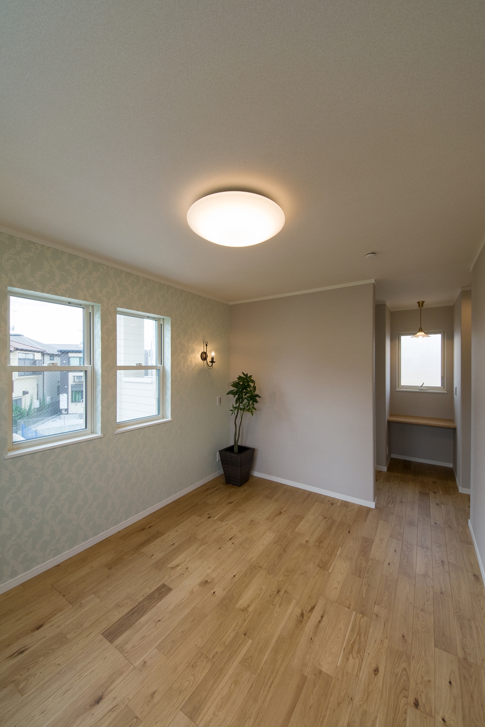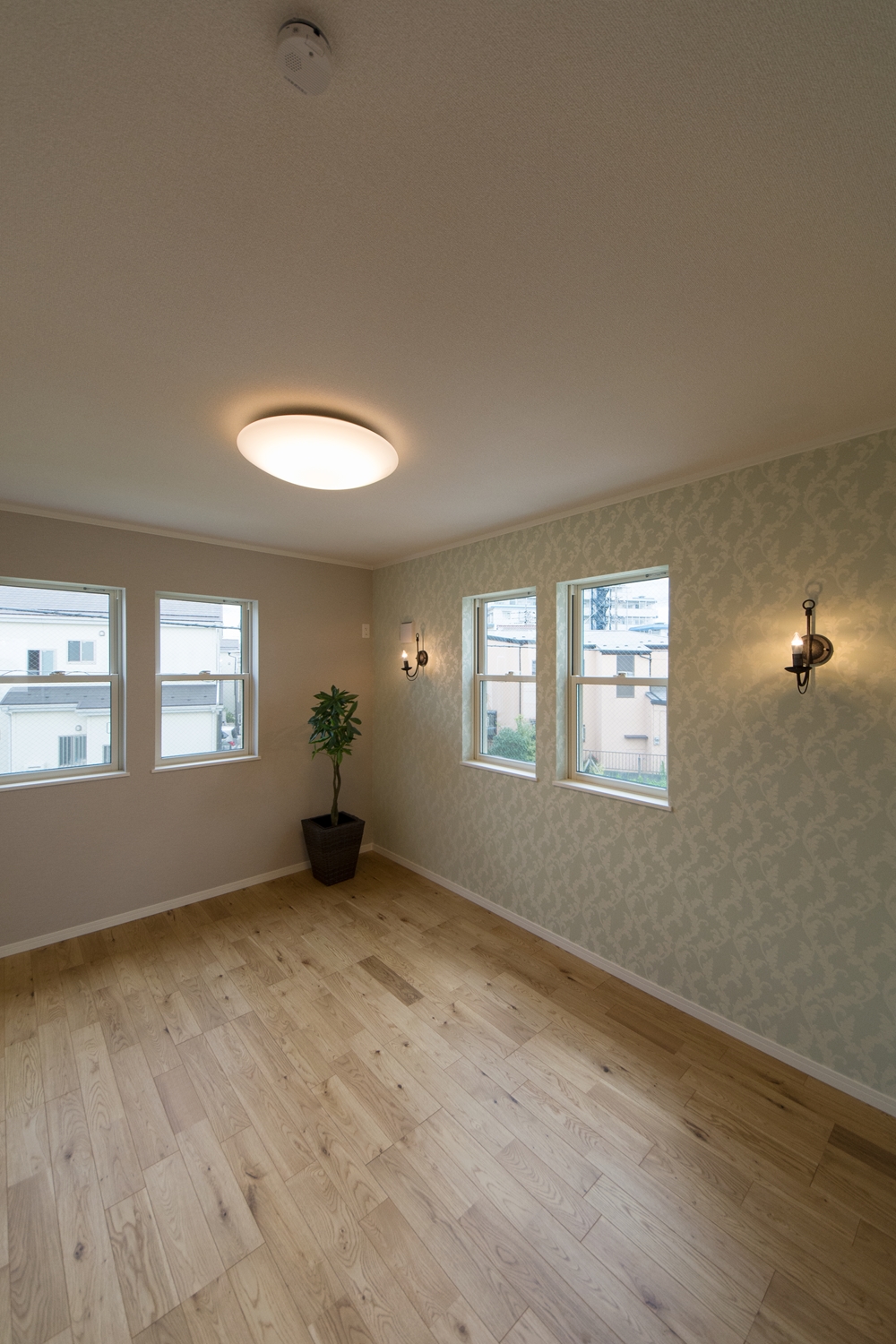 2階洋室/淡いグリーンのパターン柄クロスが上品な空間を演出。
