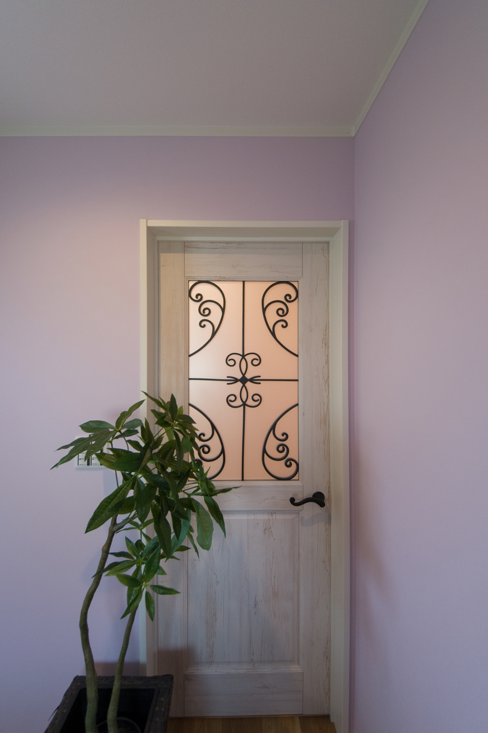 パステルカラーのクロスに室内ドアのシャビー感が甘さと大人っぽさを持った空間を演出。