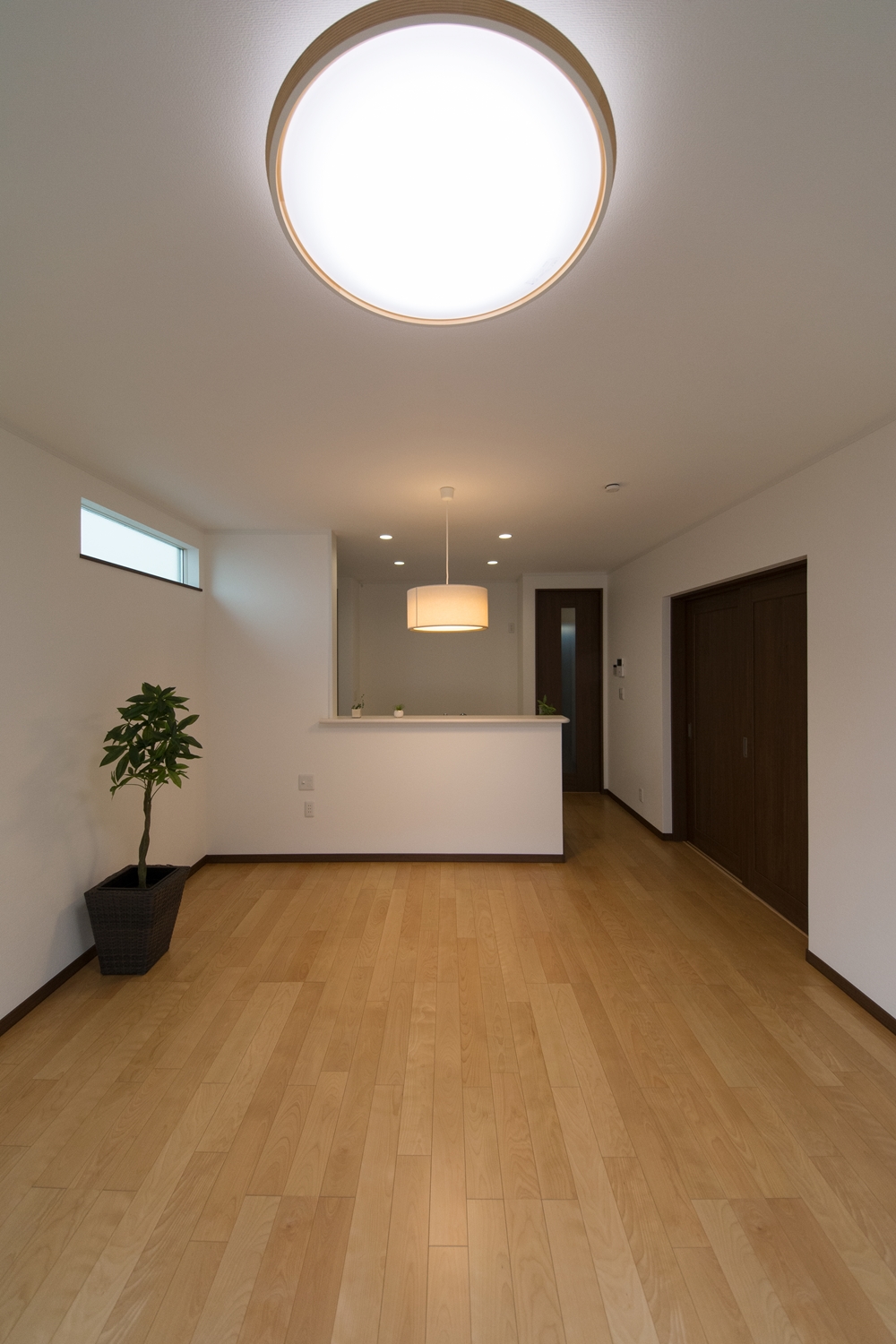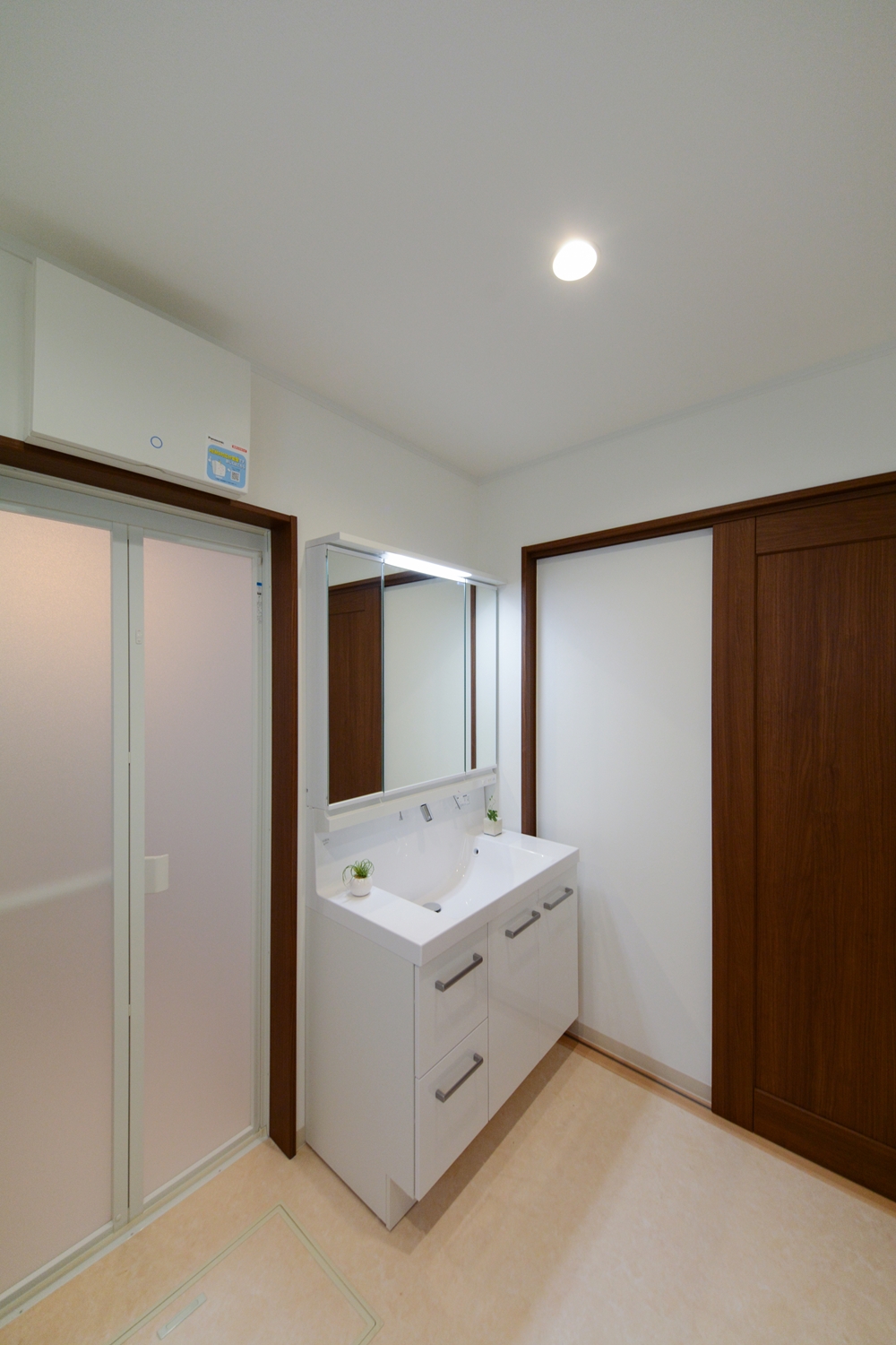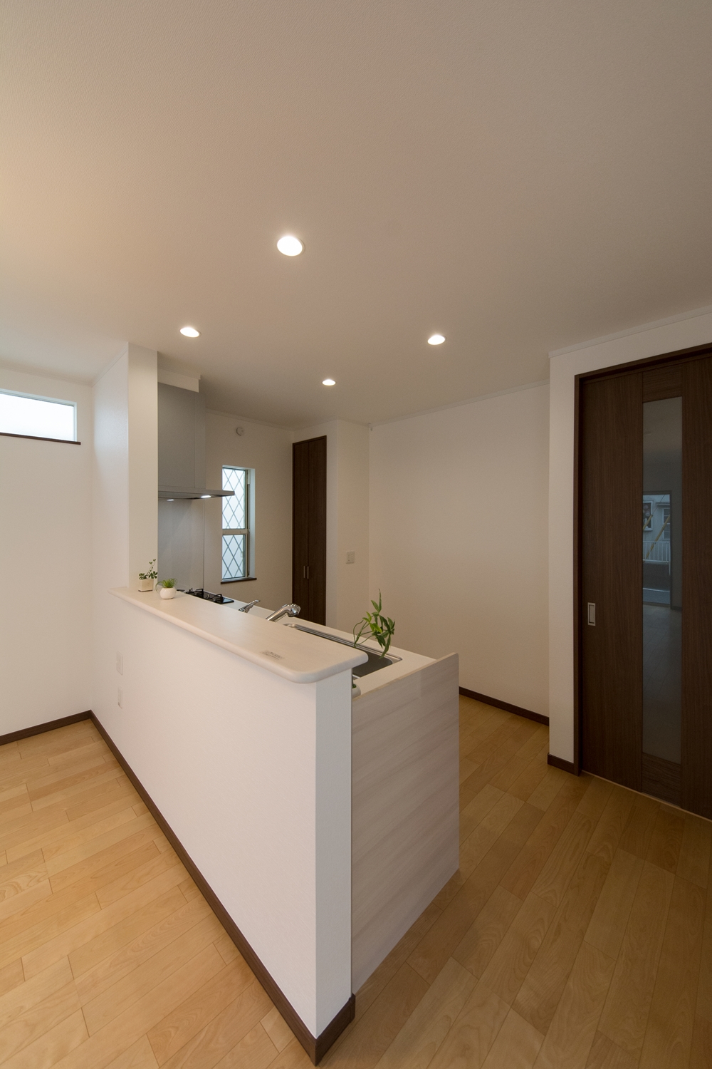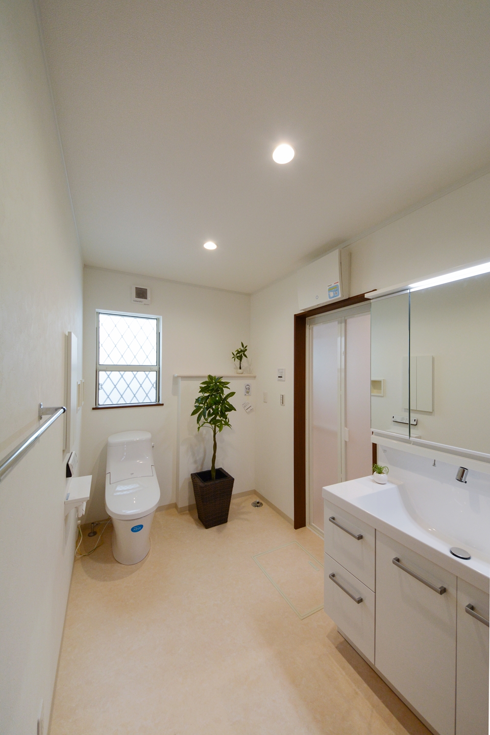白いレンガ調の優しい風合いの外観。室内はハイスタッド仕様で天井が高く広々とした空間に。出入り口は、ほぼすべて引き戸にし、車いすが通りやすい間取りです。車いすで広々と快適に暮らす、優しいバリアフリーの平屋建て住宅が完成しました。