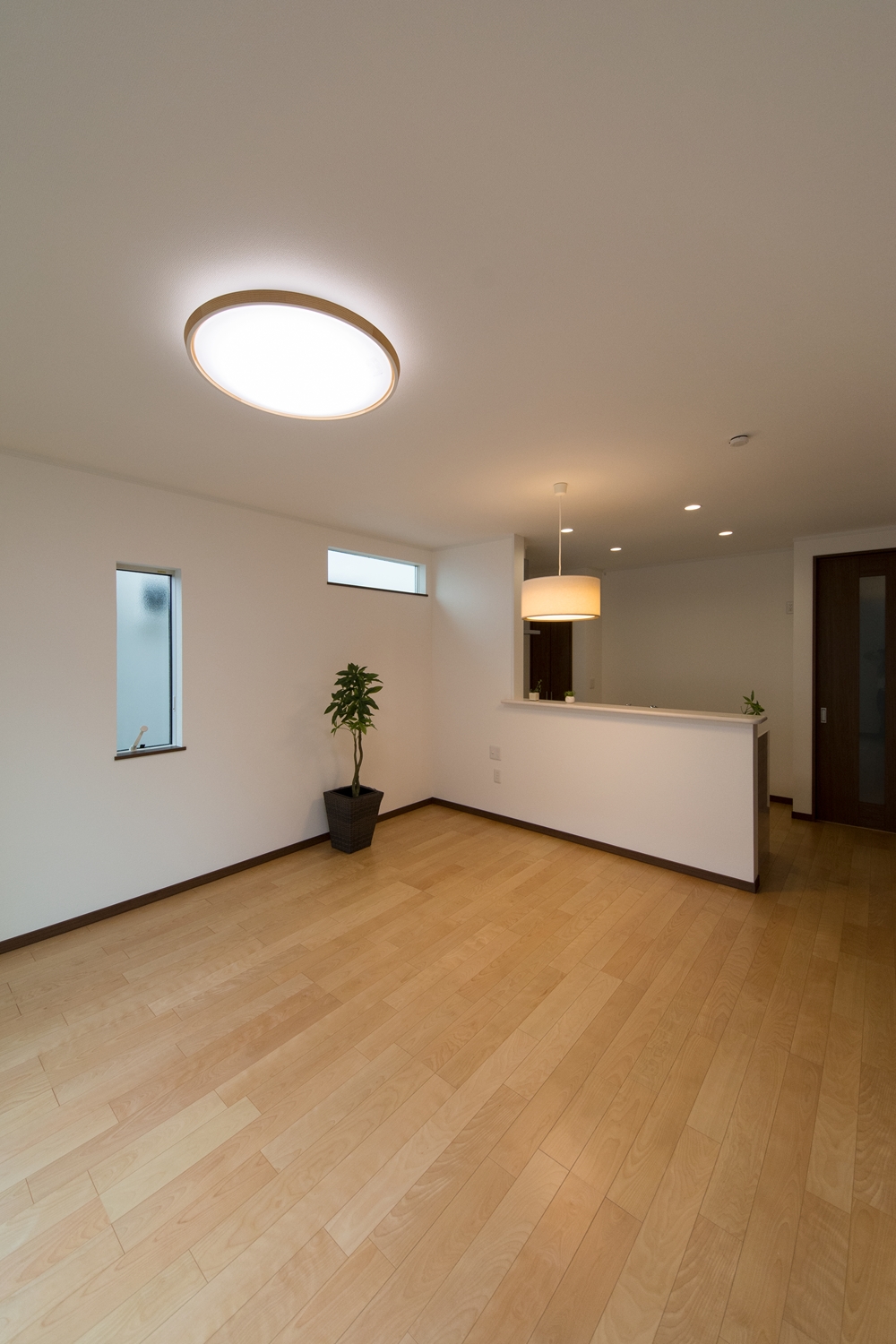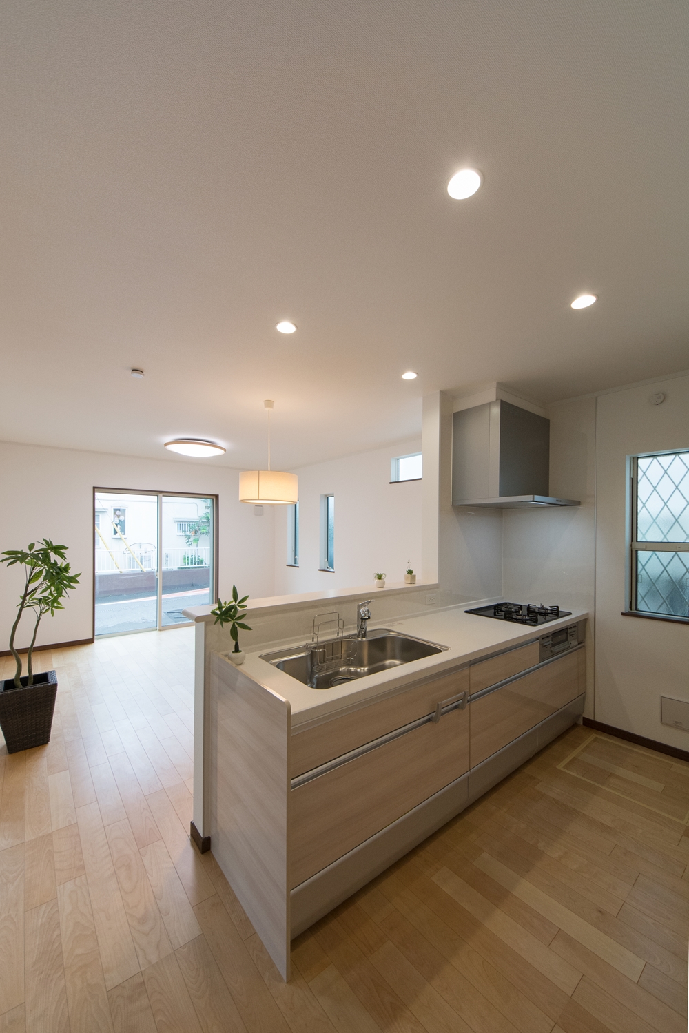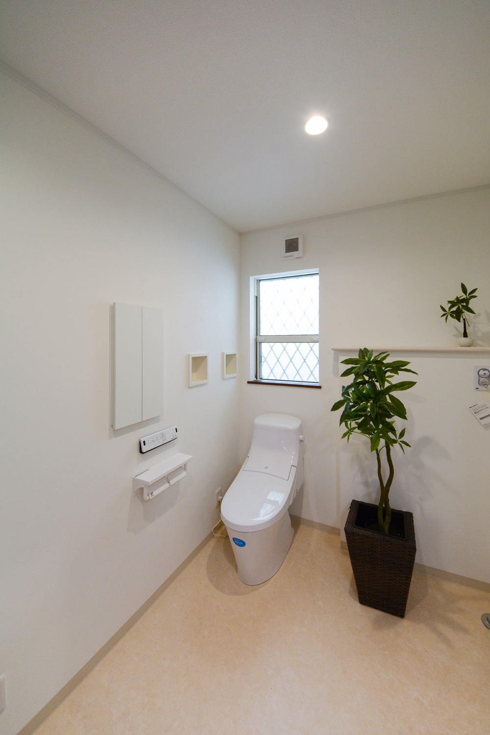 白いレンガ調の優しい風合いの外観。室内はハイスタッド仕様で天井が高く広々とした空間に。出入り口は、ほぼすべて引き戸にし、車いすが通りやすい間取りです。車いすで広々と快適に暮らす、優しいバリアフリーの平屋建て住宅が完成しました。