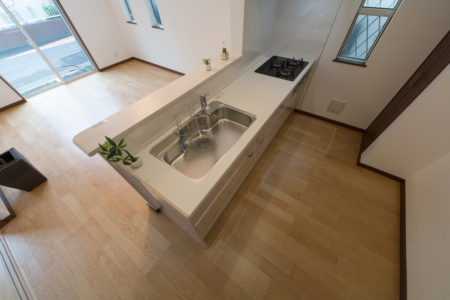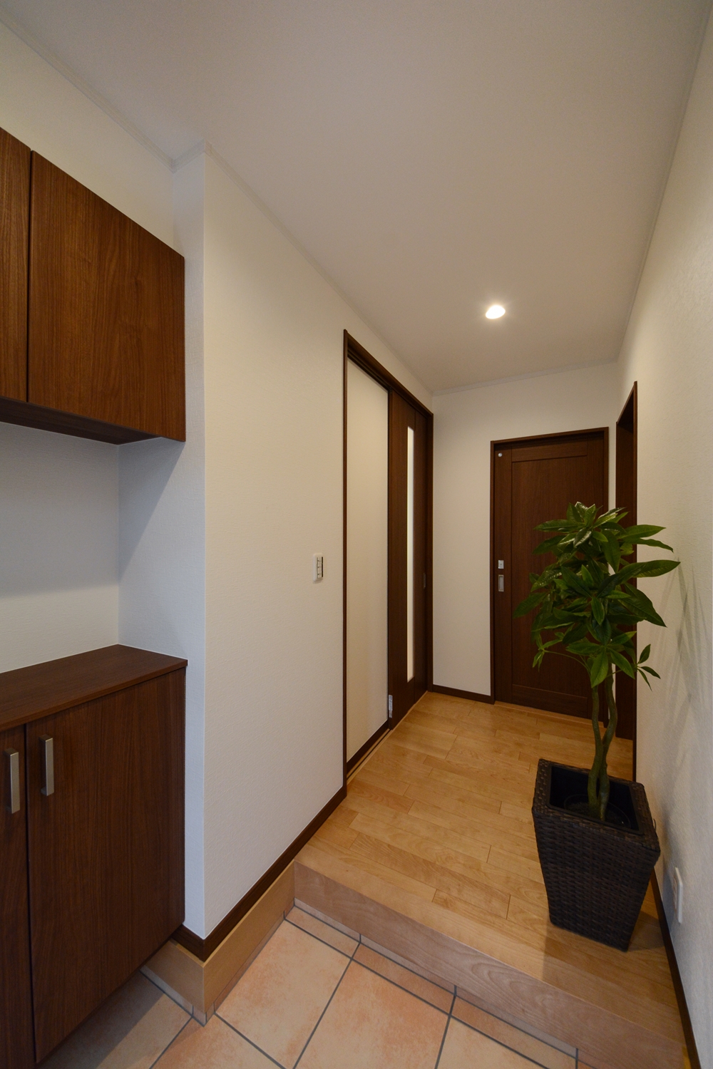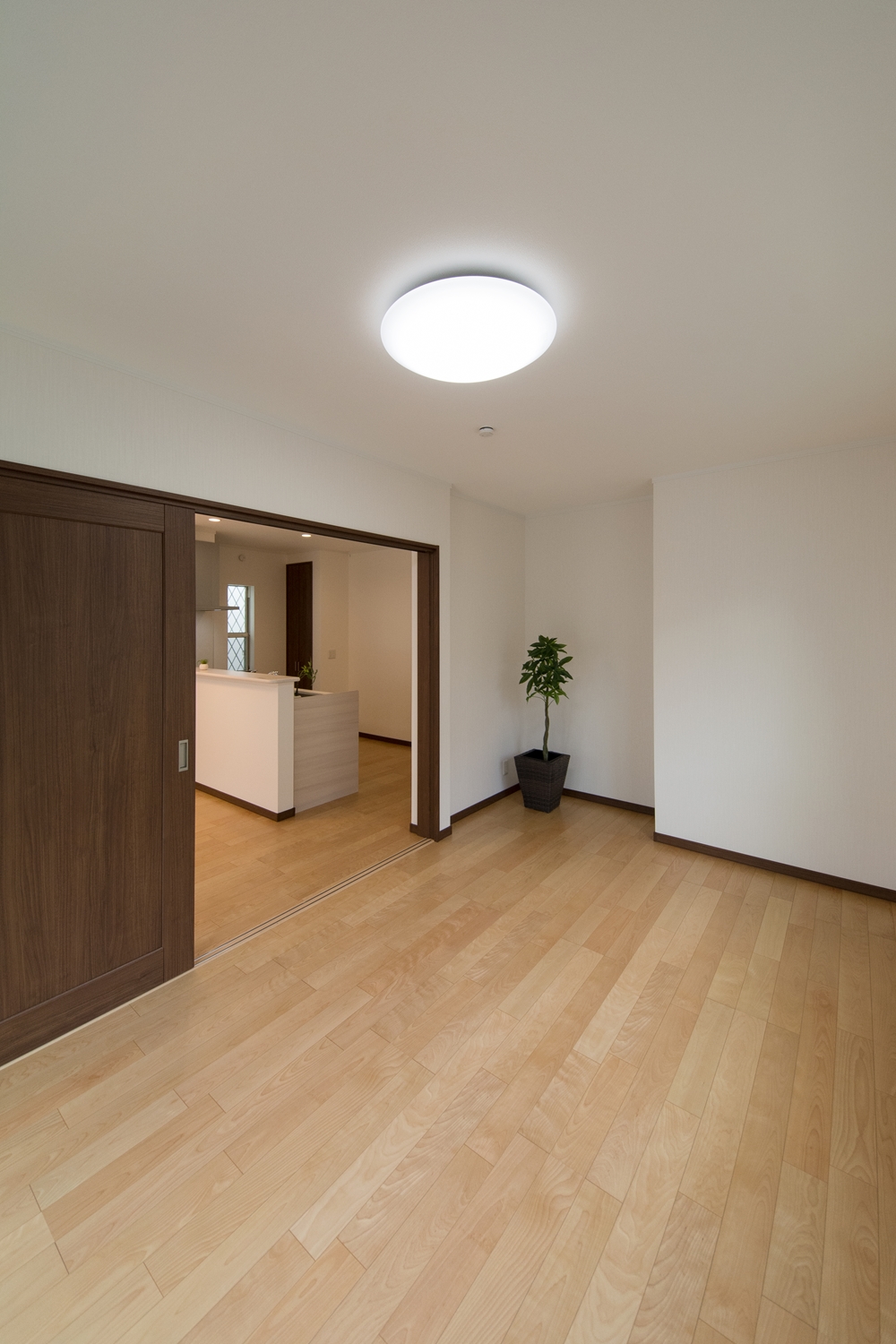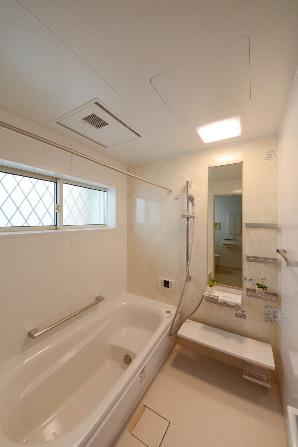 白いレンガ調の優しい風合いの外観。室内はハイスタッド仕様で天井が高く広々とした空間に。出入り口は、ほぼすべて引き戸にし、車いすが通りやすい間取りです。車いすで広々と快適に暮らす、優しいバリアフリーの平屋建て住宅が完成しました。