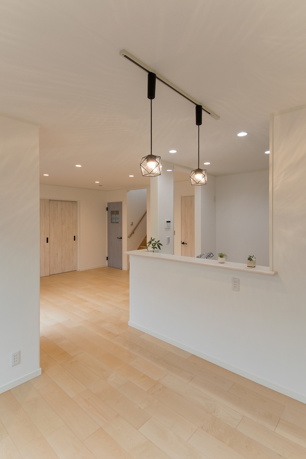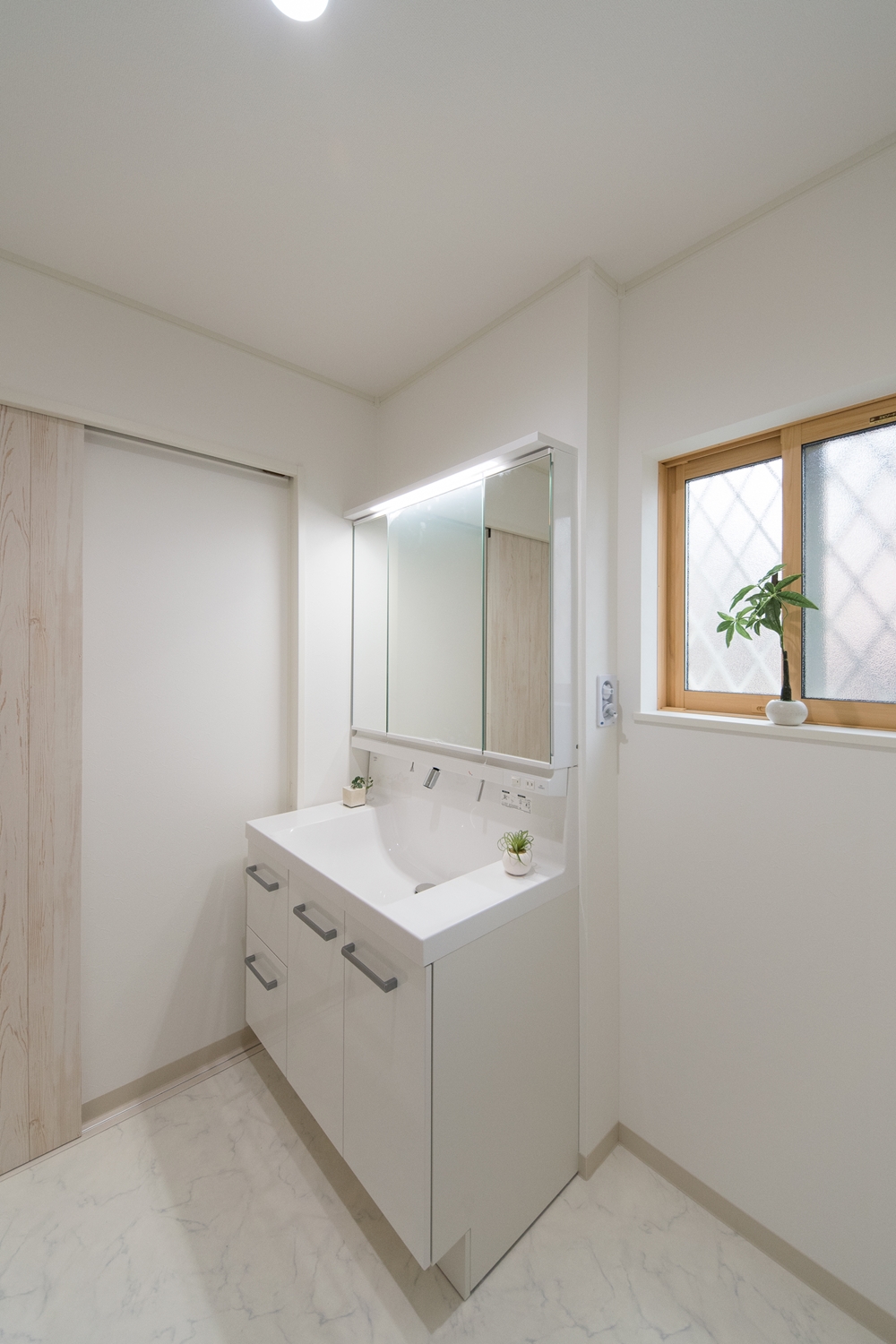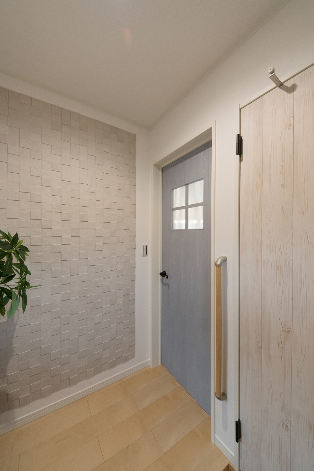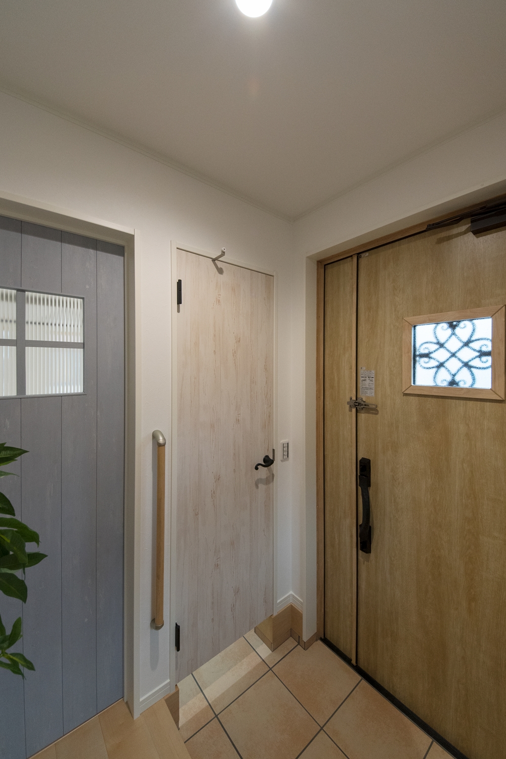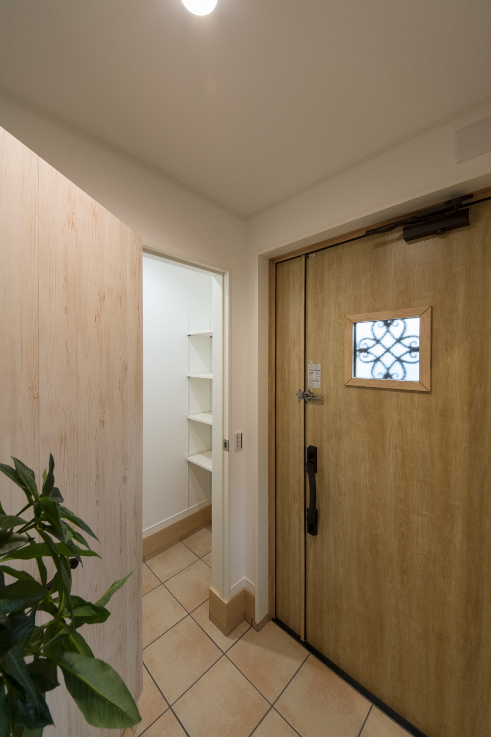 白いレンガ調の優しい風合いの外観。玄関に施した可愛らしい花のオーナメントとアンティーク調のポーチライトが温かみをプラスします。室内も優しい印象の色を使った、ナチュラルな空間となりました。