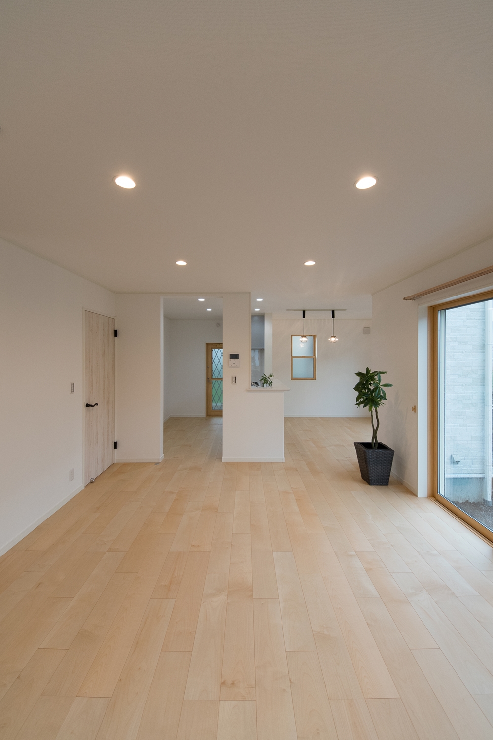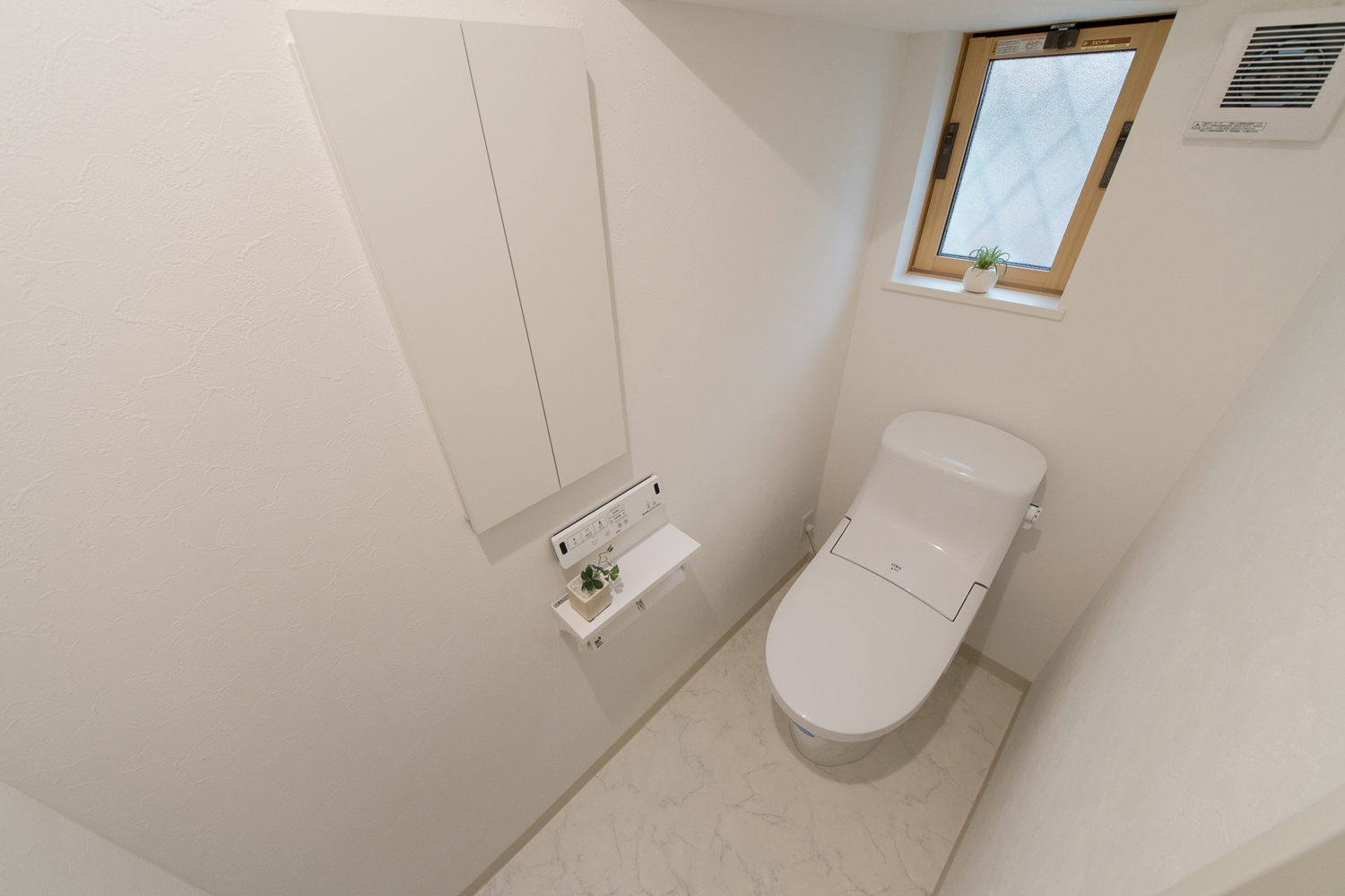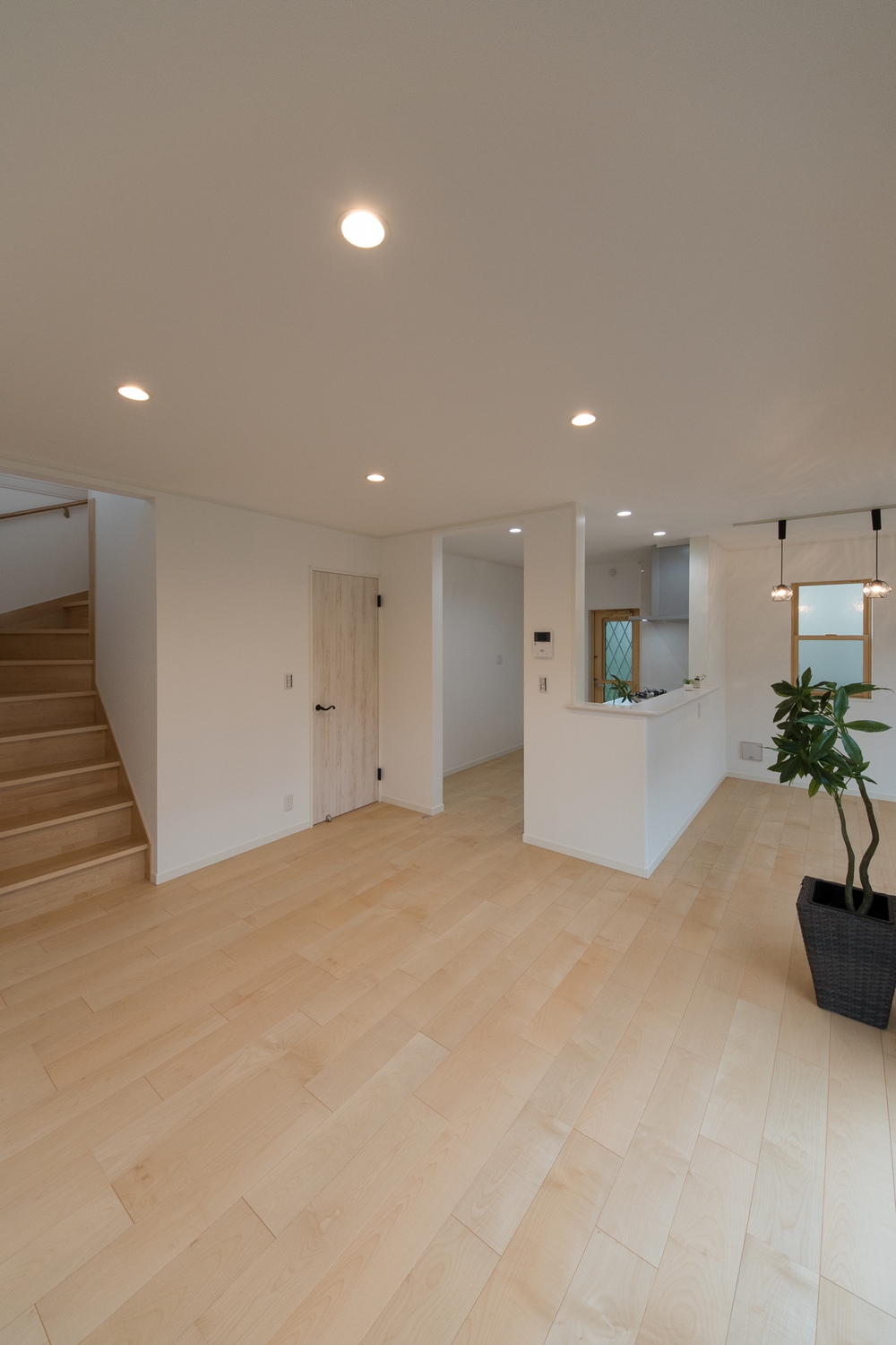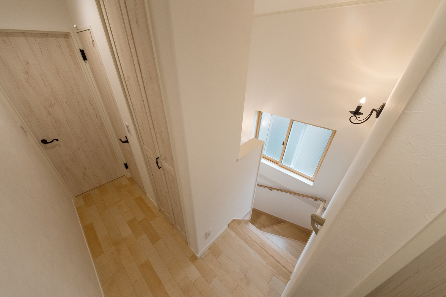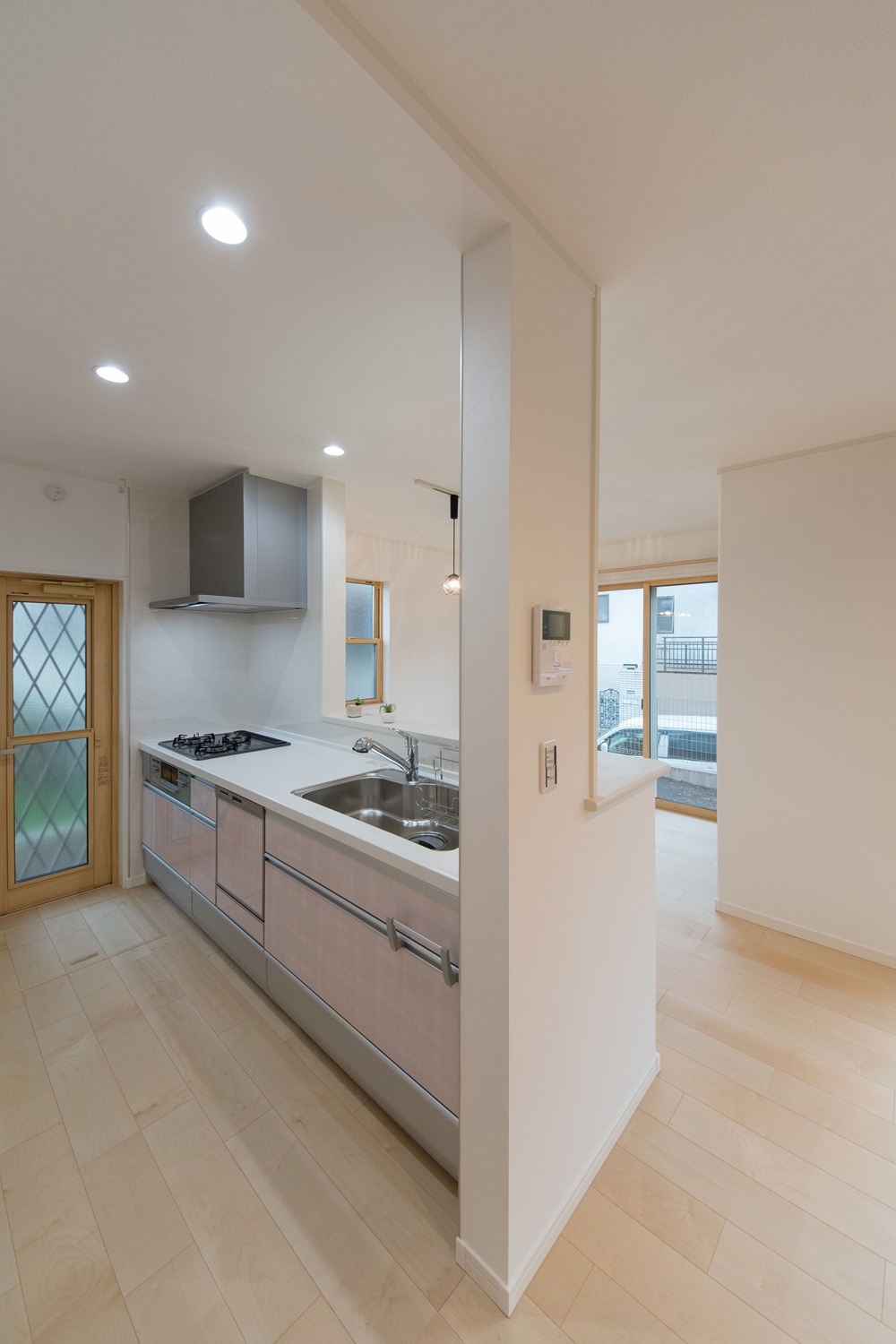 白いレンガ調の優しい風合いの外観。玄関に施した可愛らしい花のオーナメントとアンティーク調のポーチライトが温かみをプラスします。室内も優しい印象の色を使った、ナチュラルな空間となりました。