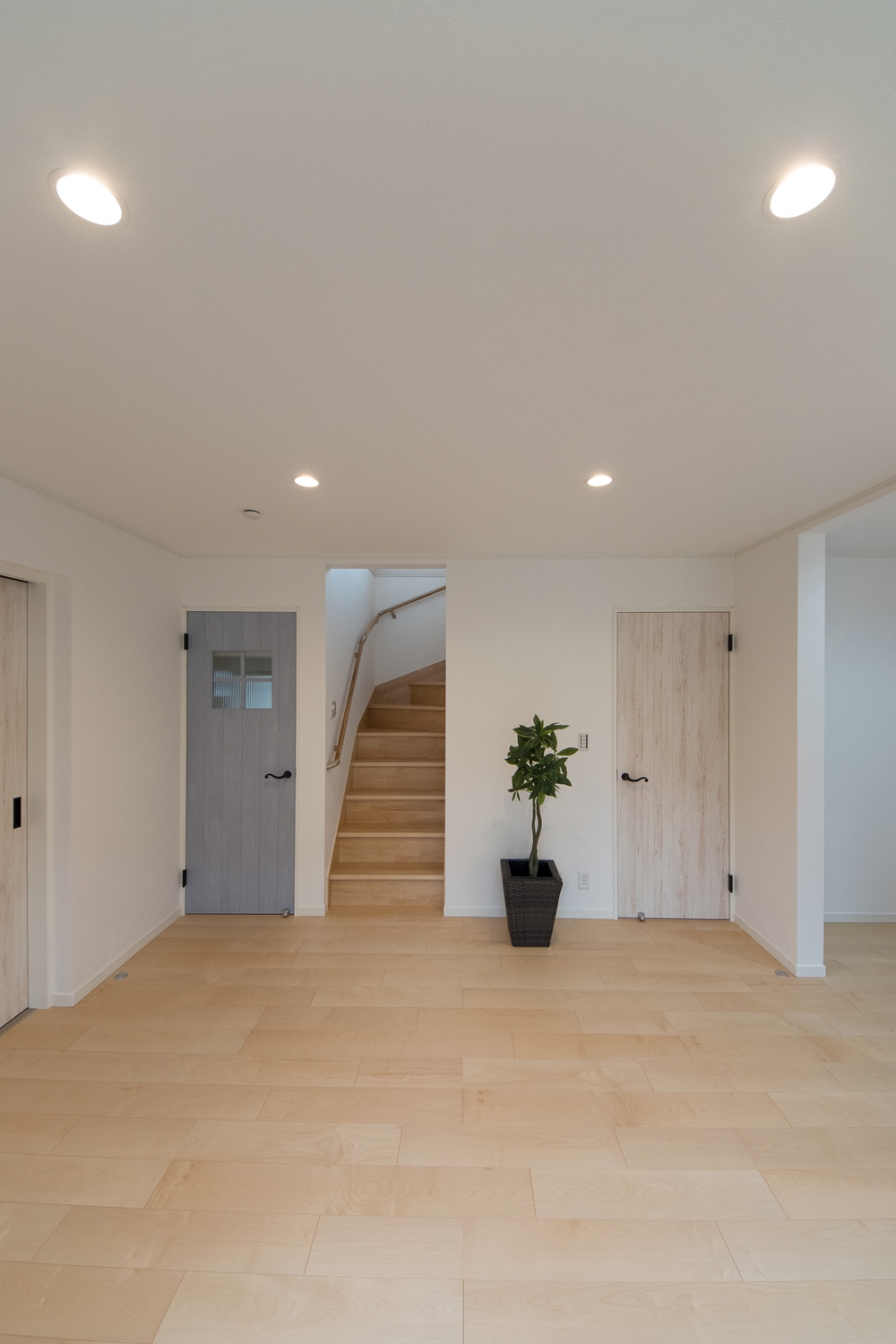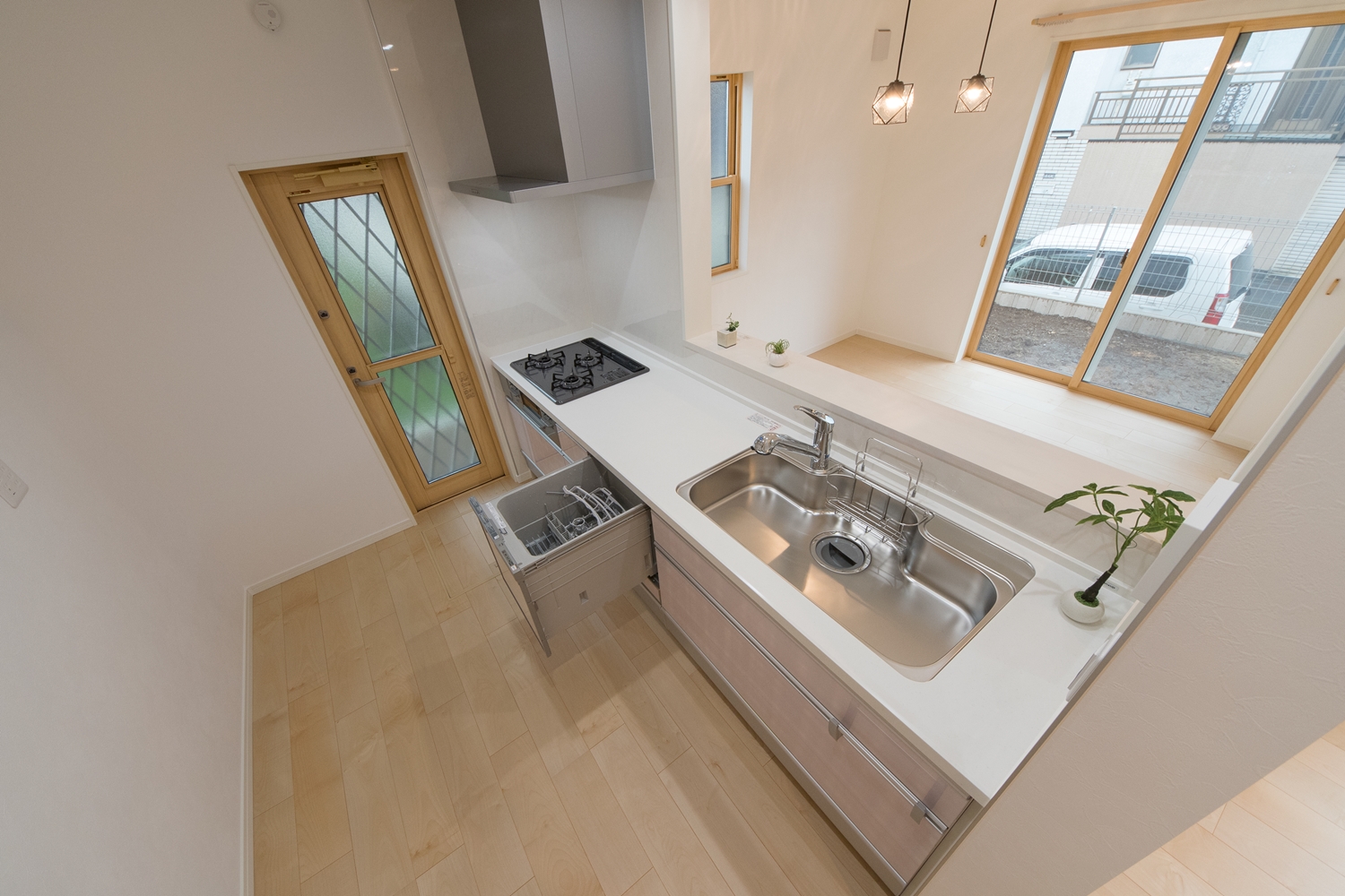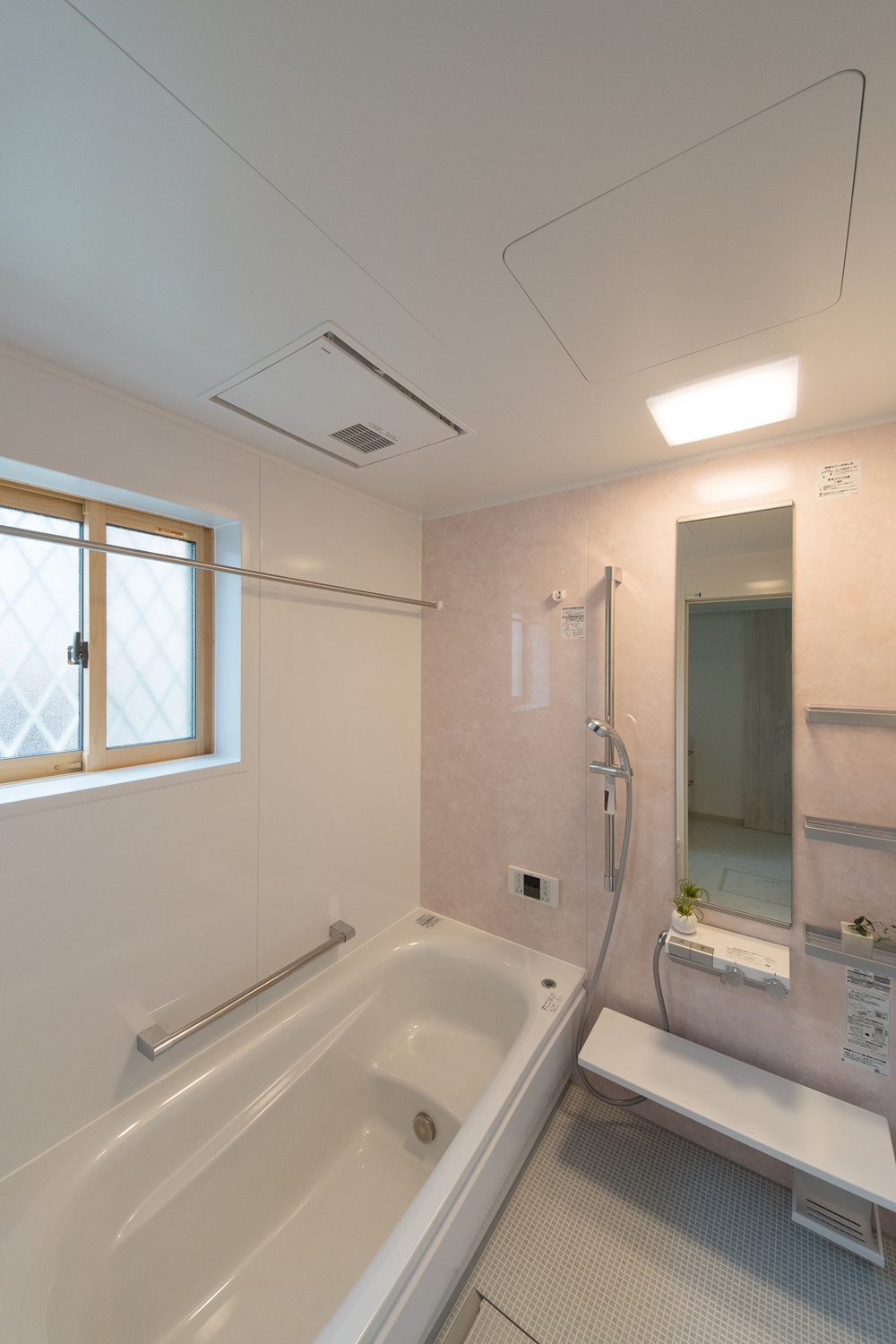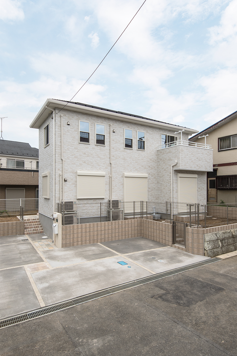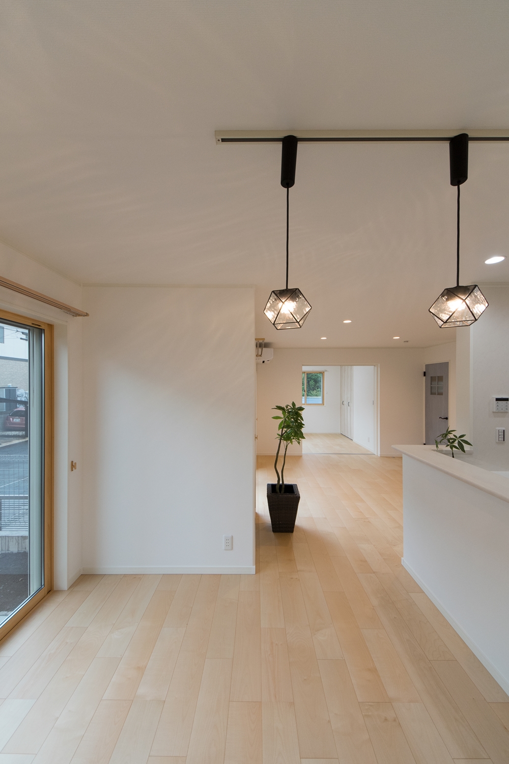 白いレンガ調の優しい風合いの外観。玄関に施した可愛らしい花のオーナメントとアンティーク調のポーチライトが温かみをプラスします。室内も優しい印象の色を使った、ナチュラルな空間となりました。