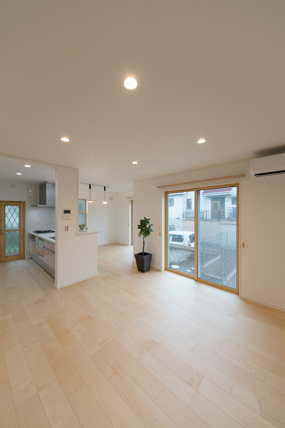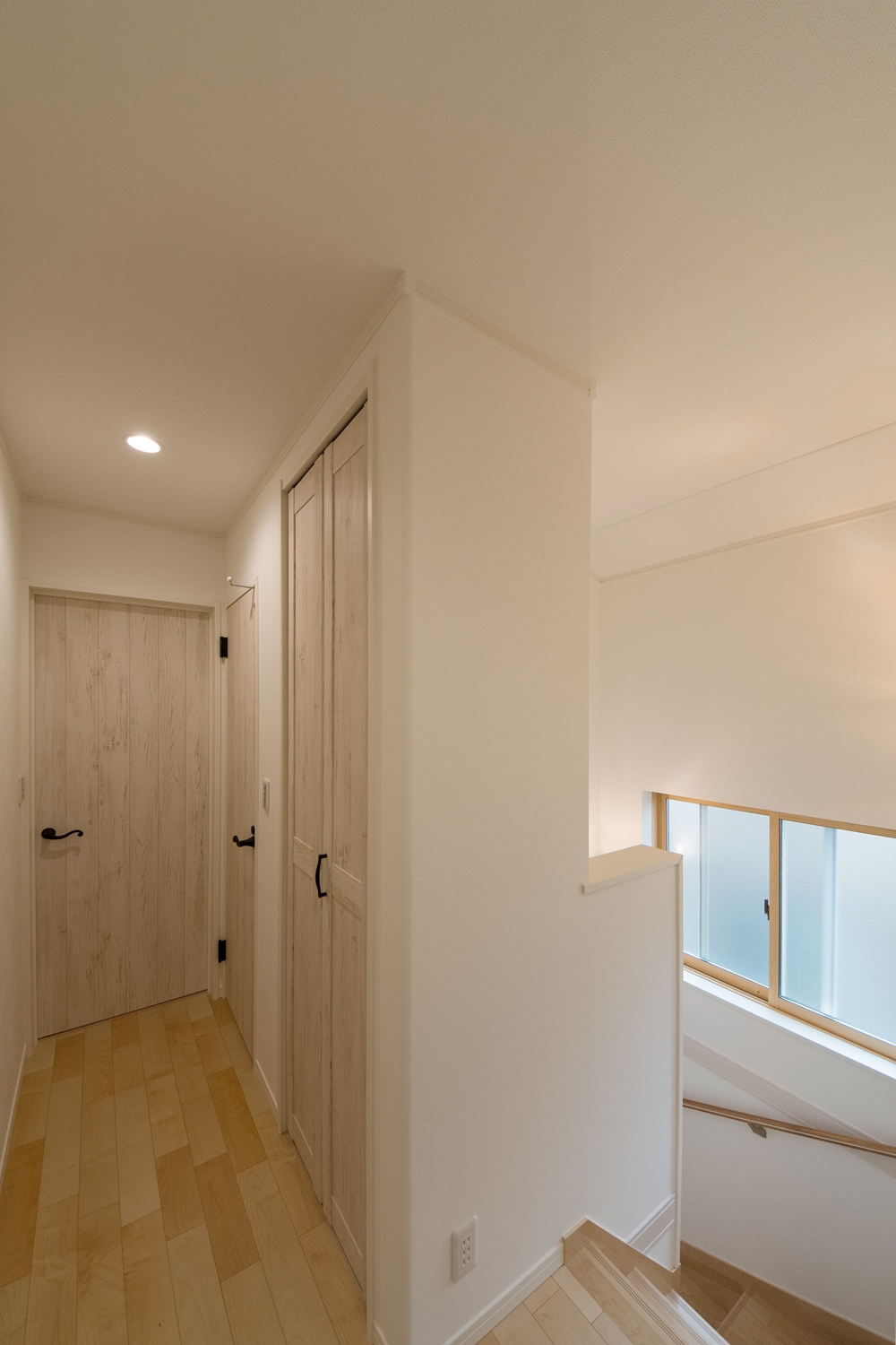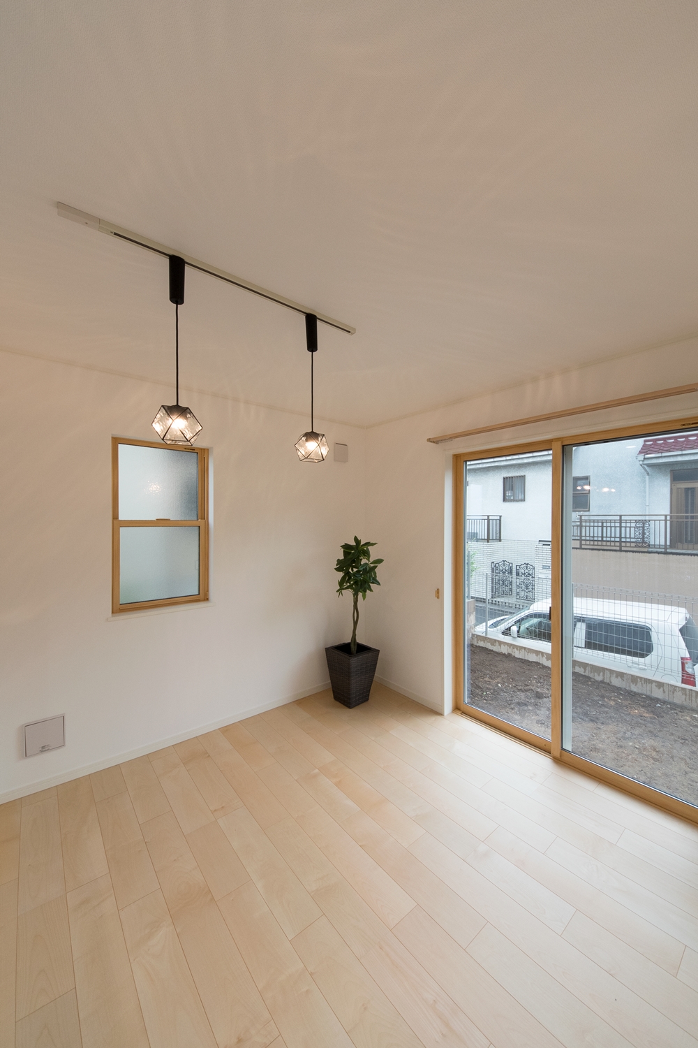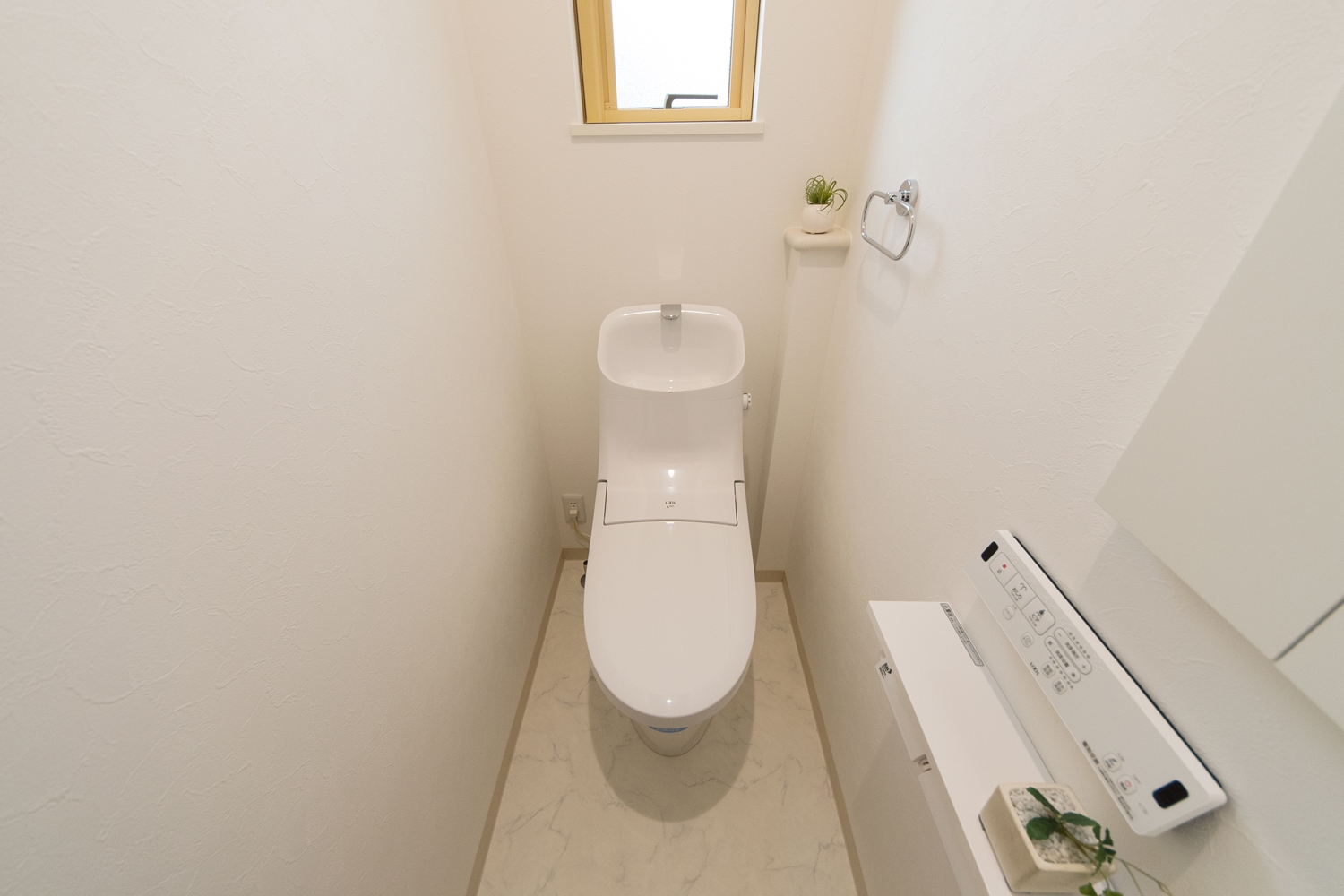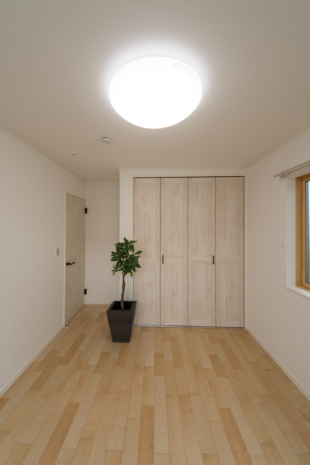 白いレンガ調の優しい風合いの外観。玄関に施した可愛らしい花のオーナメントとアンティーク調のポーチライトが温かみをプラスします。室内も優しい印象の色を使った、ナチュラルな空間となりました。