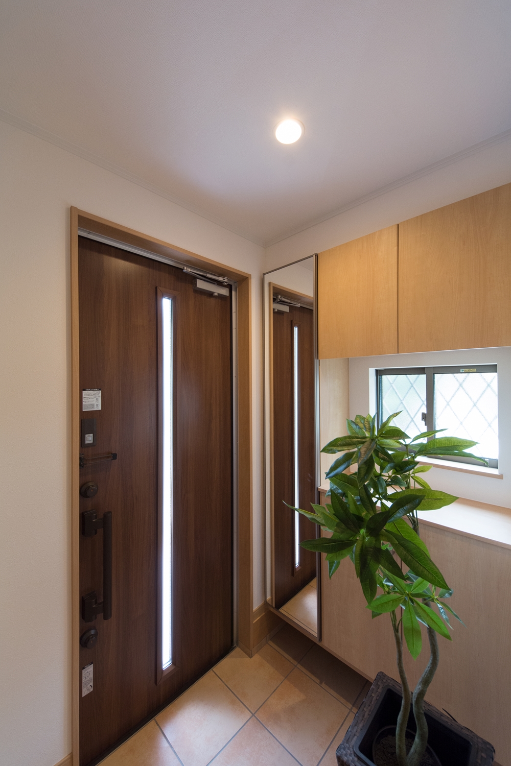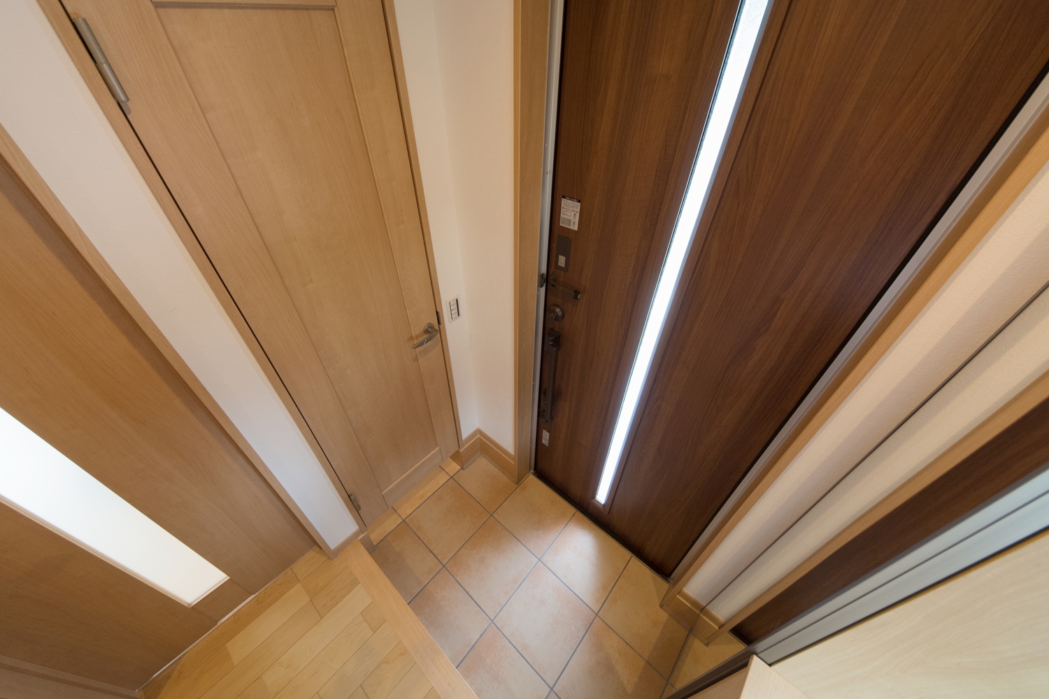 木目調の玄関扉とベージュのテラコッタ調タイルがナチュラルな雰囲気を演出。