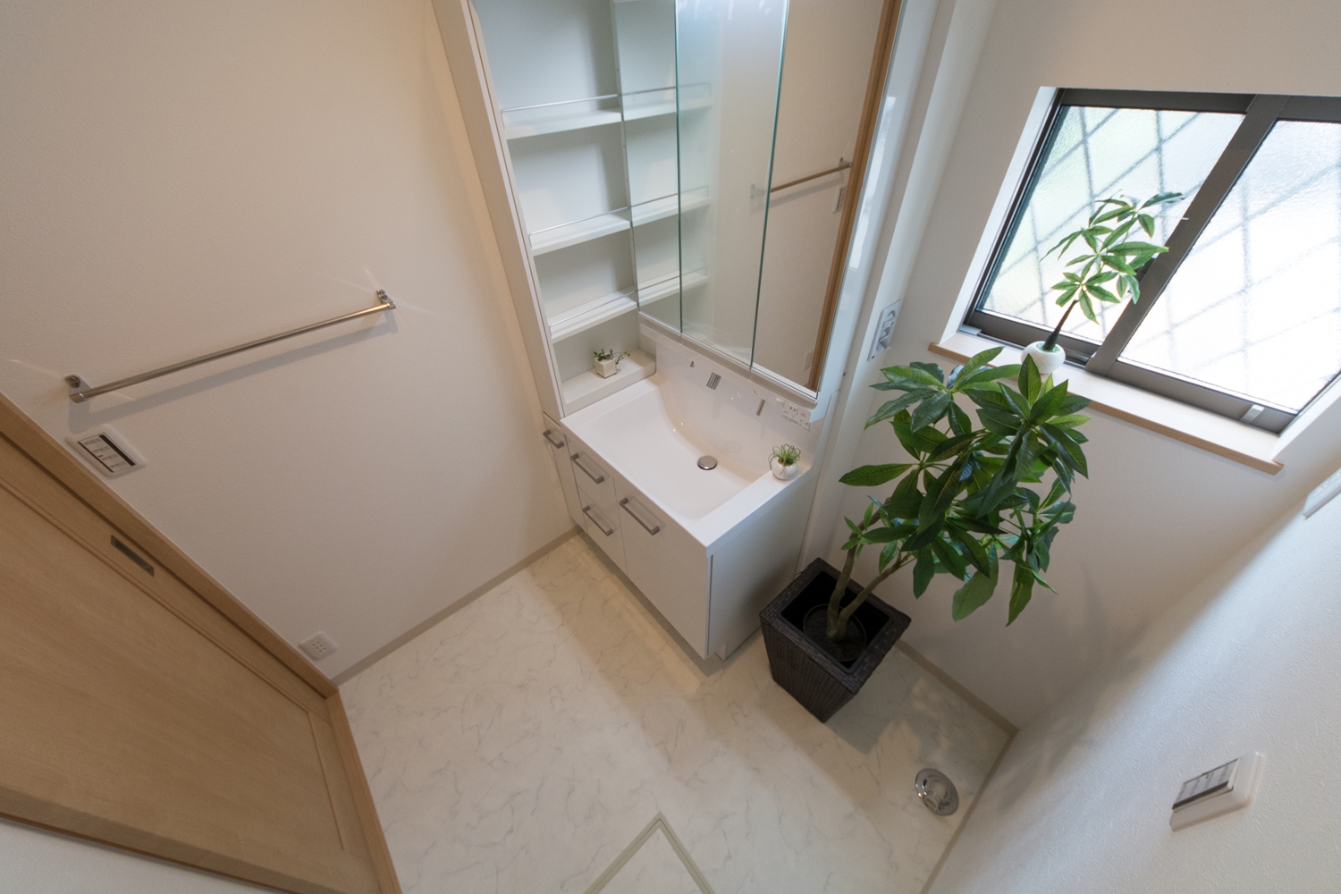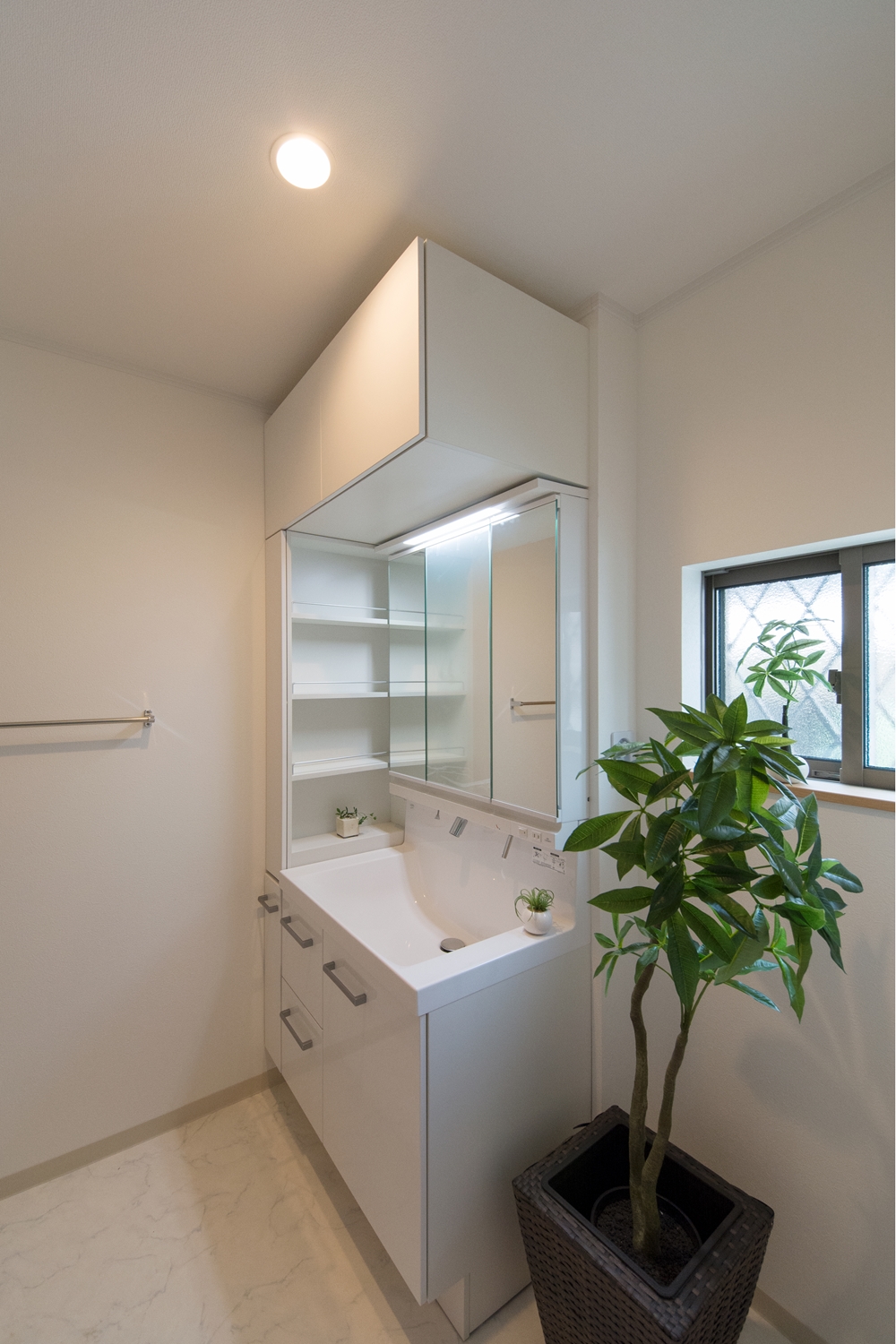 上と横にもキャビネット設置した、たっぷり収納の洗面化粧台。