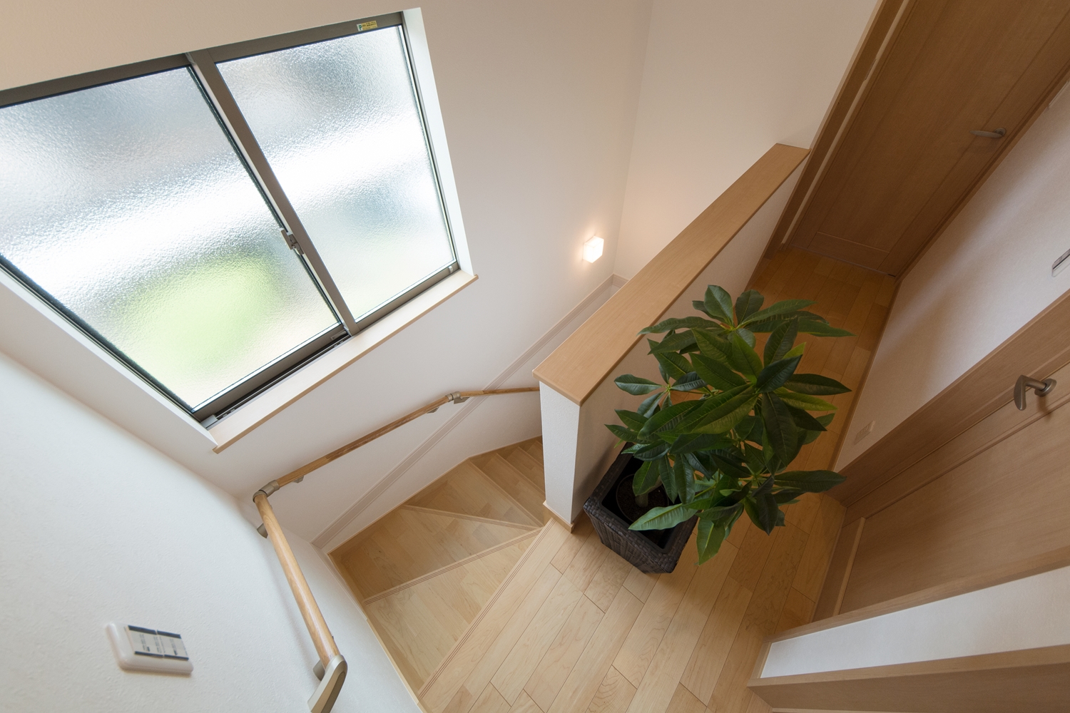 大きな窓を設置し、通風も採光も良く開放感ある階段に。